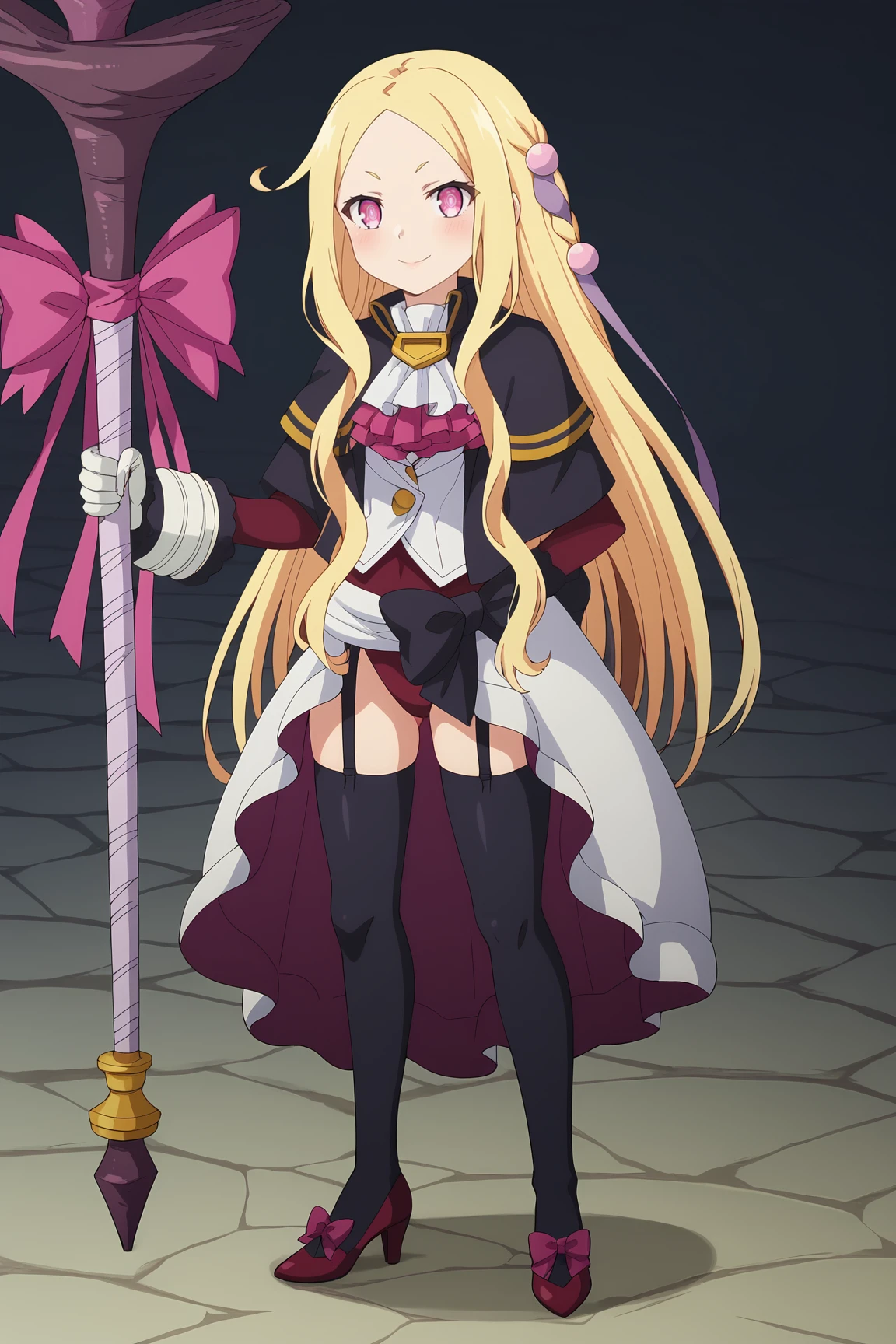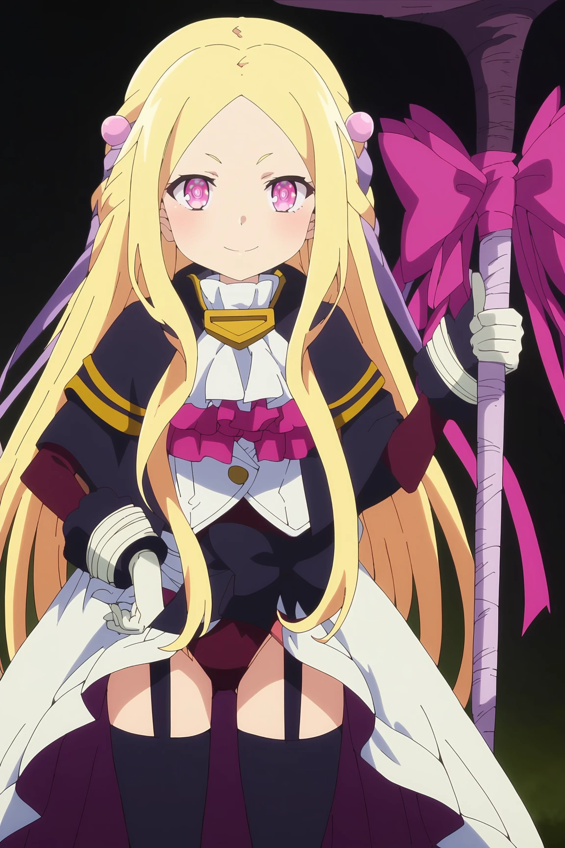 1girl, roux christasse, mahoutsukai reimeiki, pink eyes, white pupils, blonde hair, outfit 1 (her default clothes):