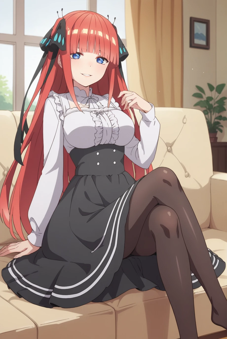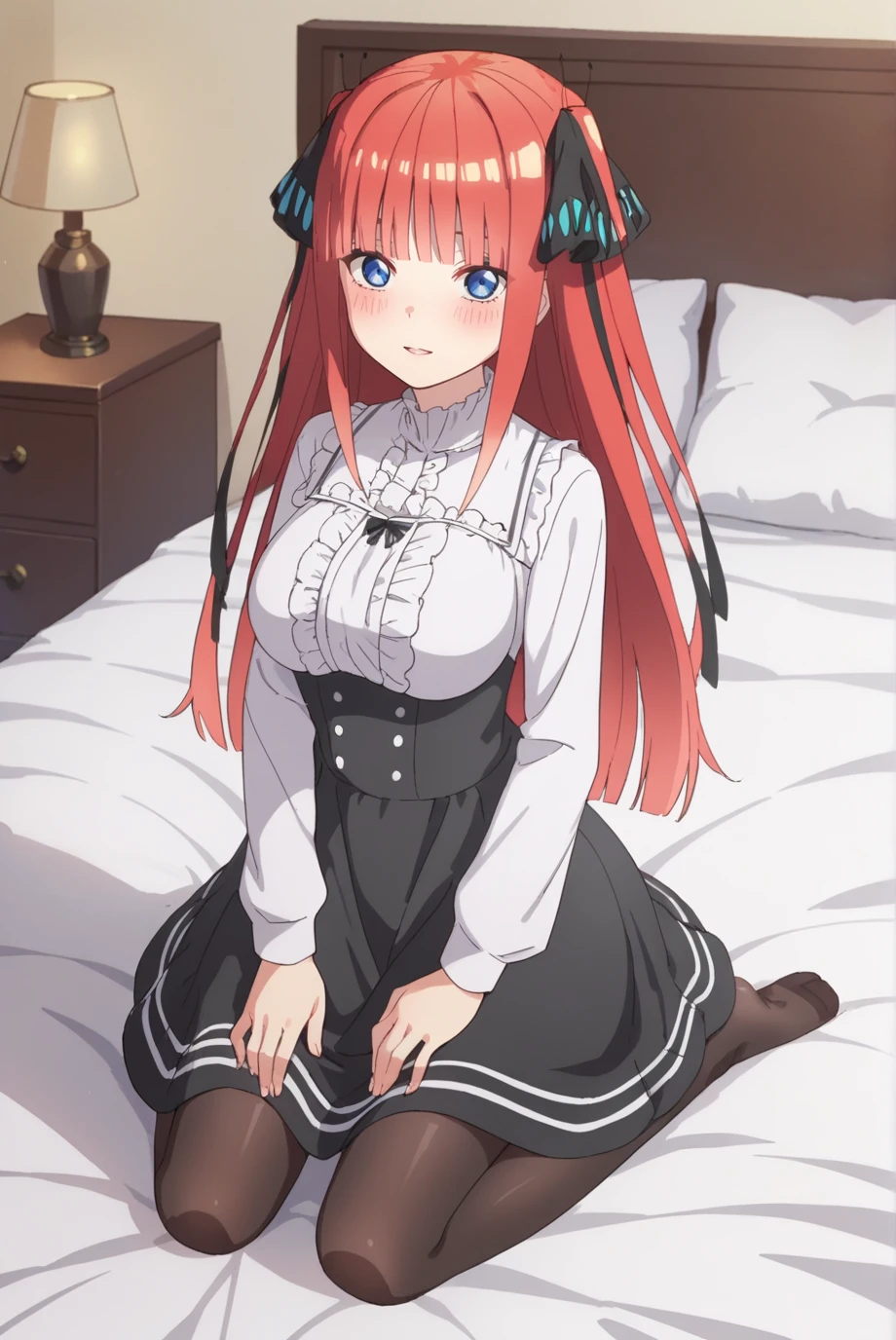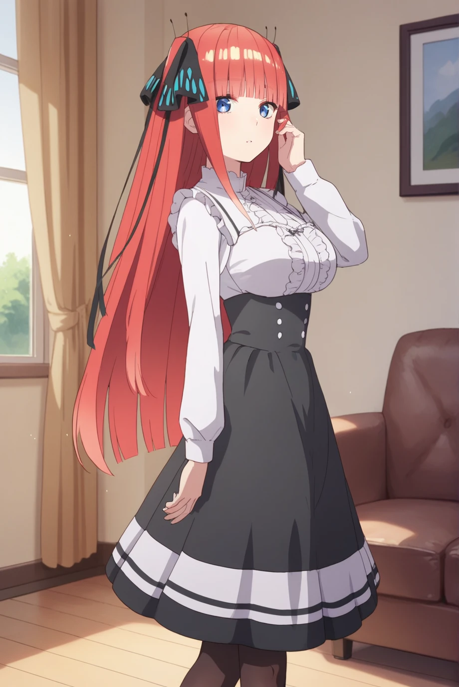 <lora:NakanoNino-IL-v3-08:0.9>, ChopioNino, very long hair, red hair, shiny hair, blunt bangs, black ribbon, hair ribbon, blue eyes, looking at viewer,