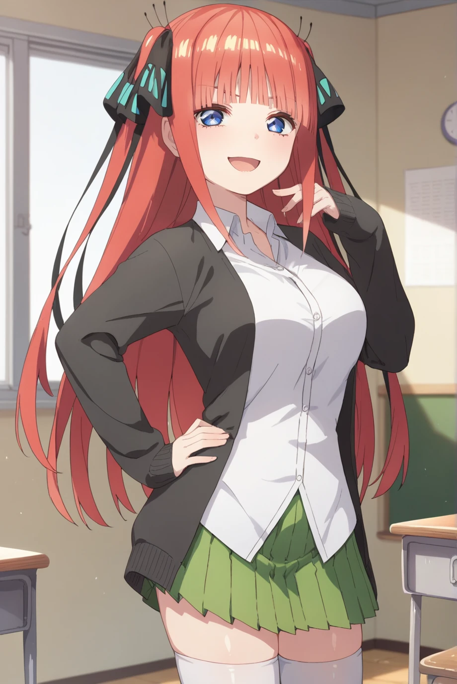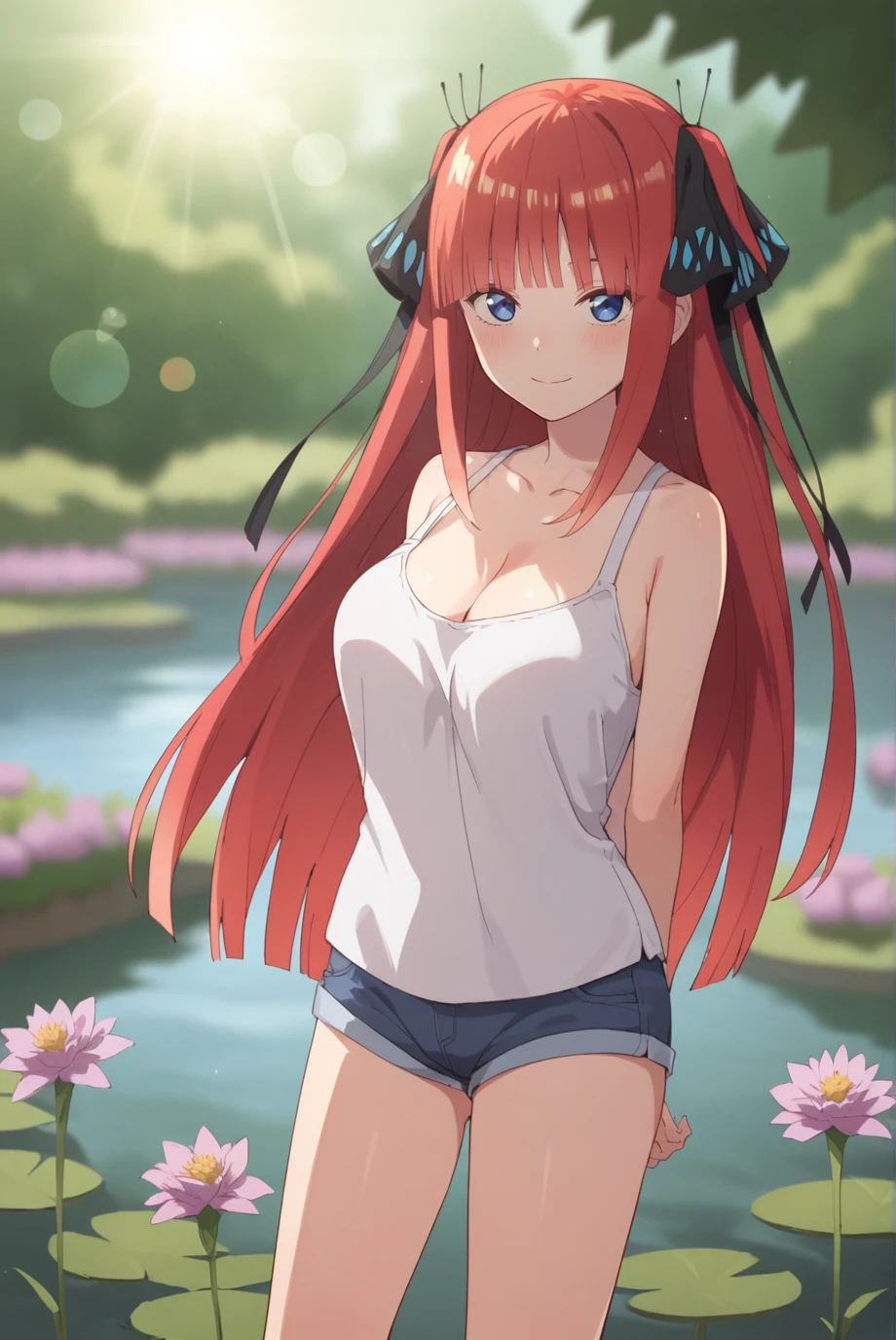 <lora:NakanoNinoXL-v1-07:0.7>, ChopioNino, long hair, red hair, shiny hair, blunt bangs, black ribbon, hair ribbon, blue eyes, looking at viewer, large breasts,