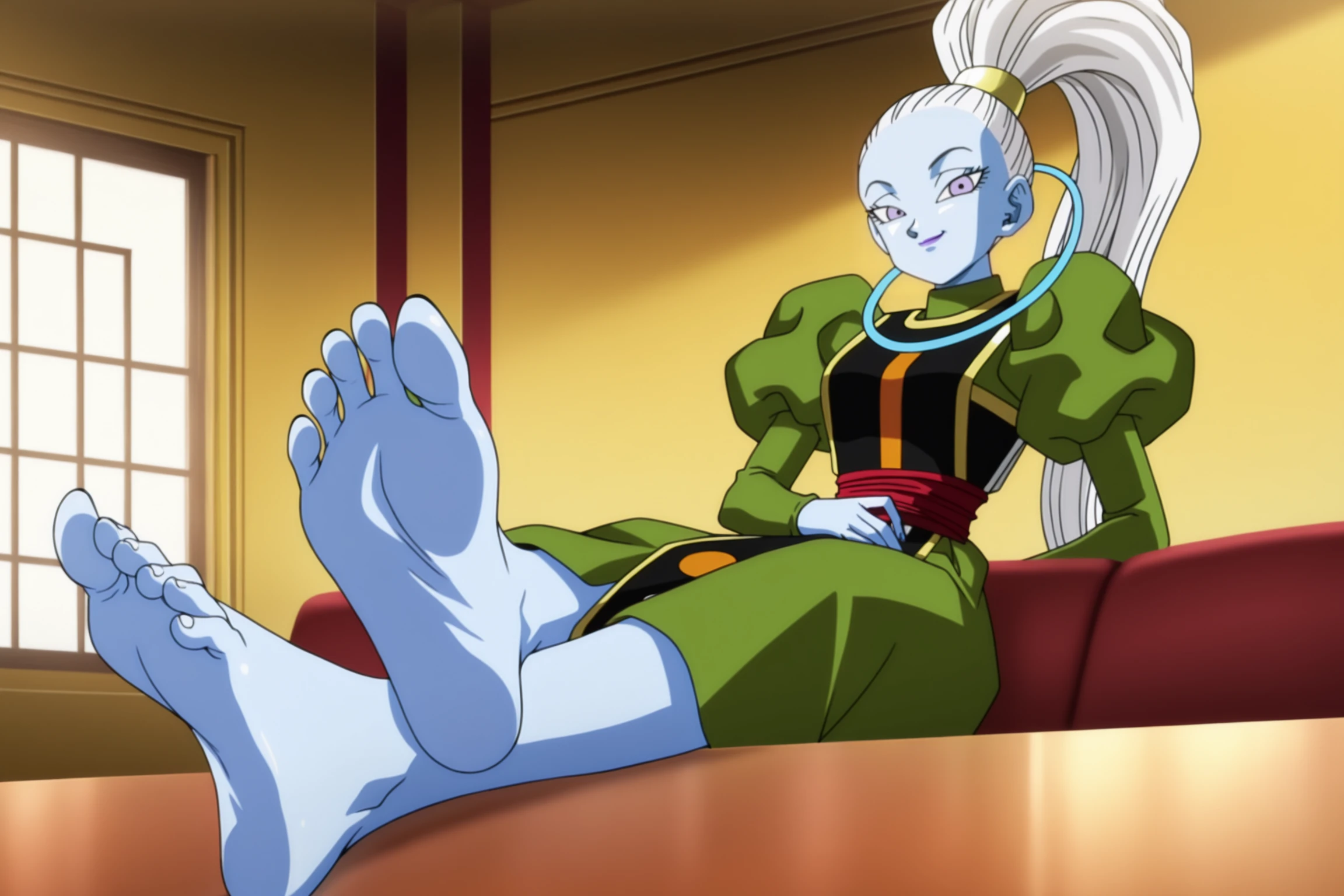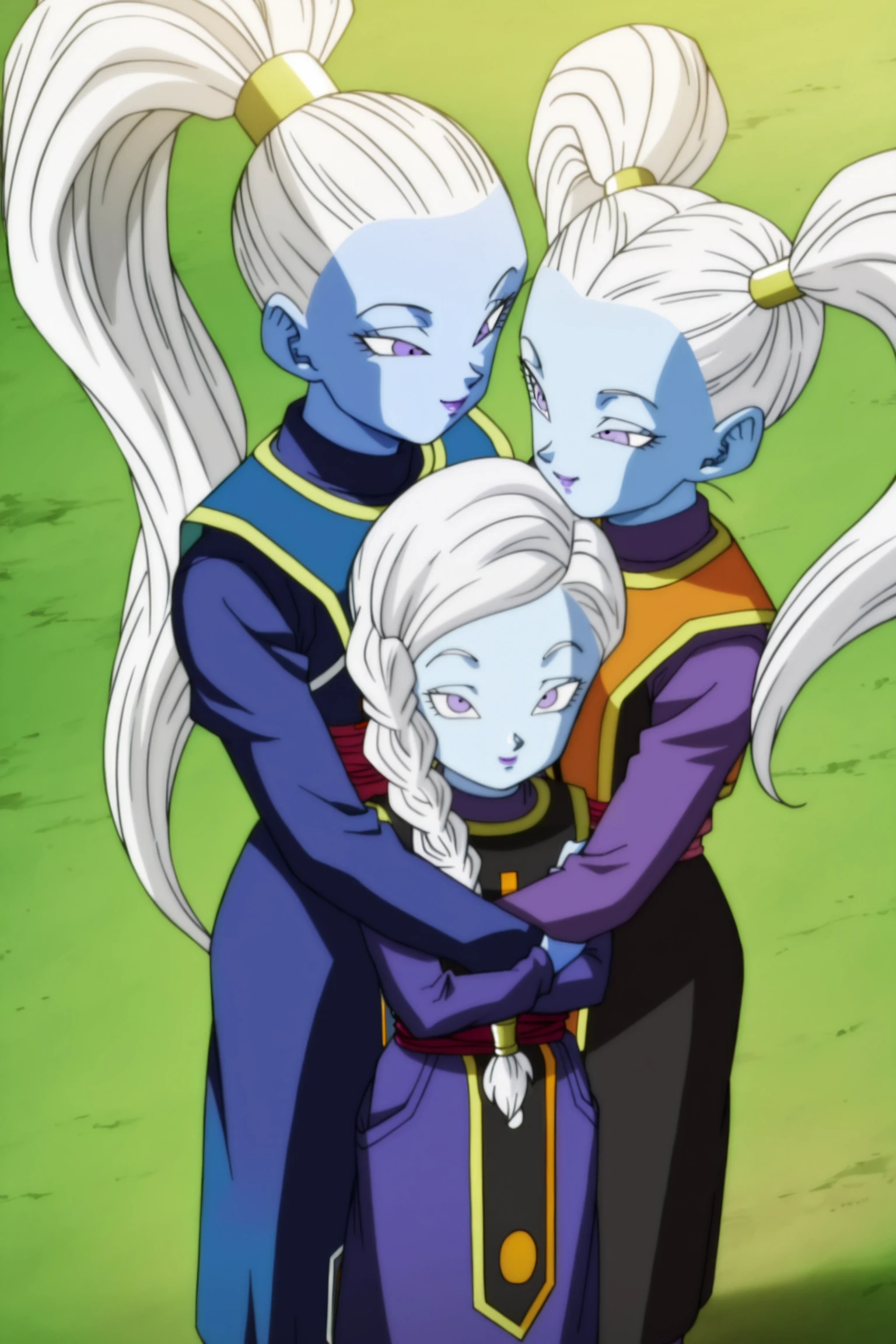 vados \(dragon ball\), hair pulled back, high ponytail, very long hair, purple eyes, white hair, colored skin, blue skin, purple lips