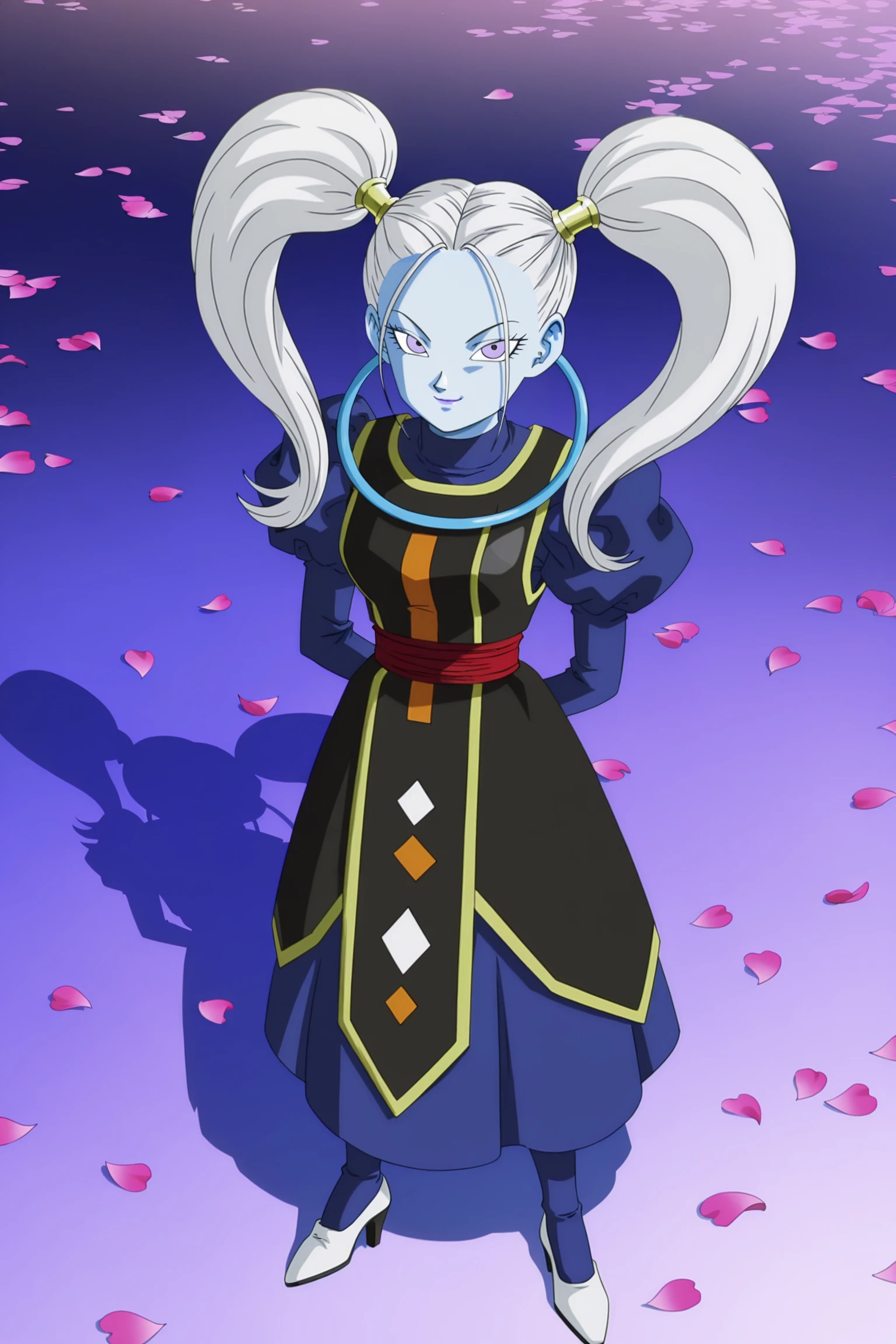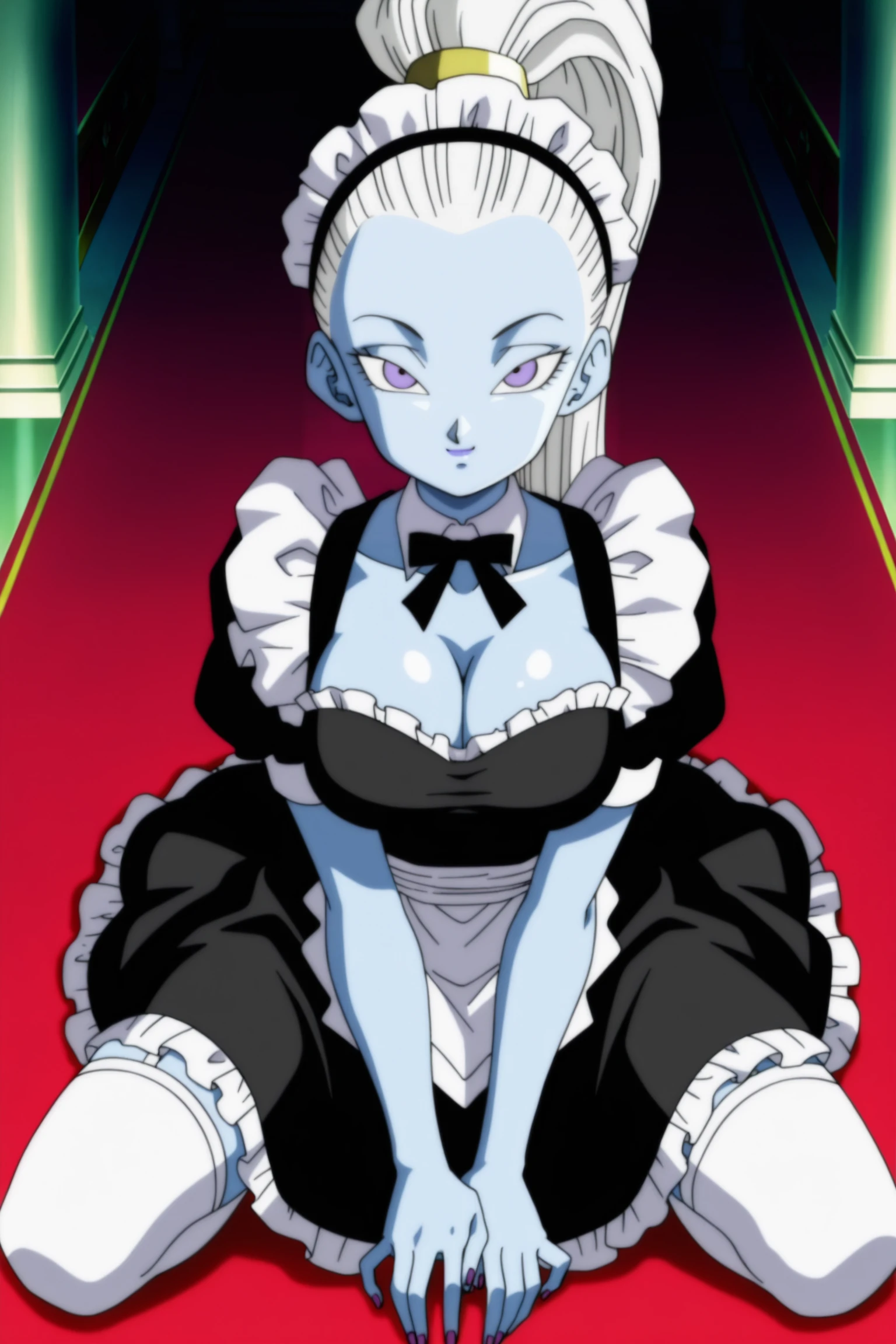 vados \(dragon ball\), hair down, very long hair, purple eyes, white hair, colored skin, blue skin, purple lips