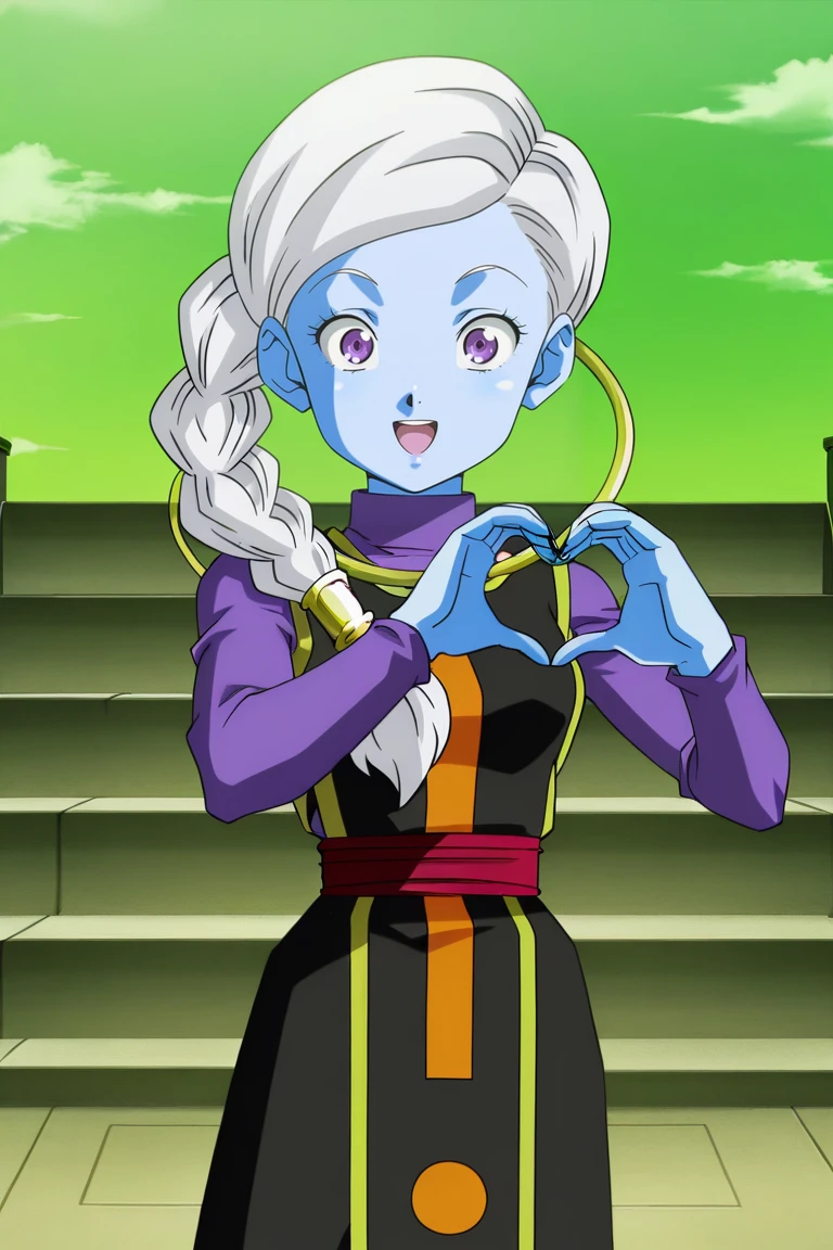 kusu \(dragon ball\), braid, single braid, side ponytail, long hair, purple eyes, white hair, blue skin, colored skin,