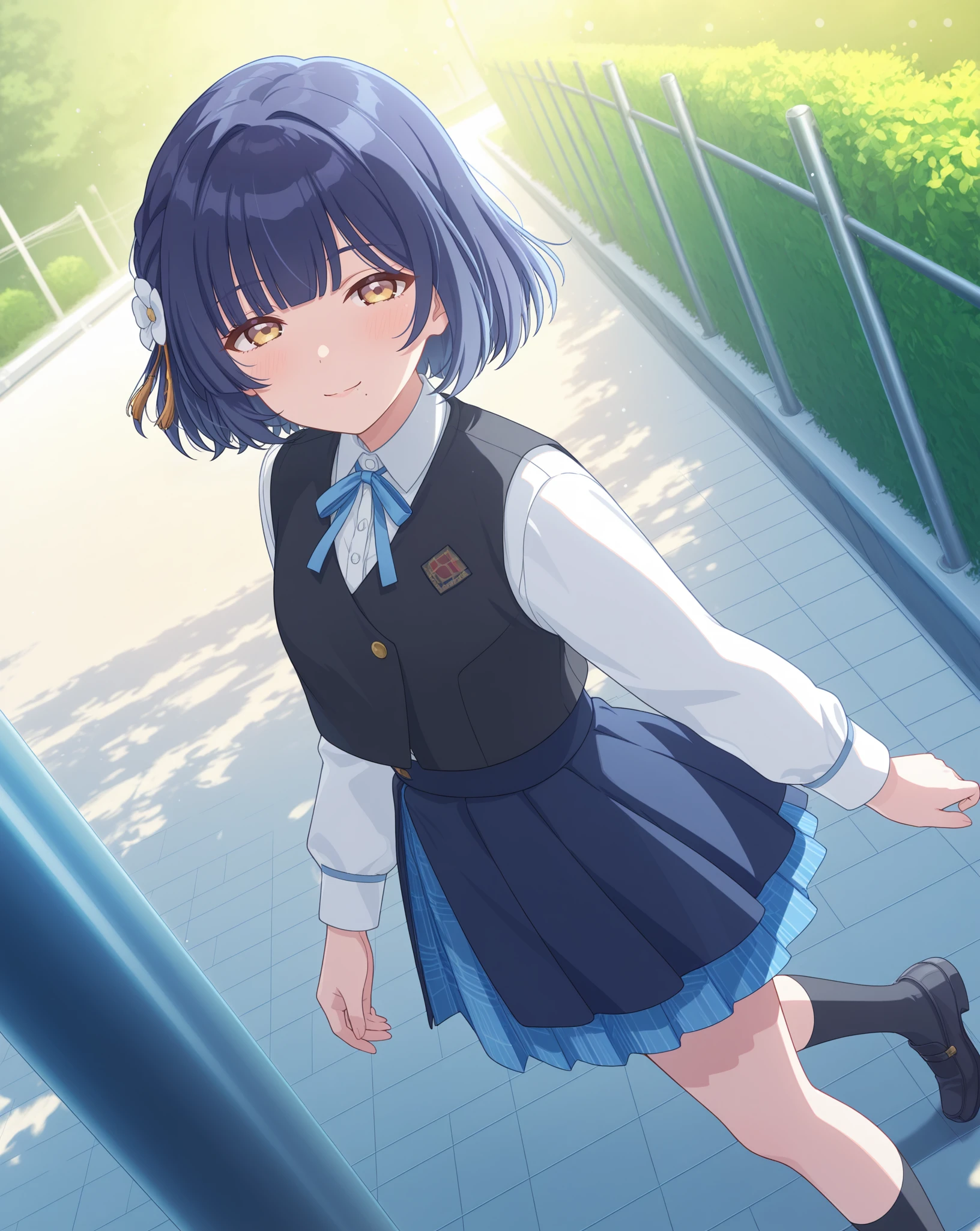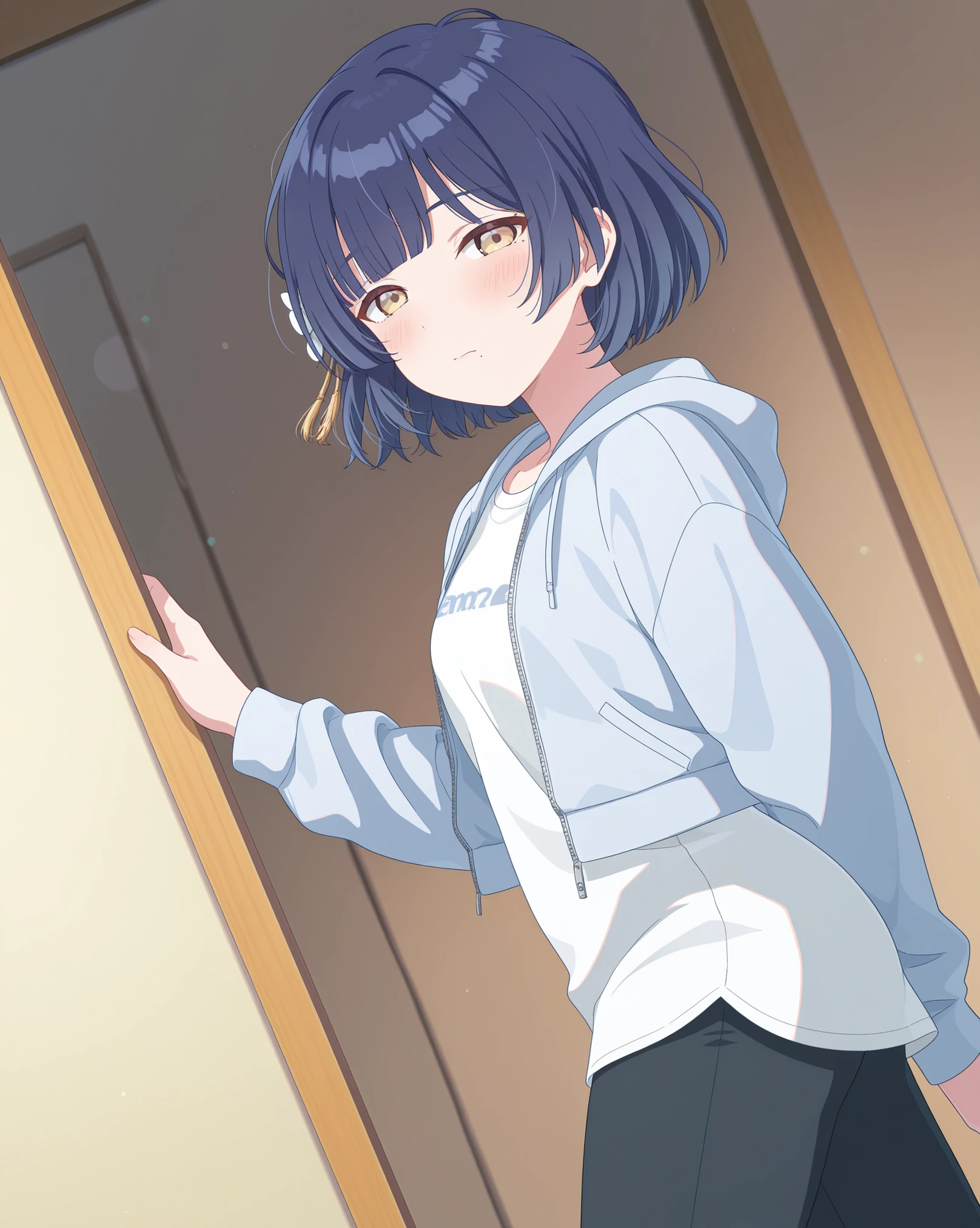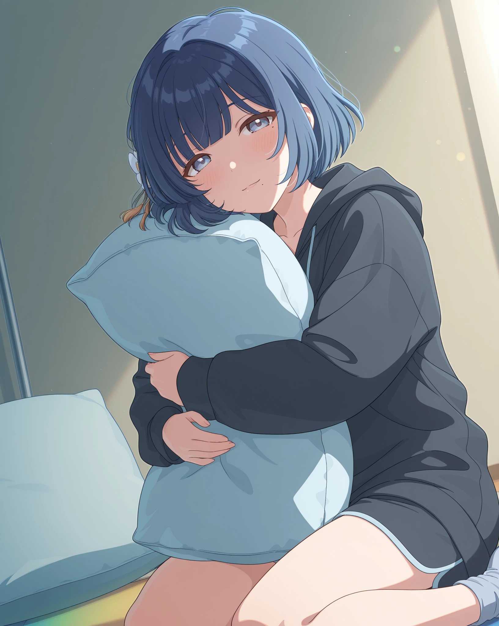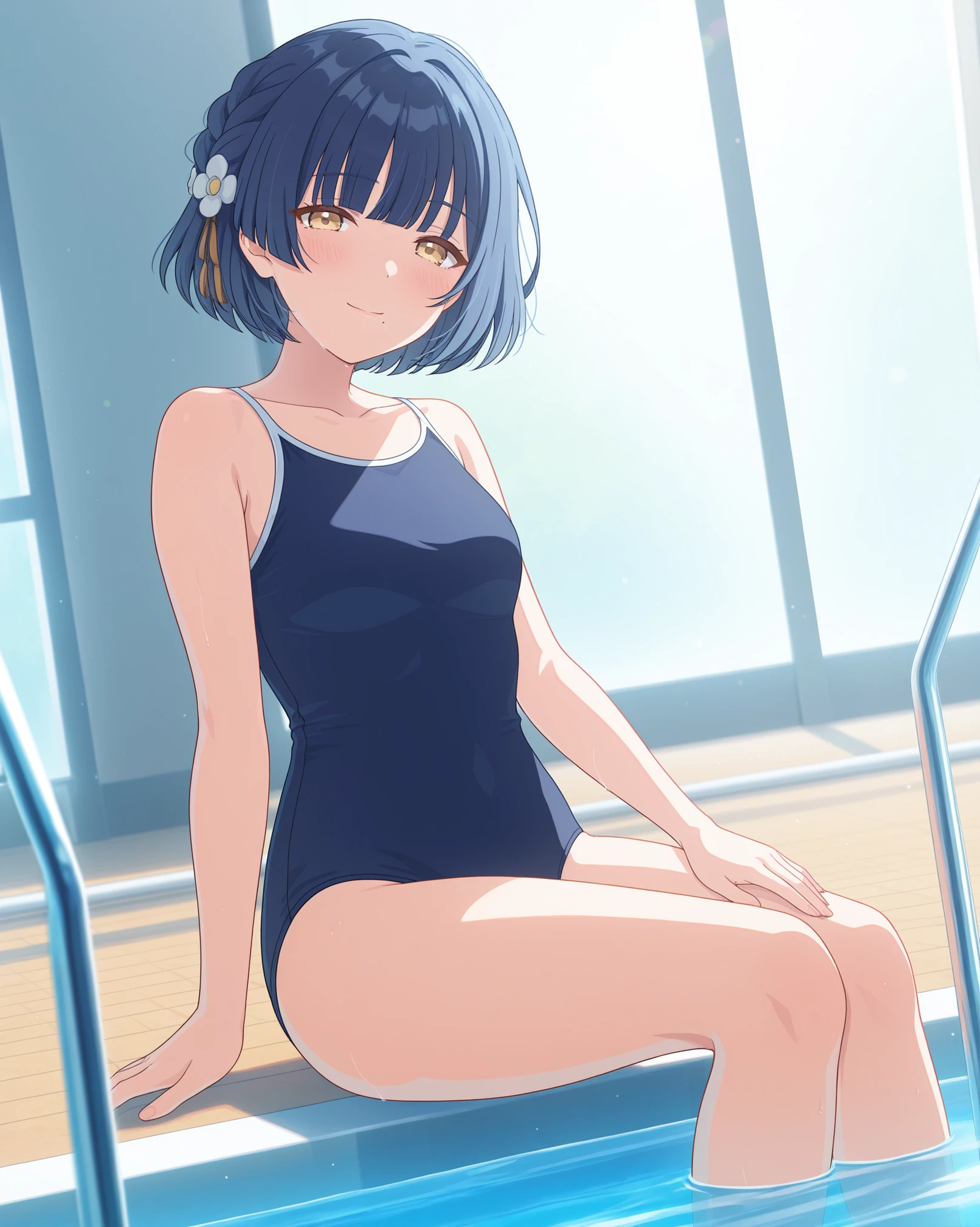 Base: mizusu765pro, mole under mouth, short hair, purple eyes, single braid, hair ornament, blue hair, hair flower,