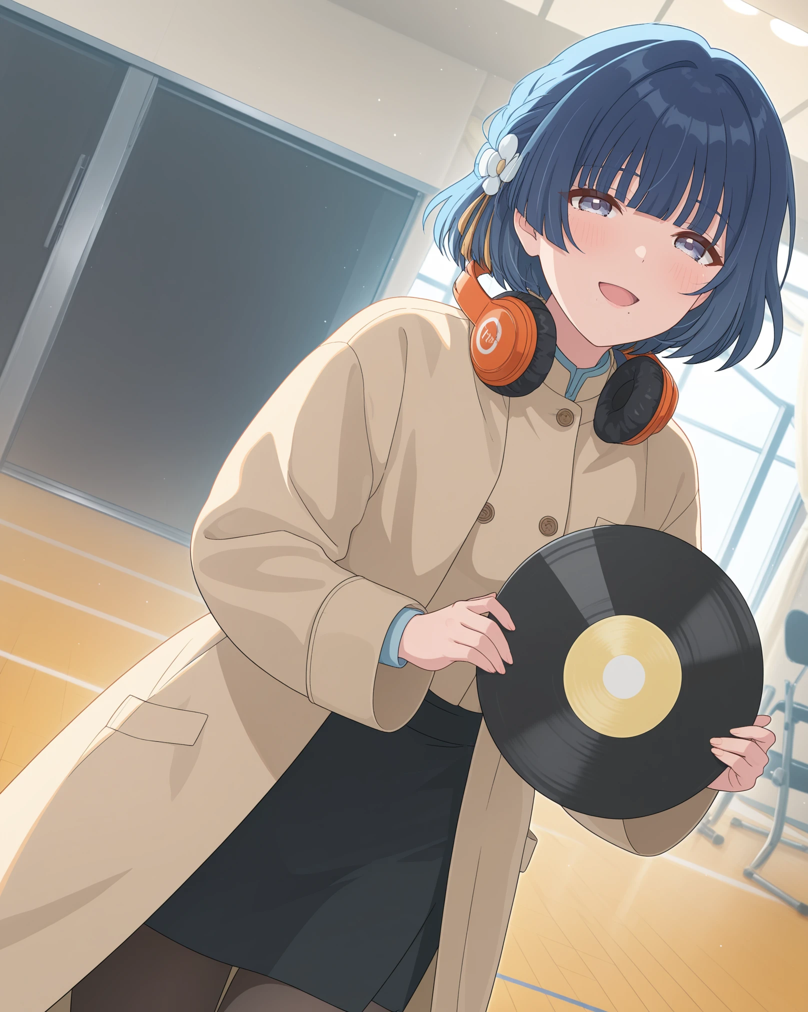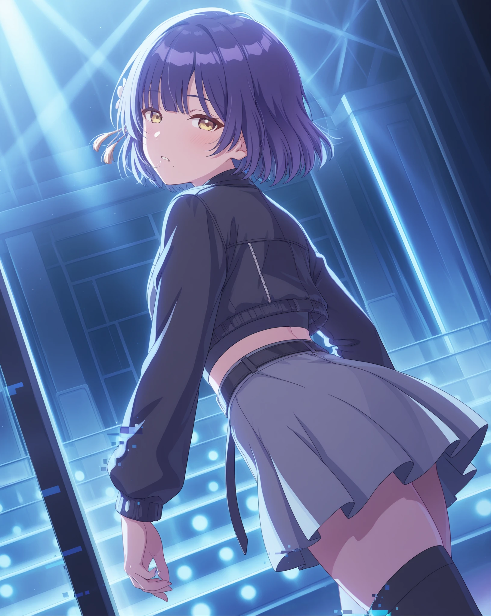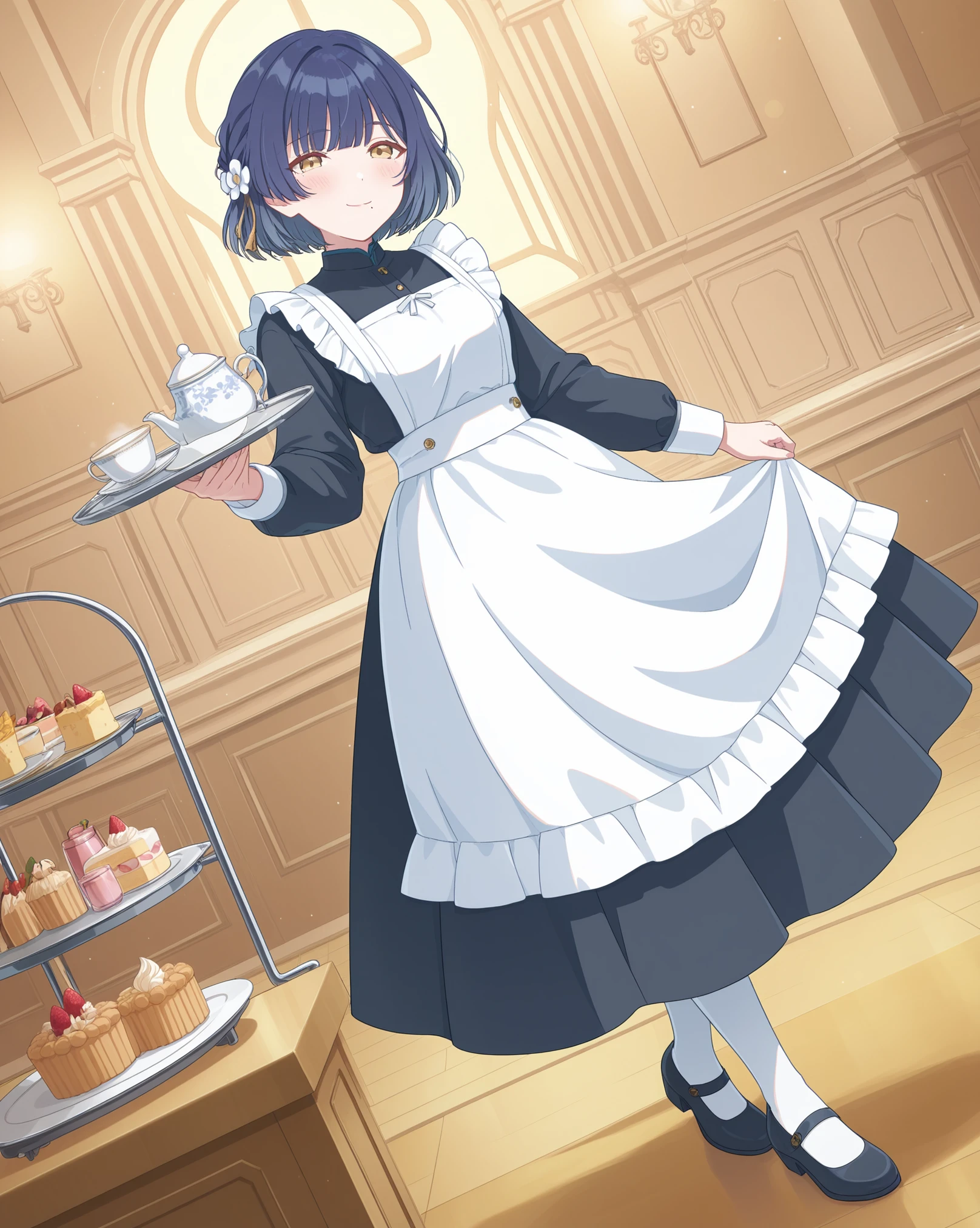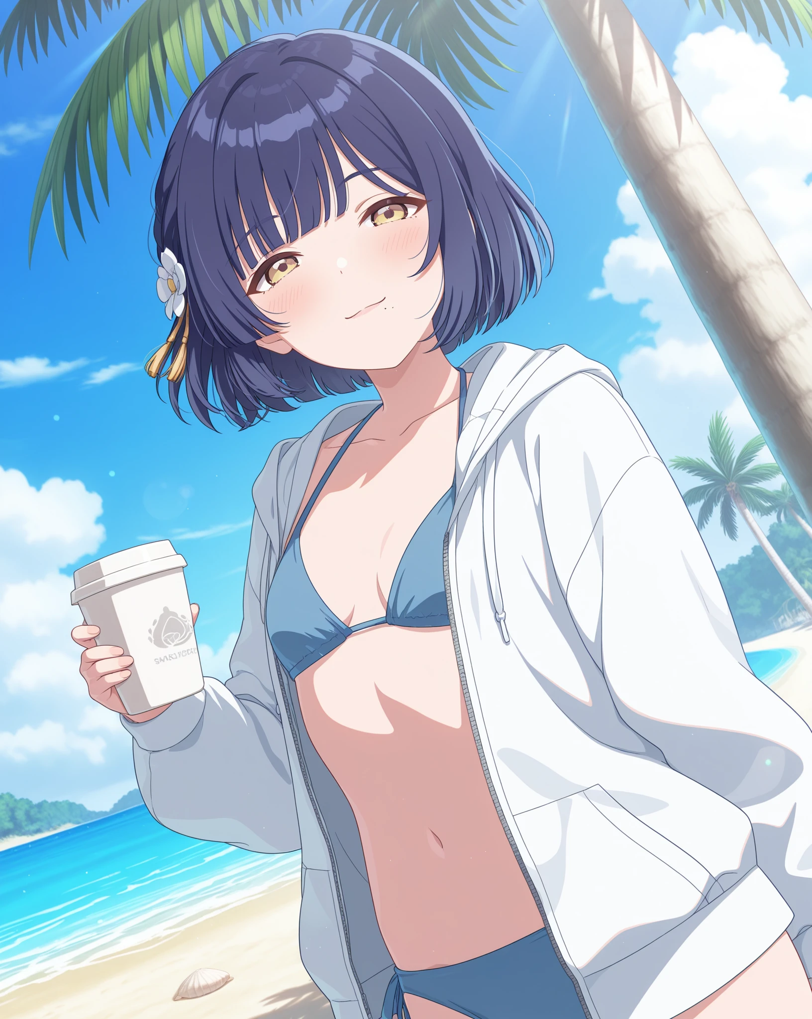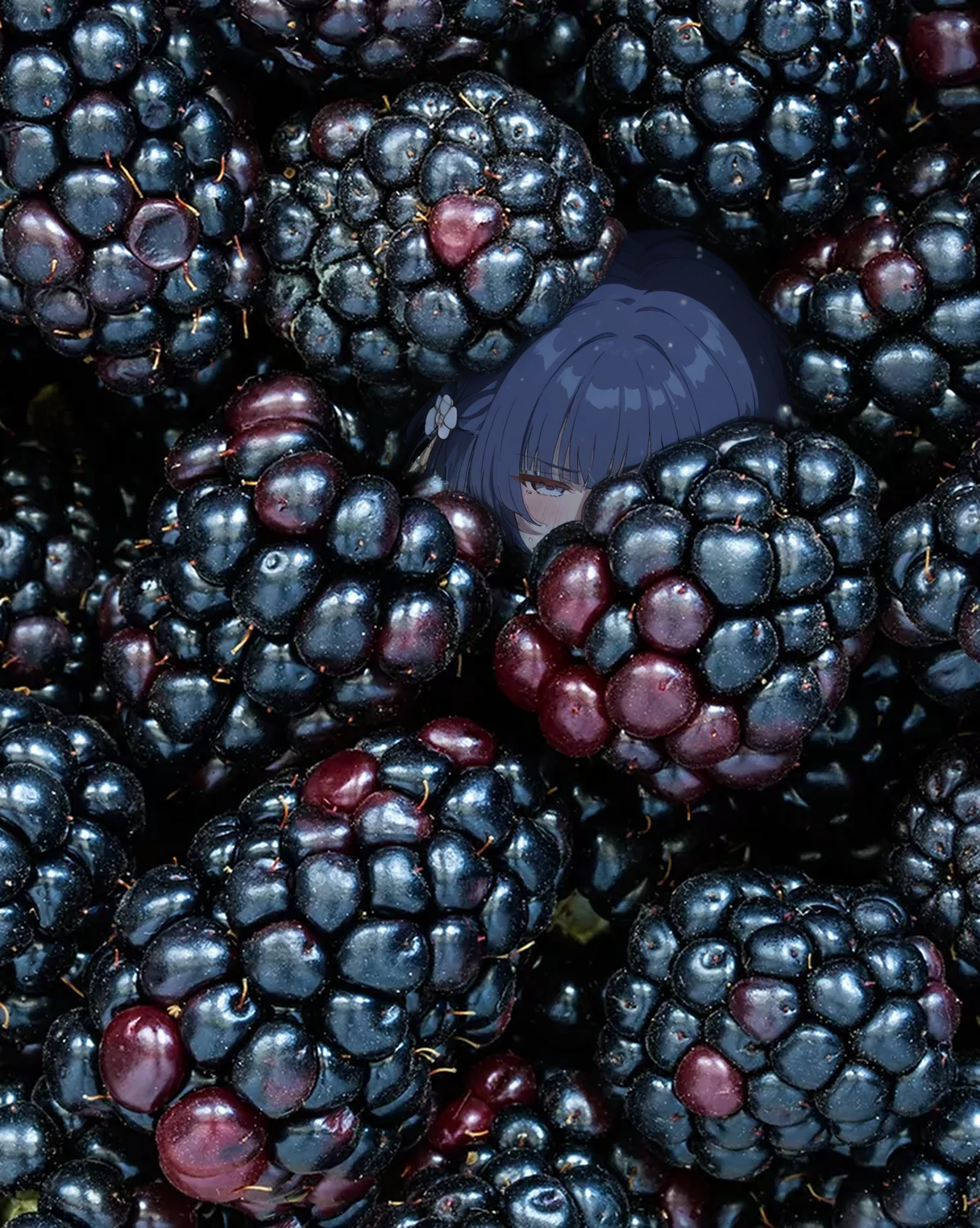 Base: mizusu765pro, mole under mouth, short hair, purple eyes, single braid, hair ornament, blue hair, hair flower,