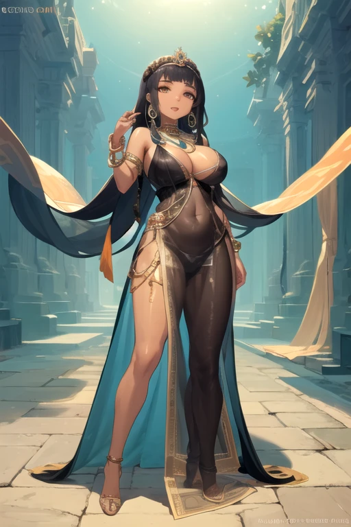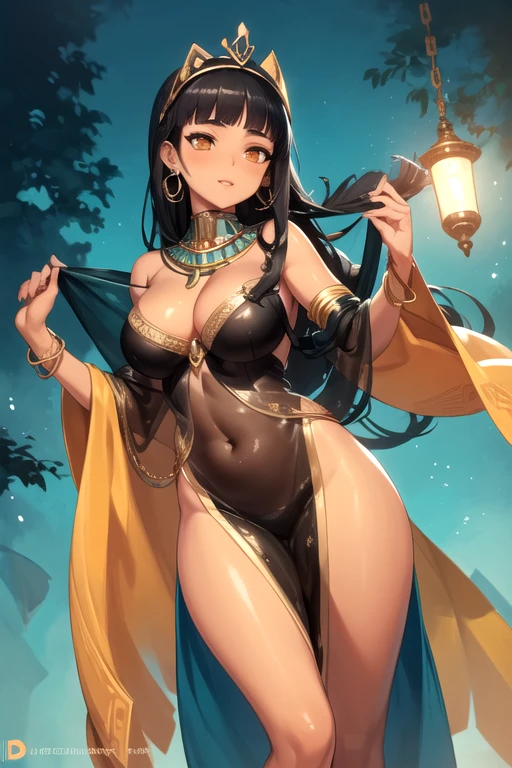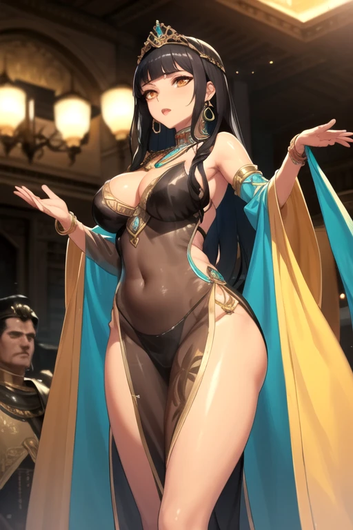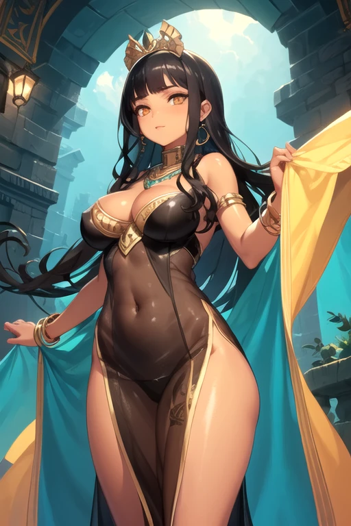 CleopatraDestiny, 1girl, solo, long hair, large breasts, black hair, orange eyes, black dress, cleavage, bare shoulders, earrings, blunt bangs, necklace, bracelet, dark-skinned female, see-through, covered navel, crown, pelvic curtain, eyeshadow, egyptian clothes