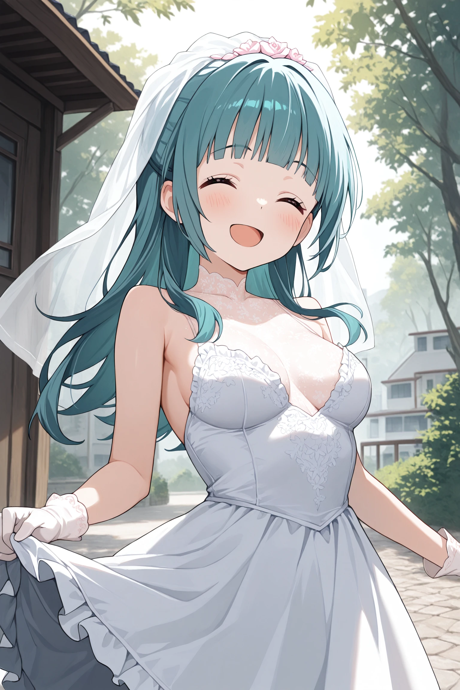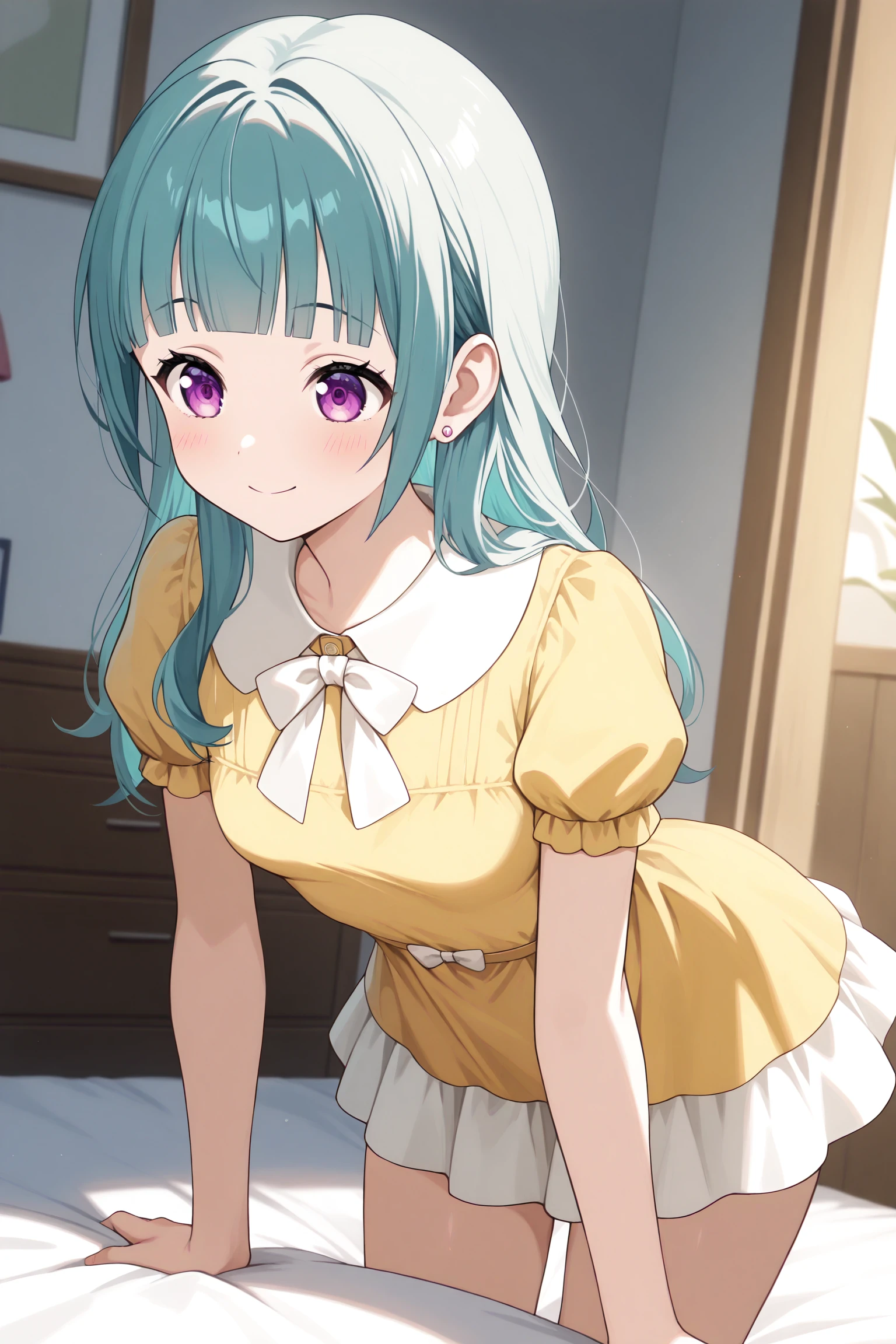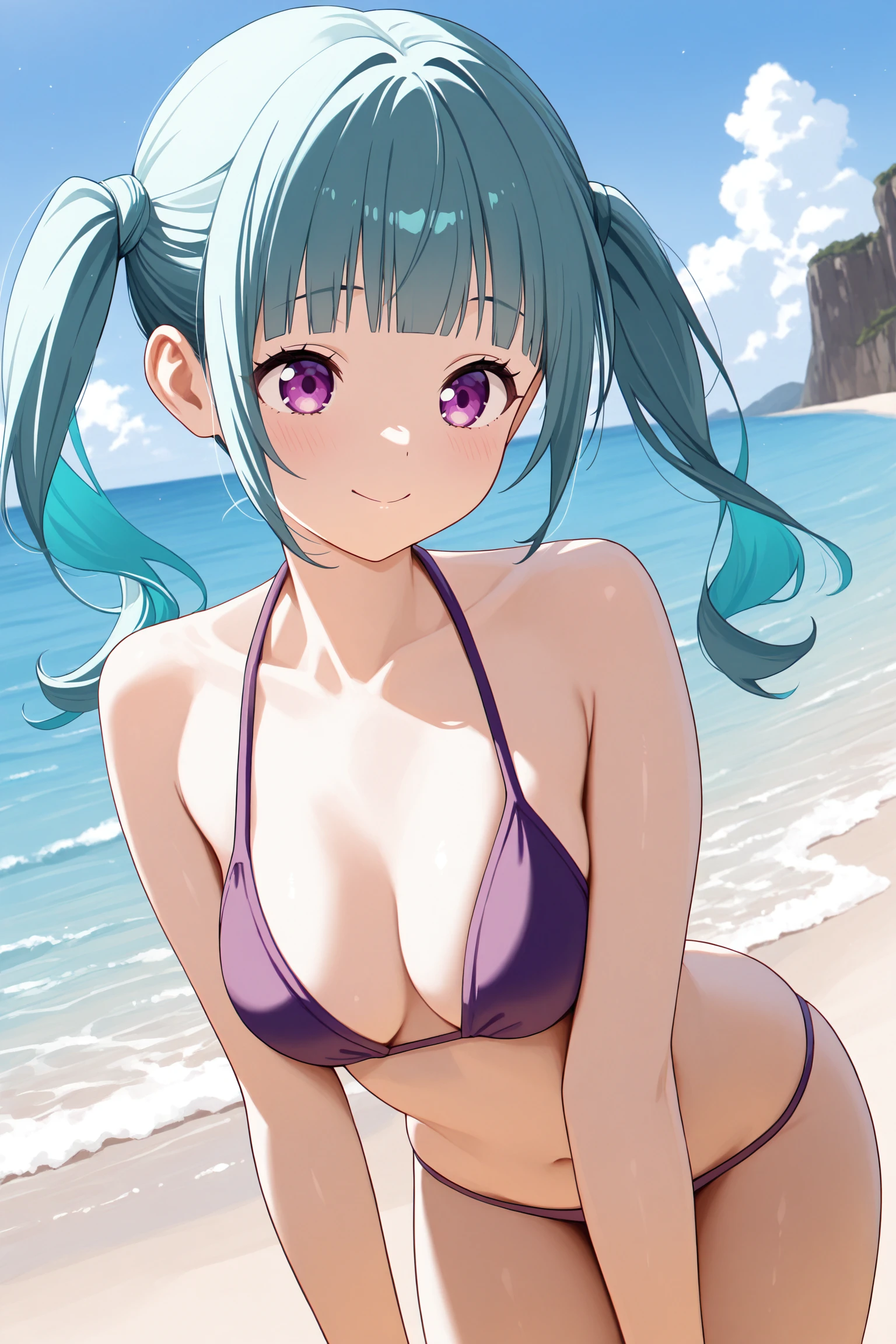 aqua hair, twintails, blunt bangs, long hair, sidelocks, purple eyes, earrings