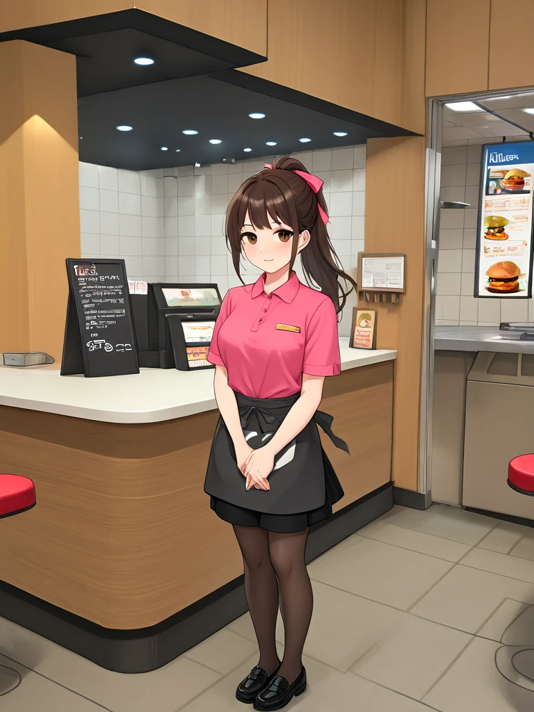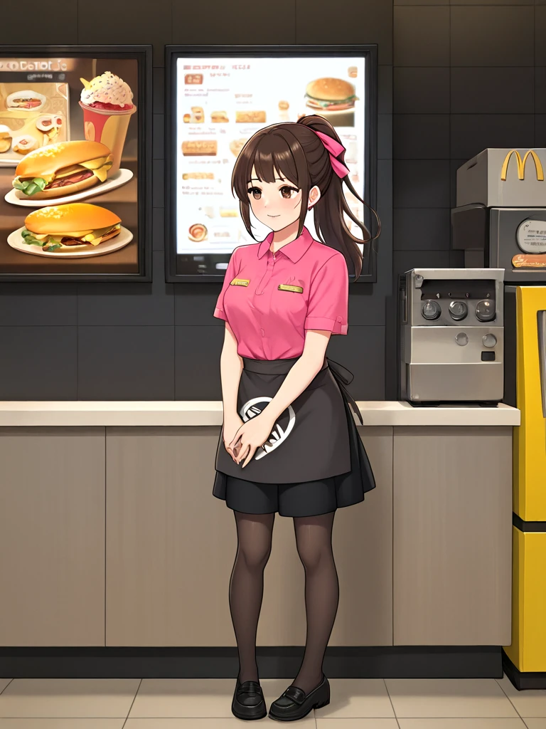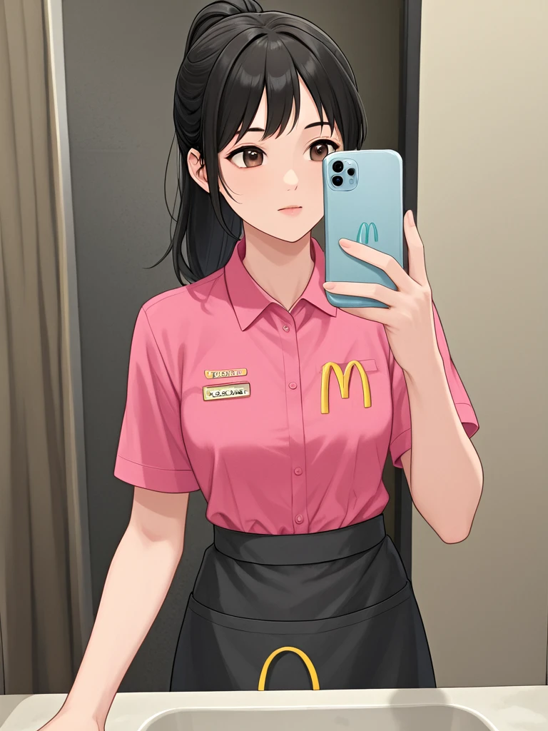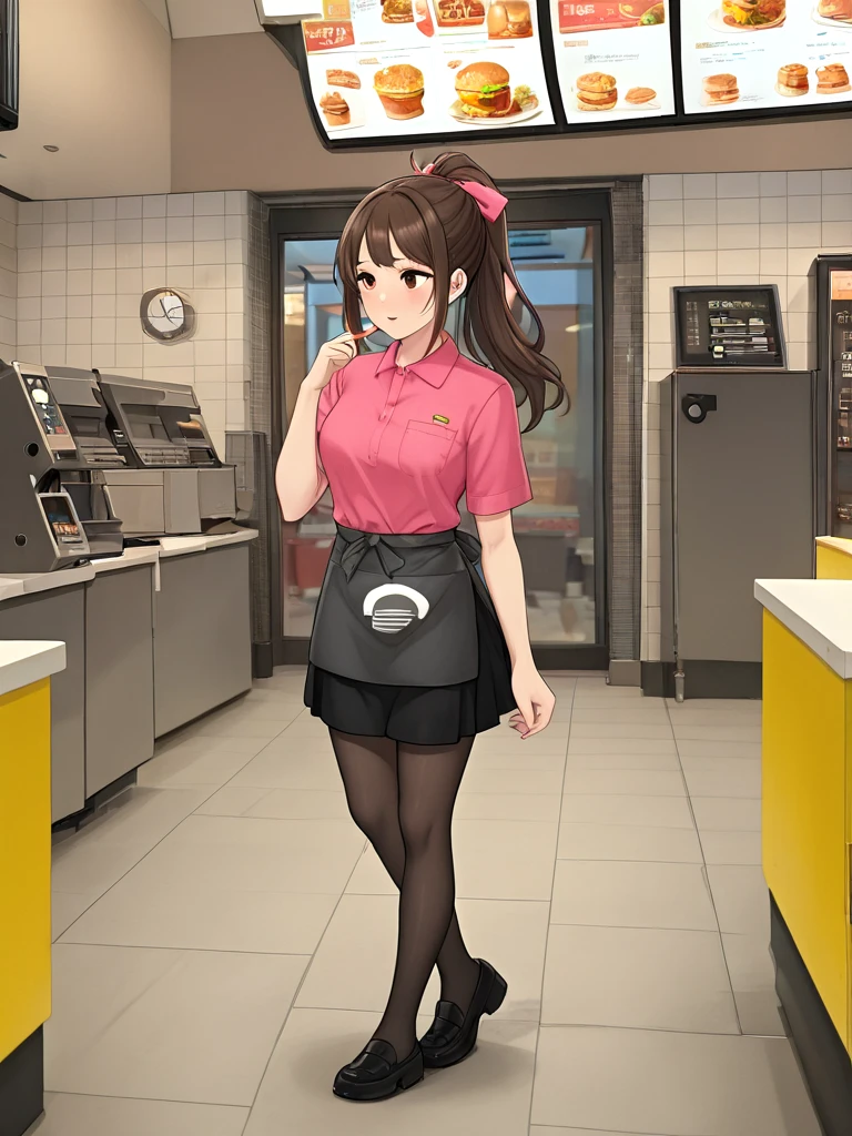 mcdonald's uniform, fast food uniform, 1girl, pink shirt, black skirt, miniskirt,