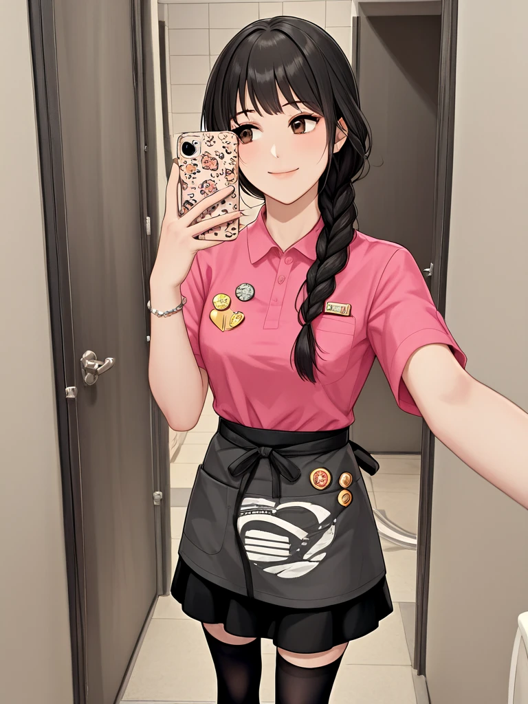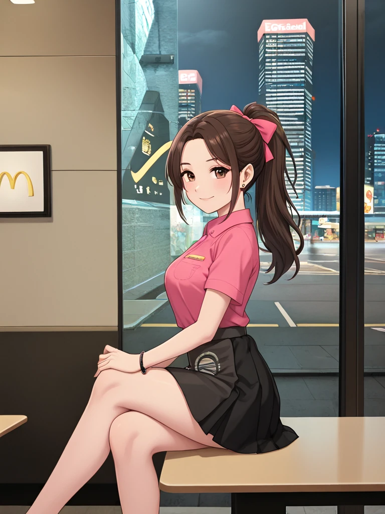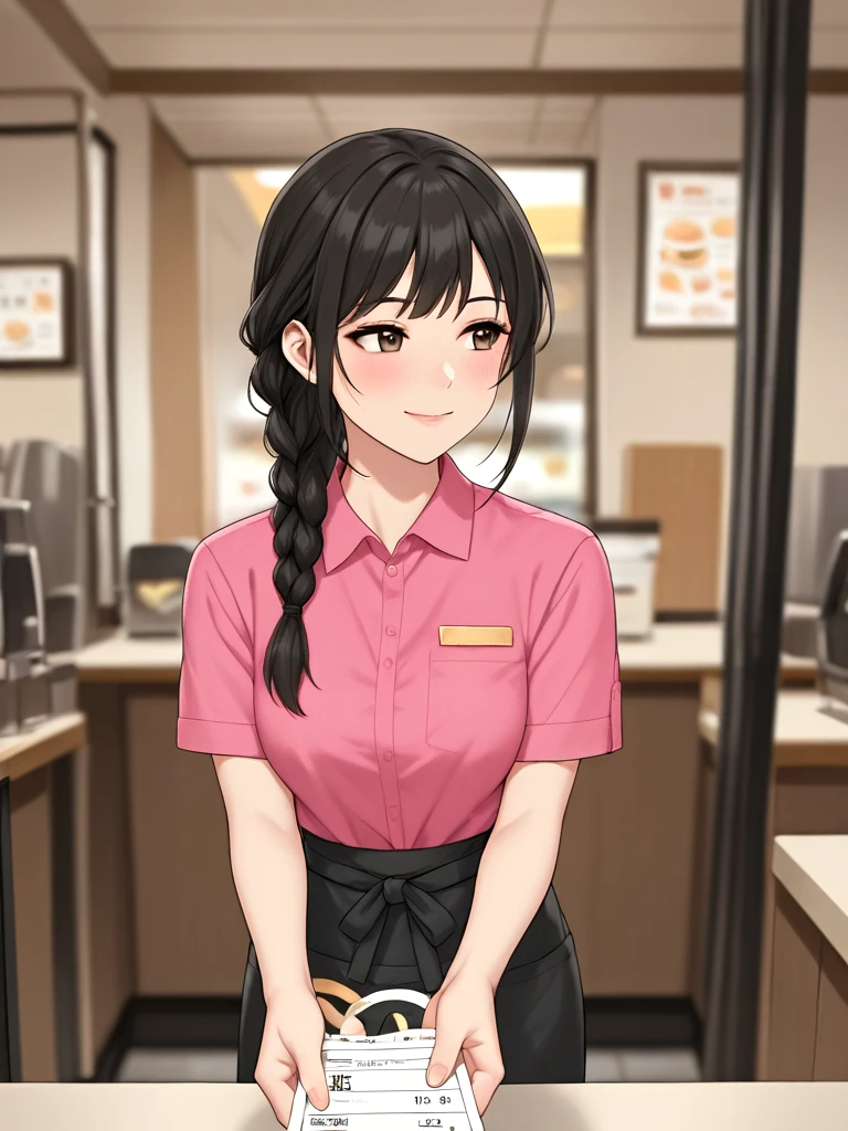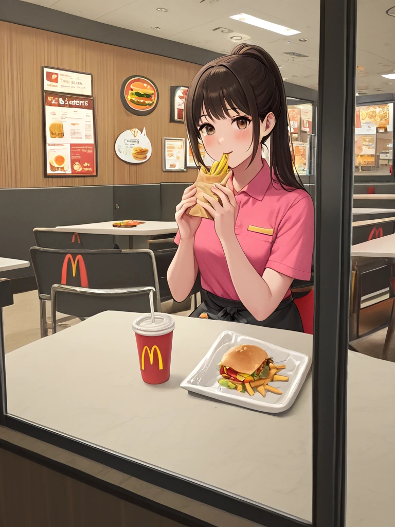 mcdonald's uniform, fast food uniform, 1girl, pink shirt, black skirt, miniskirt,