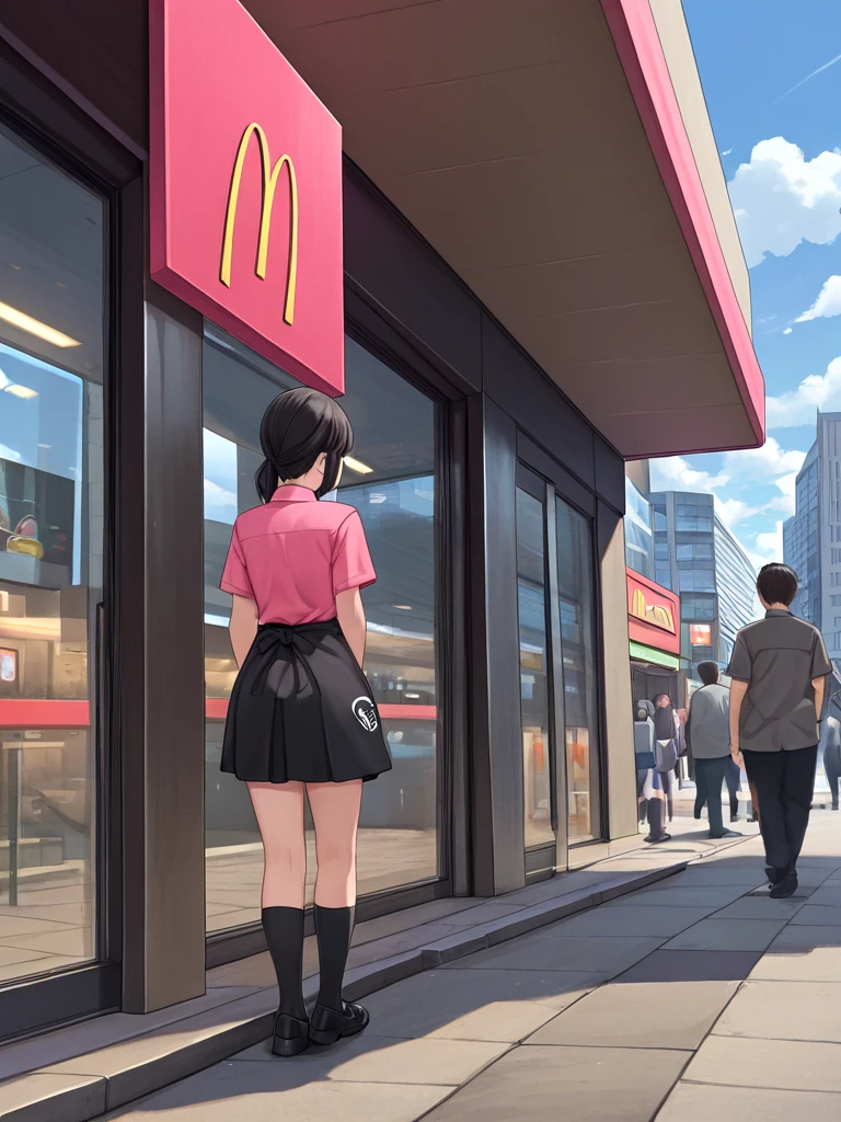mcdonald's uniform, fast food uniform, 1girl, pink shirt, black skirt, miniskirt, black socks, black footwear, outdoors, restaurant, storefront, building, sidewalk, street, cloud, road, tree, sky, people,
