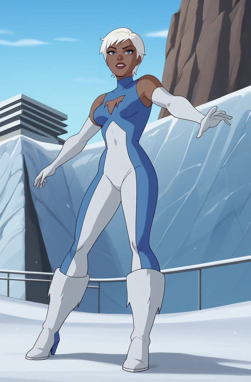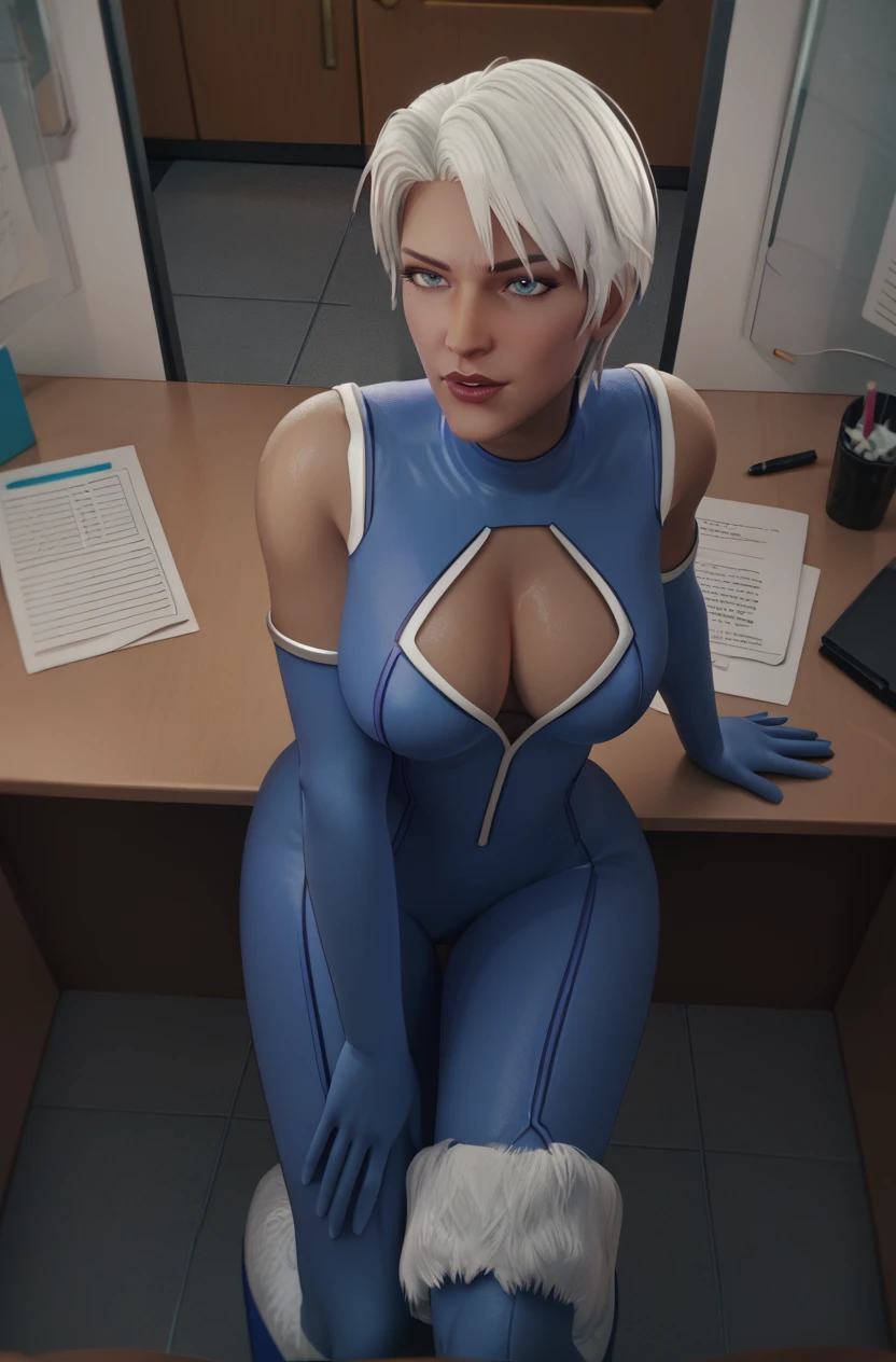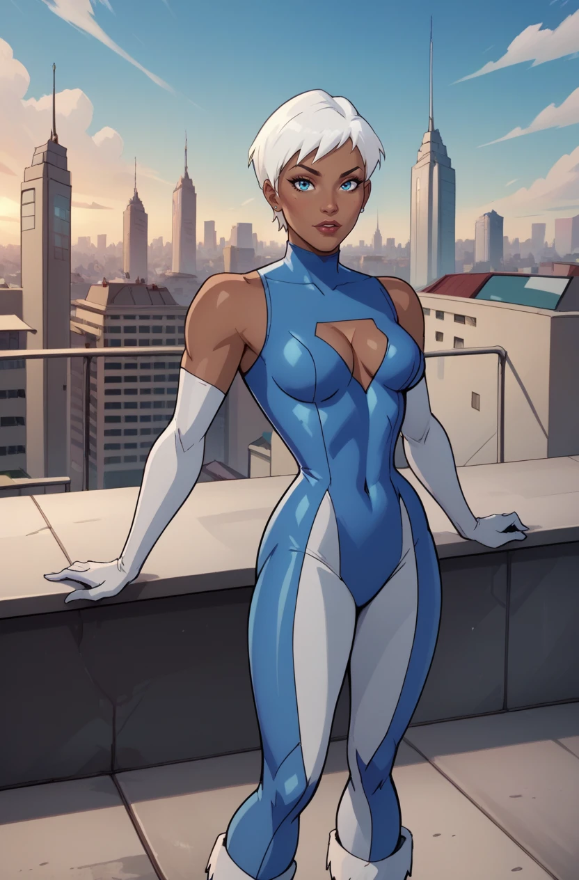 JLUIce, 1girl, white hair, short hair, blue eyes, bodysuit, elbow gloves, fur-trimmed boots, cleavage, cleavage cutout