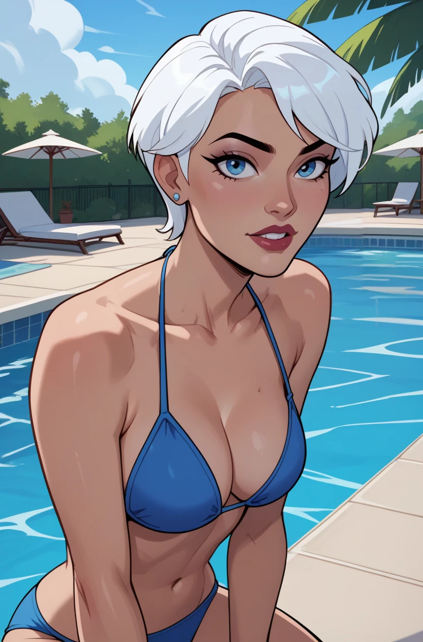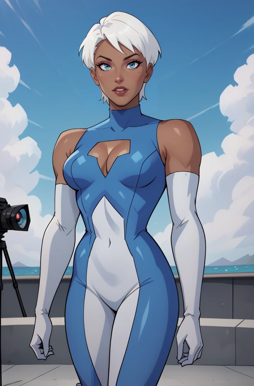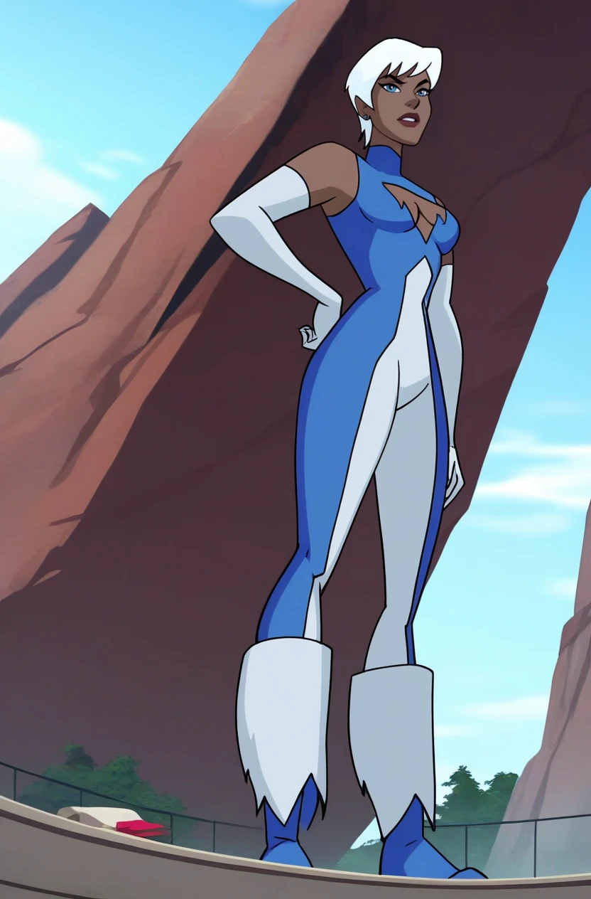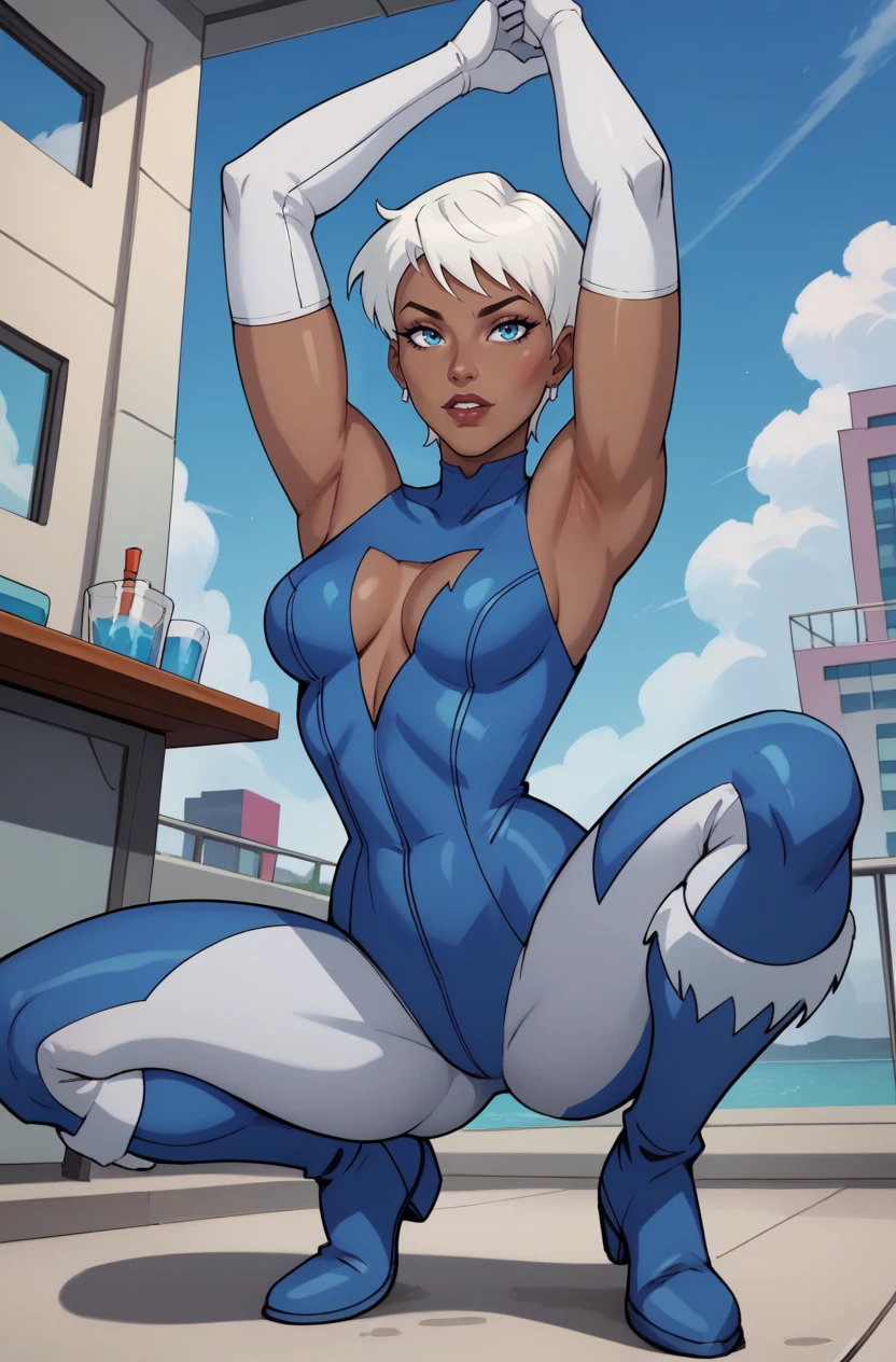 JLUIce, 1girl, white hair, short hair, blue eyes, bodysuit, elbow gloves, fur-trimmed boots, cleavage, cleavage cutout
