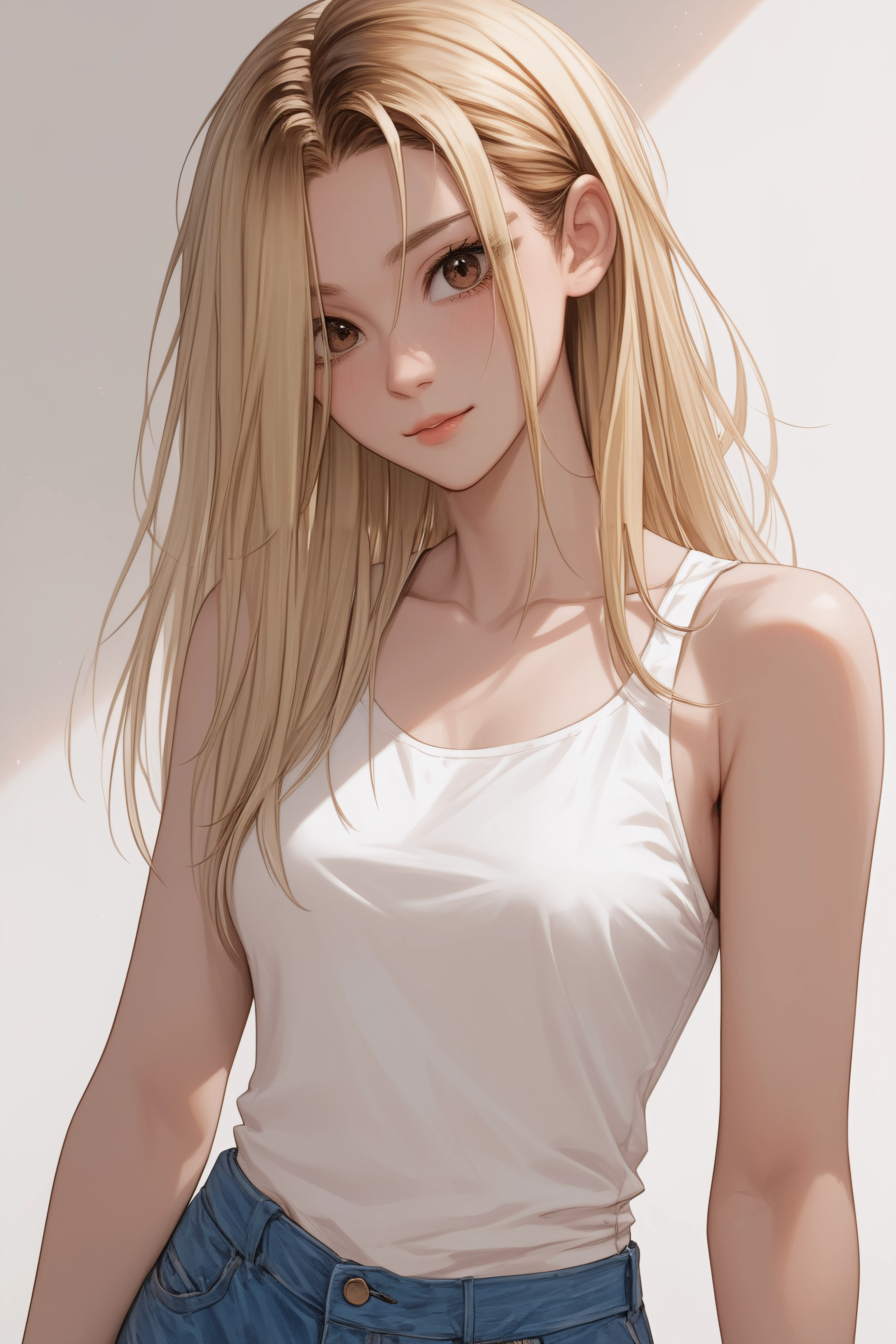 jia han, brown eyes, blonde hair, multicolored hair, long hair, medium breasts, white tank top, bare shoulders, collarbone, sleeveless, blue denim shorts, standing,