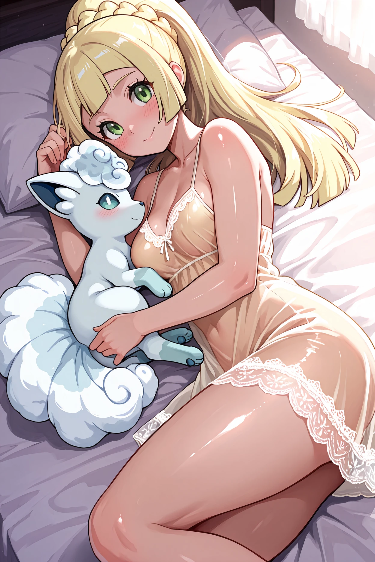 lillie (pokemon), long hair, ponytail, braid, blunt bangs, green eyes