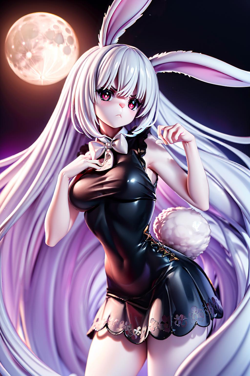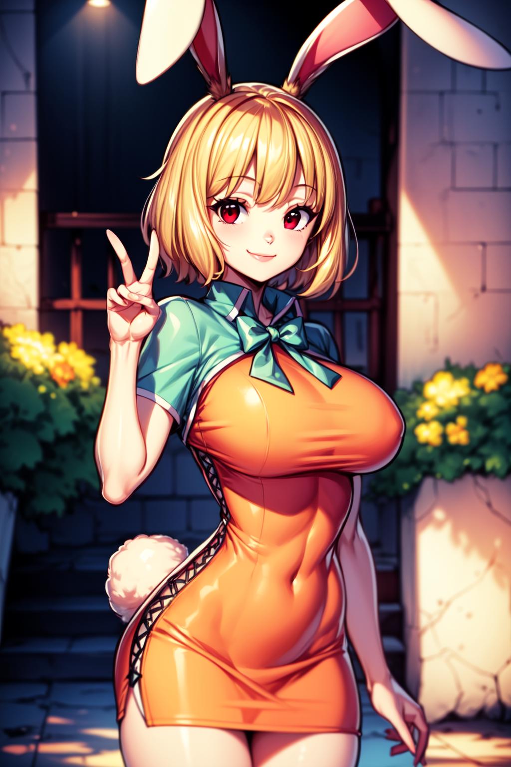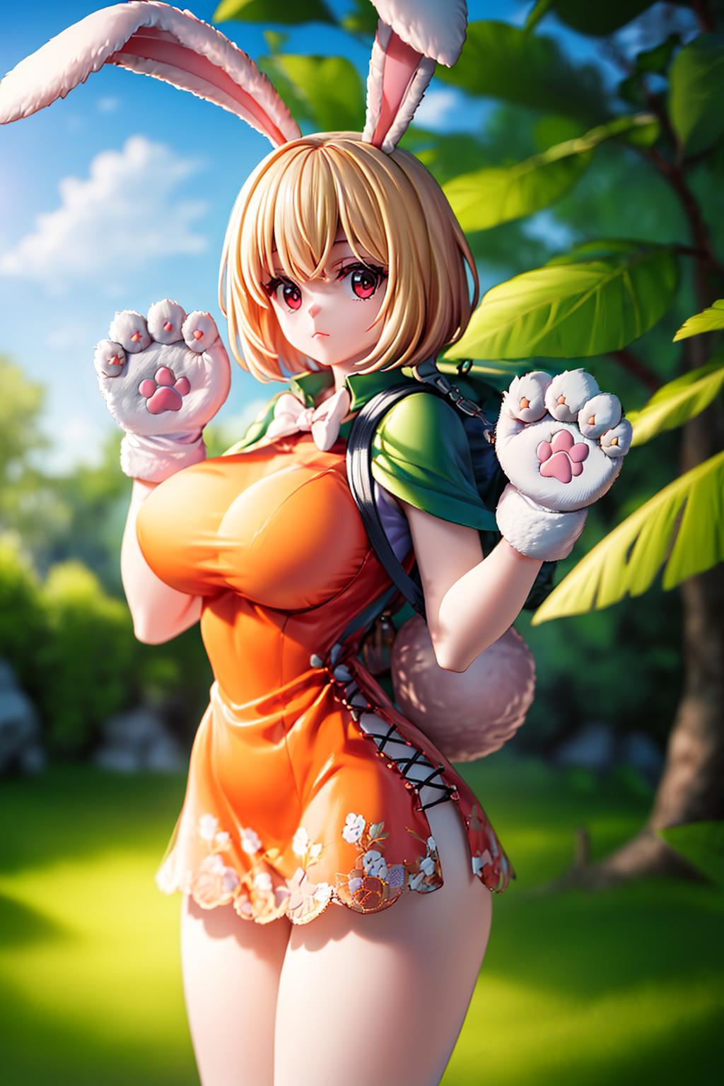 CarrotOP_NDV, 1girl, blonde hair, large breasts, (rabbit face), short hair, red eyes, orange dress, green capelete, rabbit ears, rabbit girl