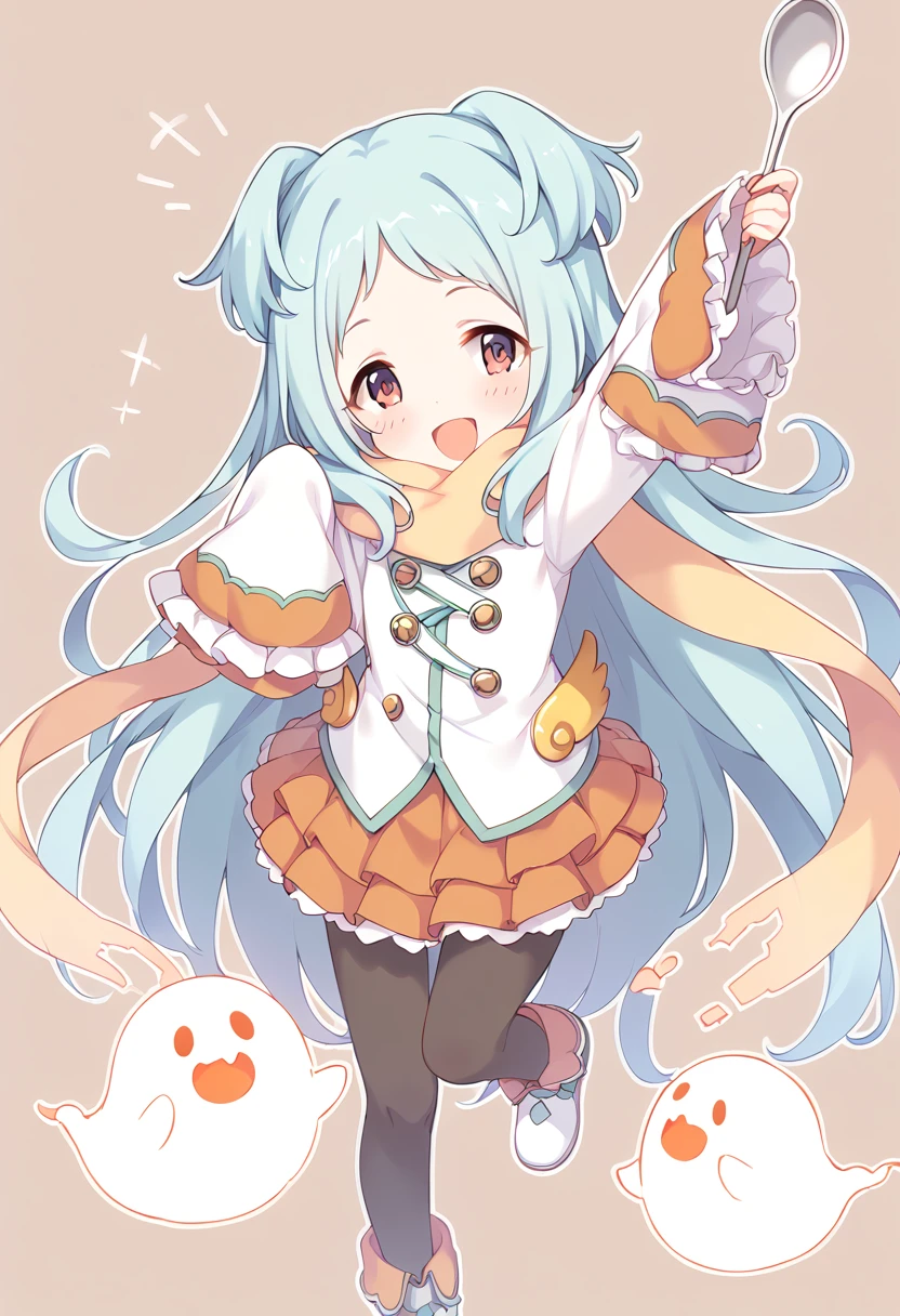 miyako \(princess connect!\), very long hair, blue hair, two side up, parted bangs, red eyes, eyebrows visible through hair, white jacket, white shirt, wide sleeves, long sleeves, sleeves past wrists, sleeves past fingers, frilled sleeves, brown scarf, yellow scarf, pleated skirt, orange skirt, yellow skirt, frilled skirt, layered skirt, miniskirt, pantyhose, black legwear, boots, white footwearHalloween costume