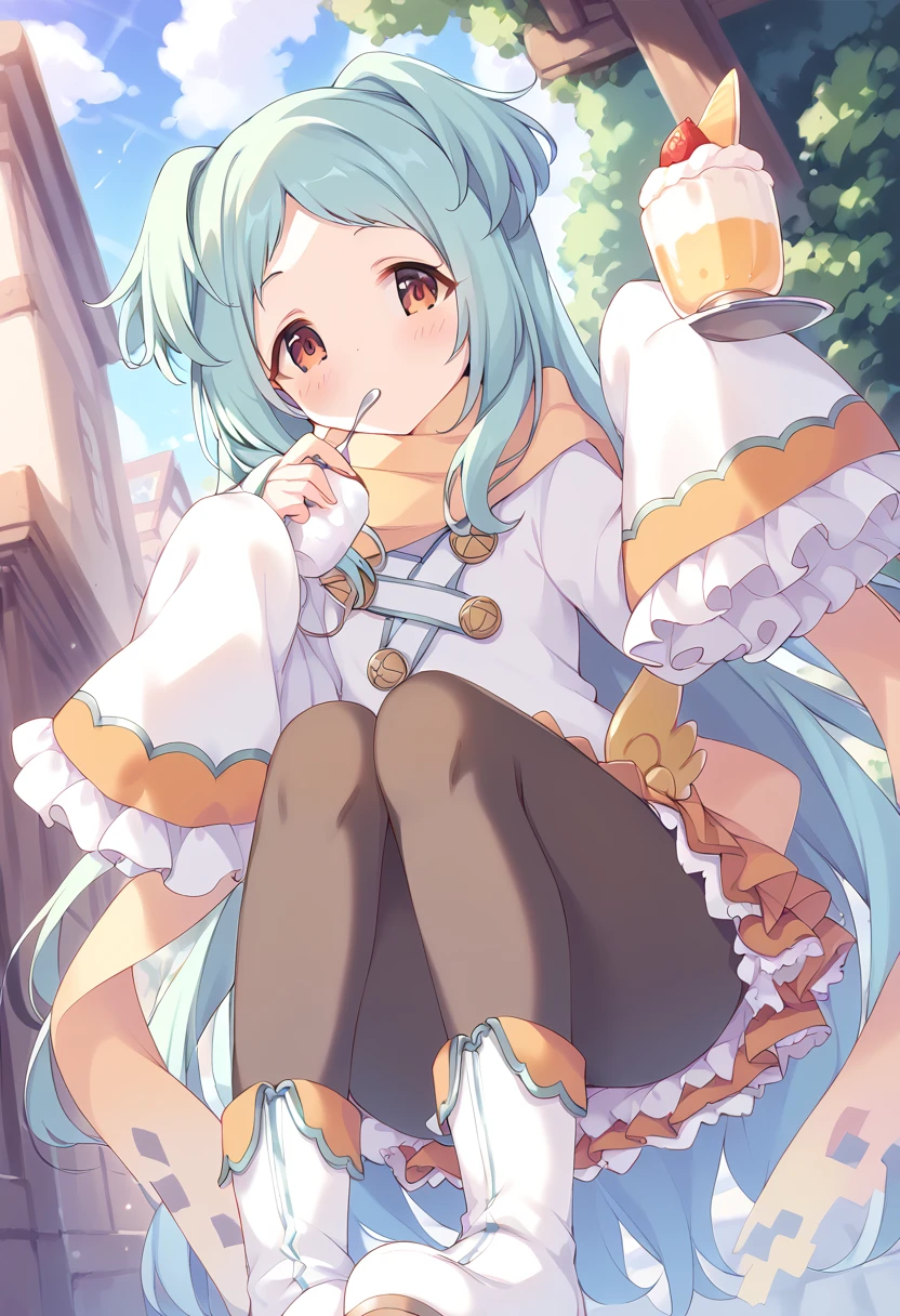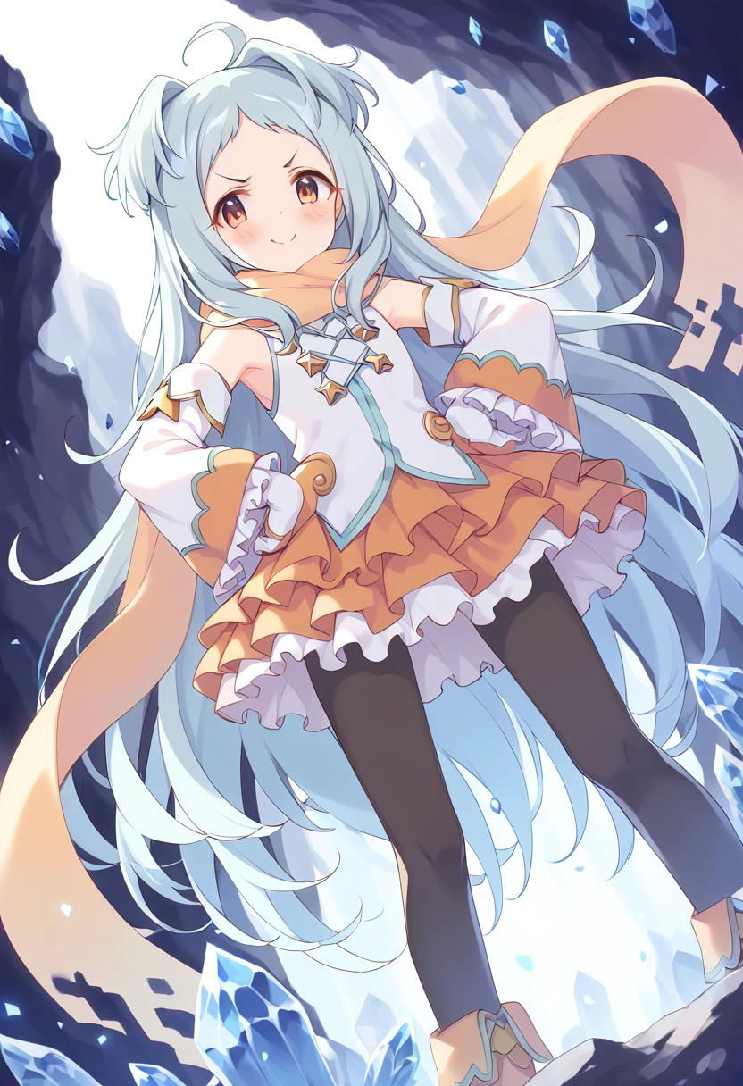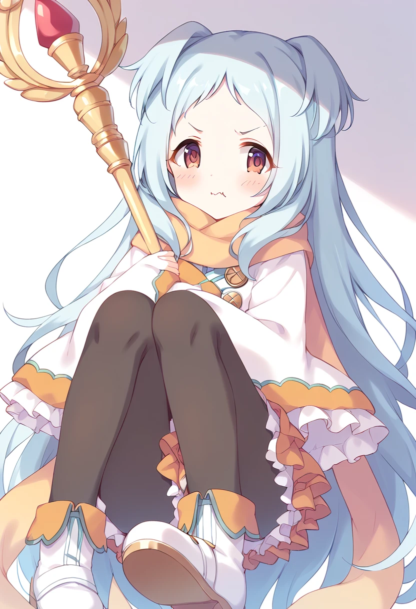 miyako \(princess connect!\), very long hair, blue hair, two side up, parted bangs, red eyes, eyebrows visible through hair, white jacket, white shirt, wide sleeves, long sleeves, sleeves past wrists, sleeves past fingers, frilled sleeves, brown scarf, yellow scarf, pleated skirt, orange skirt, yellow skirt, frilled skirt, layered skirt, miniskirt, pantyhose, black legwear, boots, white footwear