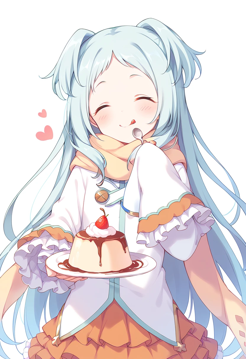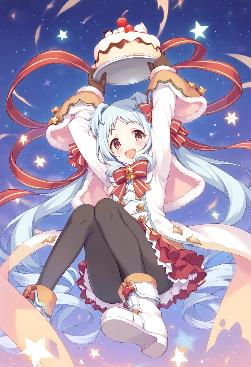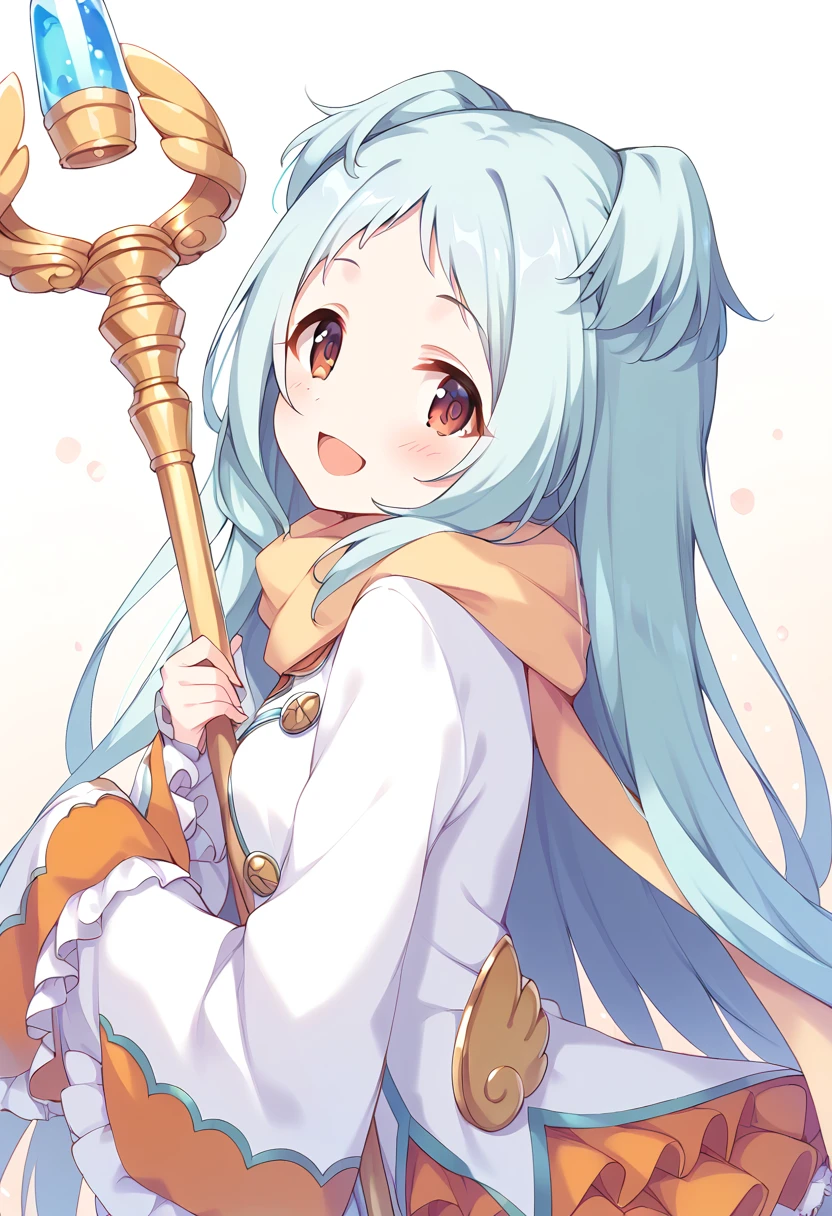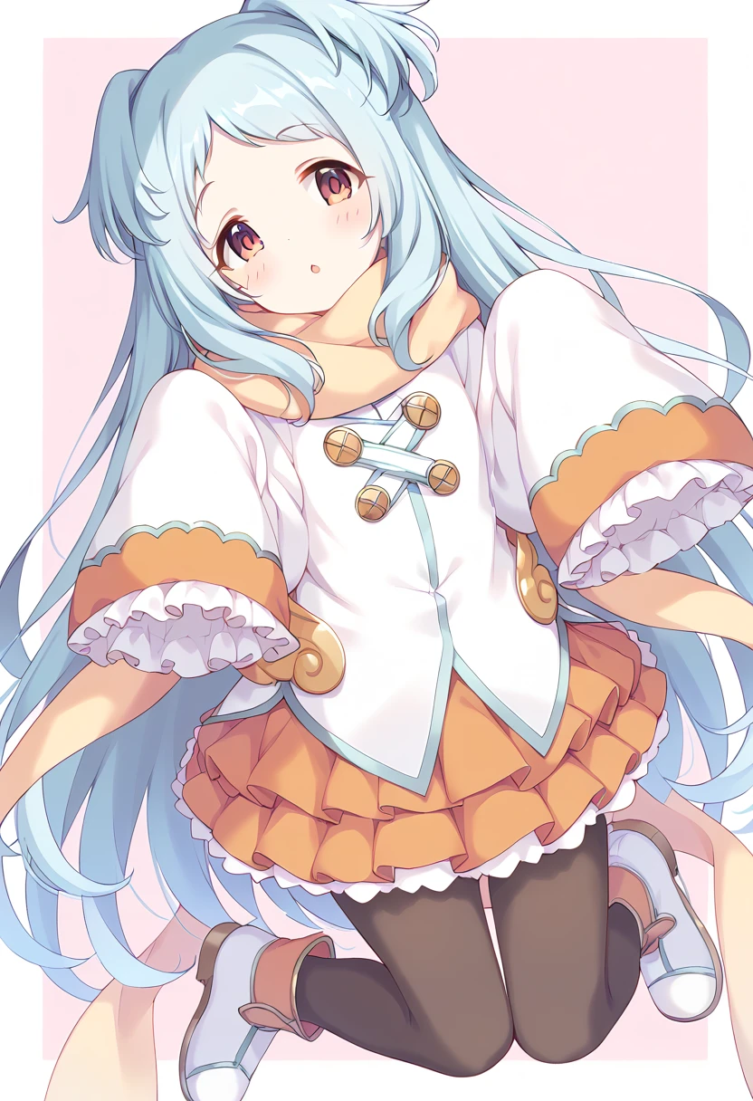 miyako \(princess connect!\), very long hair, blue hair, two side up, parted bangs, red eyes, eyebrows visible through hair, white jacket, white shirt, wide sleeves, long sleeves, sleeves past wrists, sleeves past fingers, frilled sleeves, brown scarf, yellow scarf, pleated skirt, orange skirt, yellow skirt, frilled skirt, layered skirt, miniskirt, pantyhose, black legwear, boots, white footwear