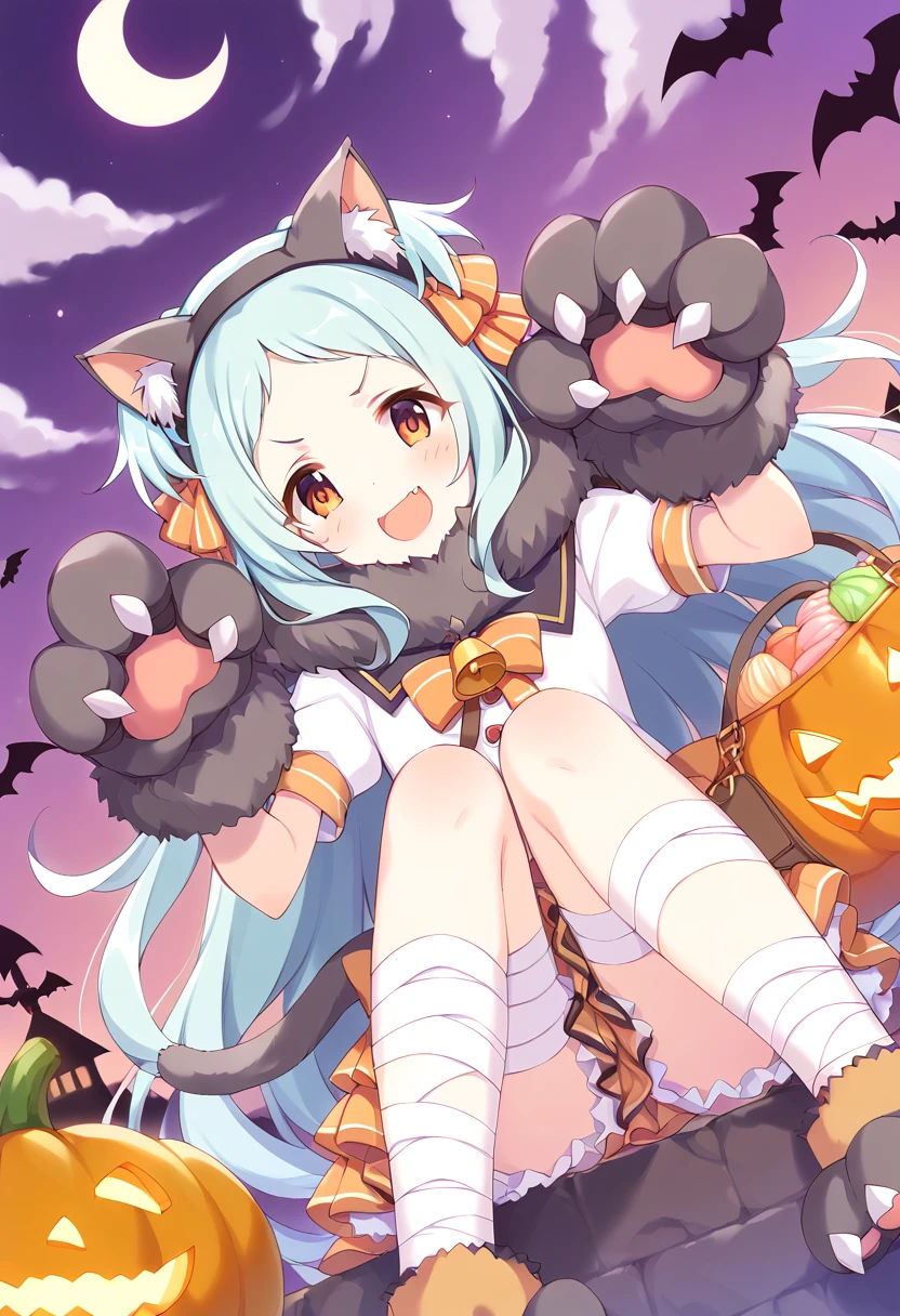 miyako \(princess connect!\), halloween costume, very long hair, blue hair, two side up, parted bangs, red eyes, eyebrows visible through hair, animal ears, animal ear fluff, cat ears, fake animal ears, black hairband, animal hands, paw gloves, fur-trimmed gloves, grey gloves, claws, white shirt, white jacket, sailor collar, fur collar, fur trim, long sleeves, fur-trimmed sleeves, neck bell, bandages, bandaged leg, bag, fang, hair bow, striped bow, red bow, orange skirt, yellow skirt, pleated skirt, layered skirt, miniskirt, black footwear, paw shoes