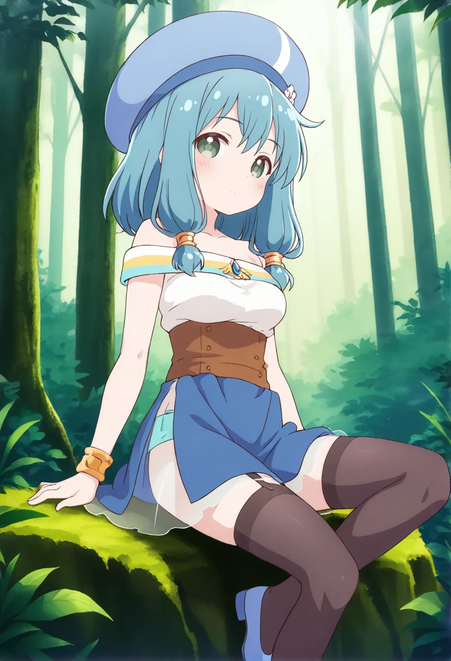 mei-default,meiza endust,green eyes,blue hair,medium hair,beret,white shirt,off shoulder,blue skirt,side slit,see-through,corset, black thighhighs,garter straps, blue footwear,bracelet