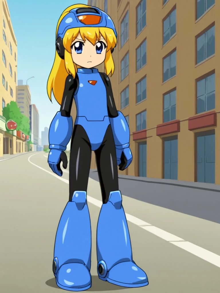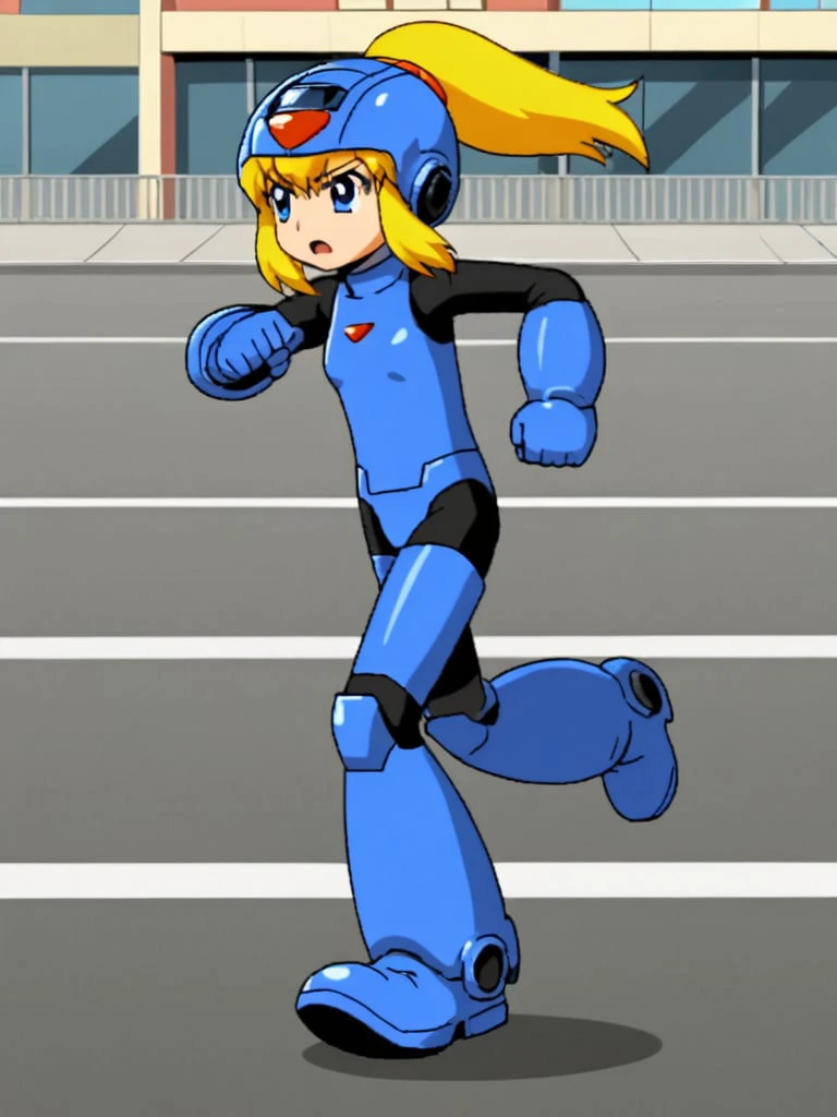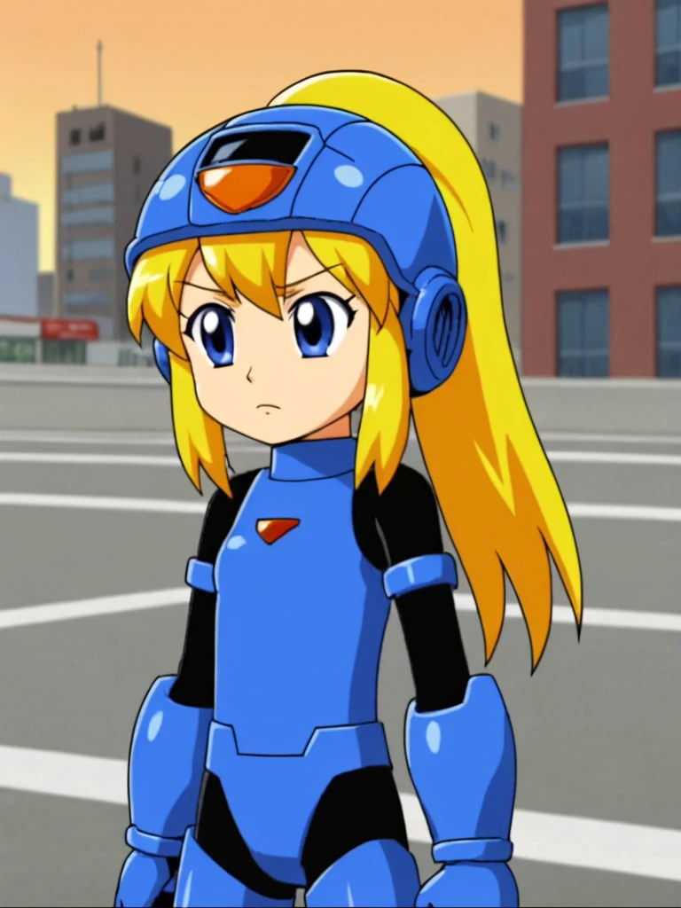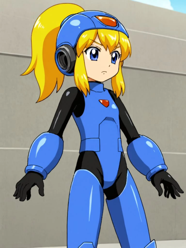 rokkotyan, android, armor, bodysuit, helmet, blonde hair, ponytail, blue eyes