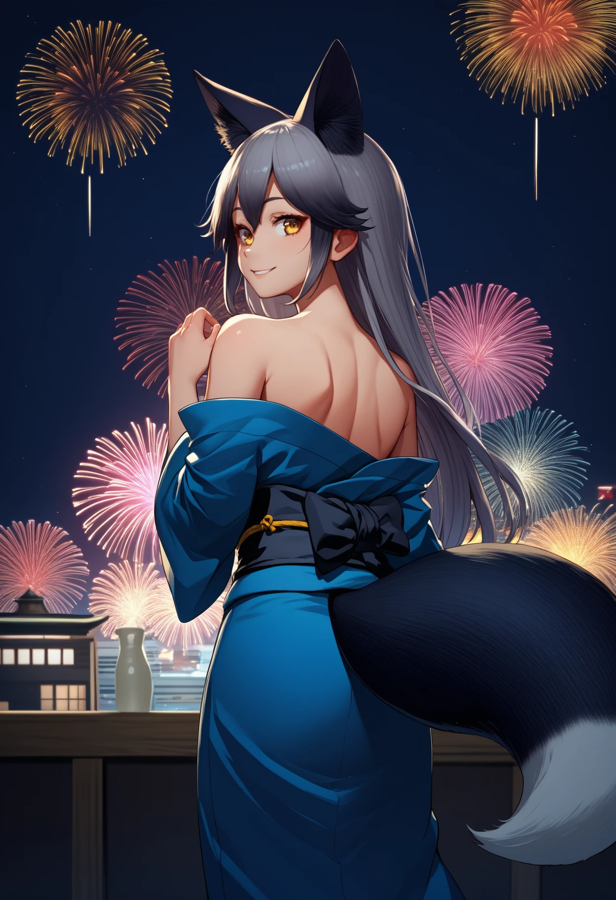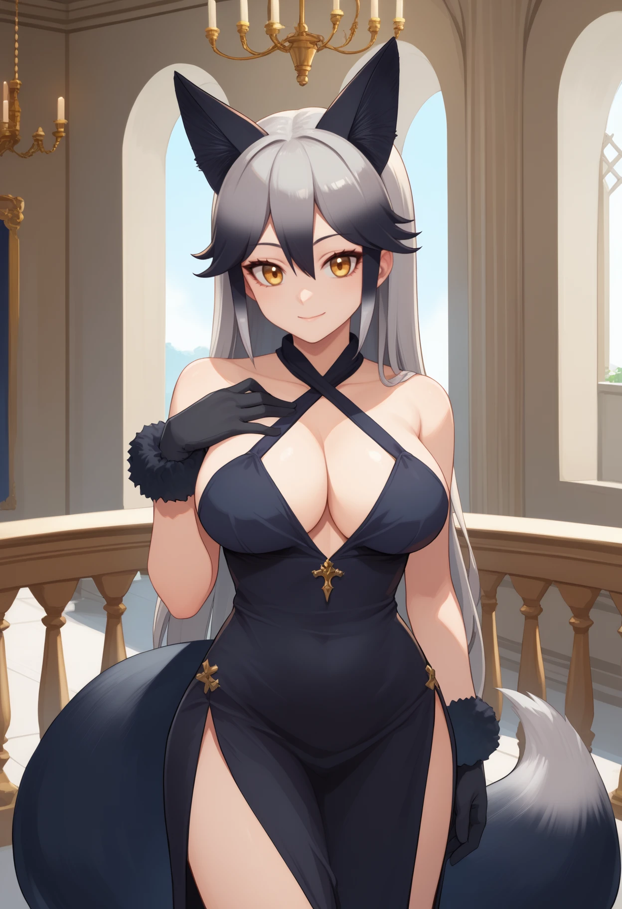 silv3rf0x, fox tail, long hair, multicolored hair, grey hair, black hair, animal ears, extra ears, yellow eyes