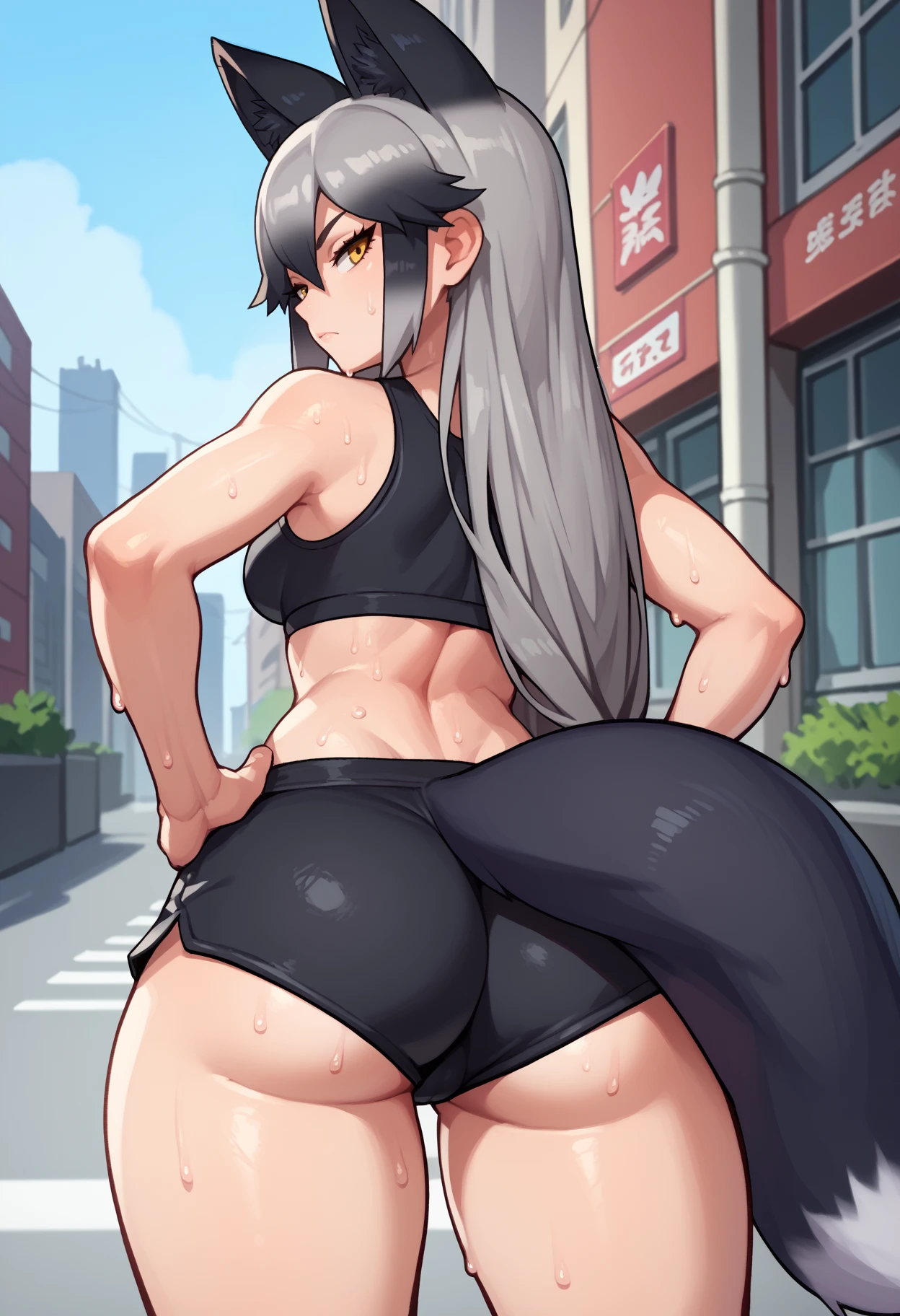 Trigger + Appearance: silv3rf0x, fox tail, long hair, multicolored hair, grey hair, black hair, animal ears, extra ears, yellow eyes