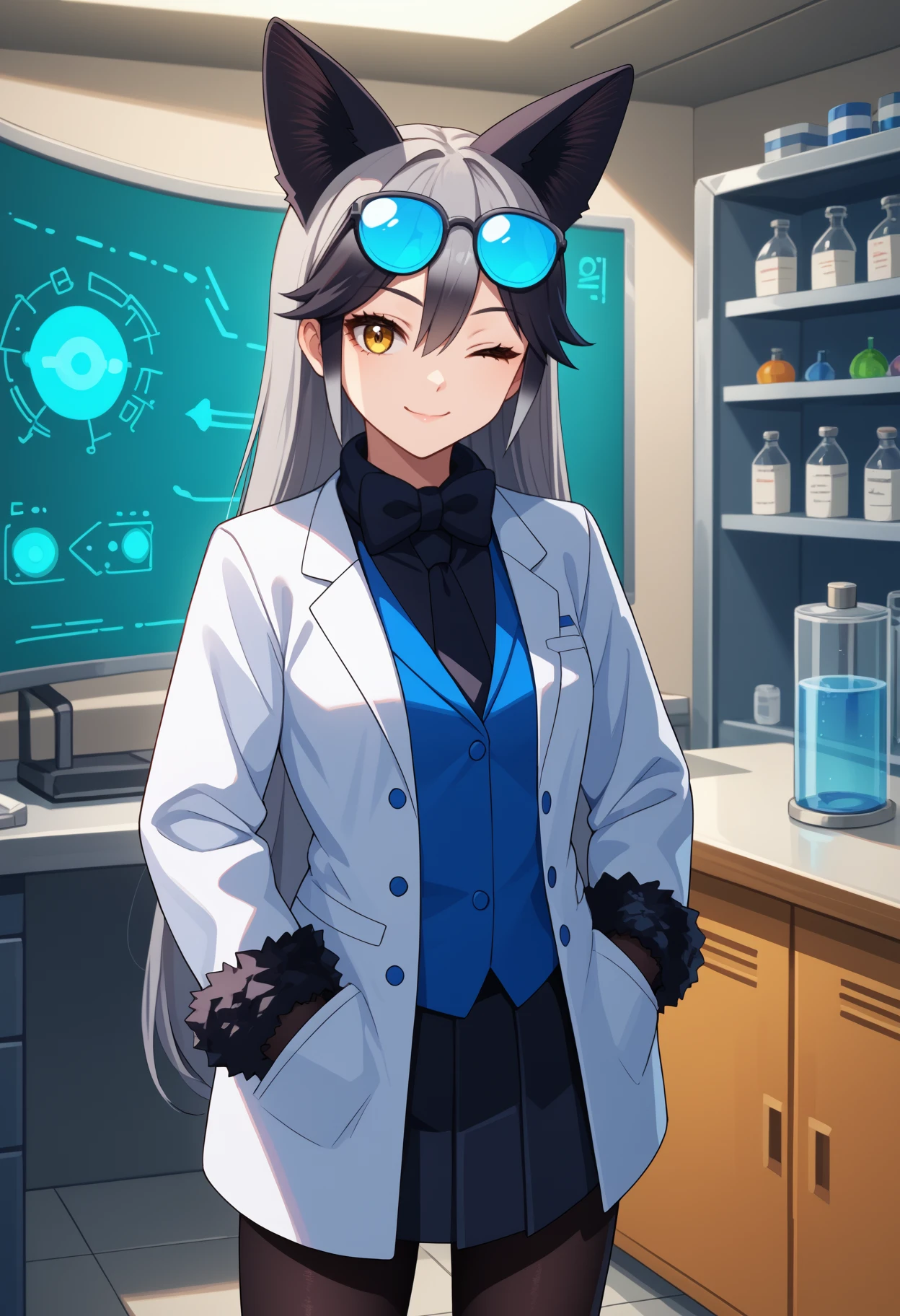 Default Outfit: fur trim, blue jacket, blazer, long sleeves, fur-trimmed sleeves, black shirt, black bowtie, black necktie, black gloves, black skirt, pleated skirt, black pantyhose