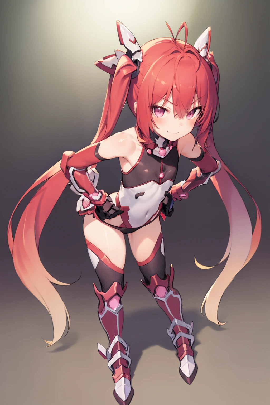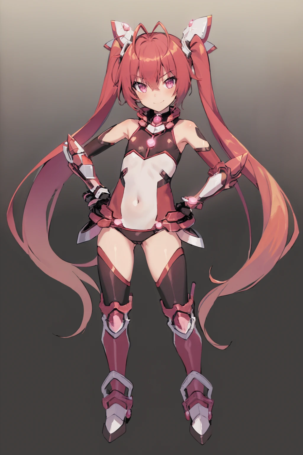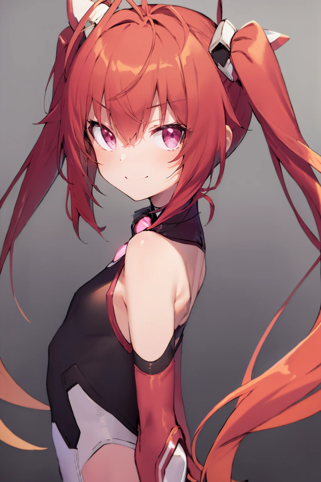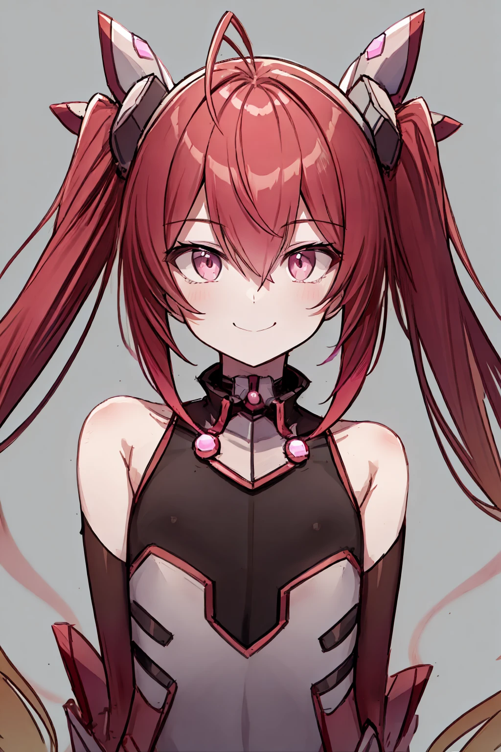 Basic prompts : 1girl, red hair, gradient hair, long hair, twintails, antenna hair, bangs, hair between eyes, pink eyes, headgear
