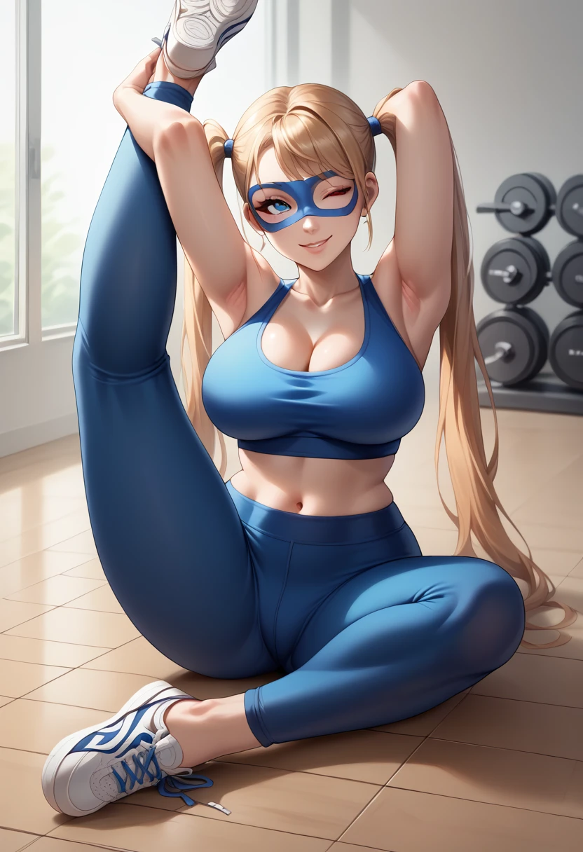 RMikaSF, twintails, domino mask, frills, wrestling outfit, blue leotard, shoulder cutout,cleavage cutout