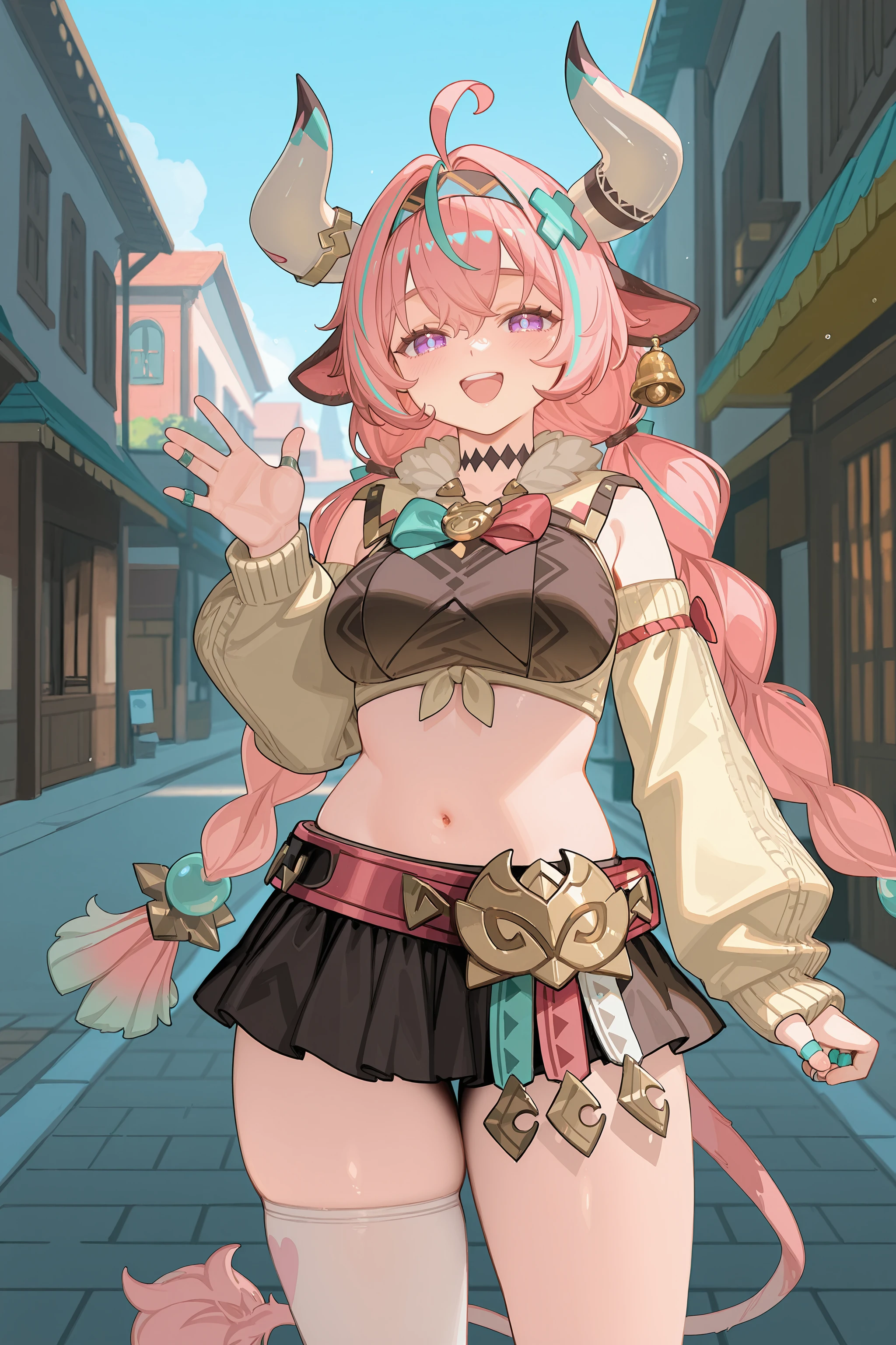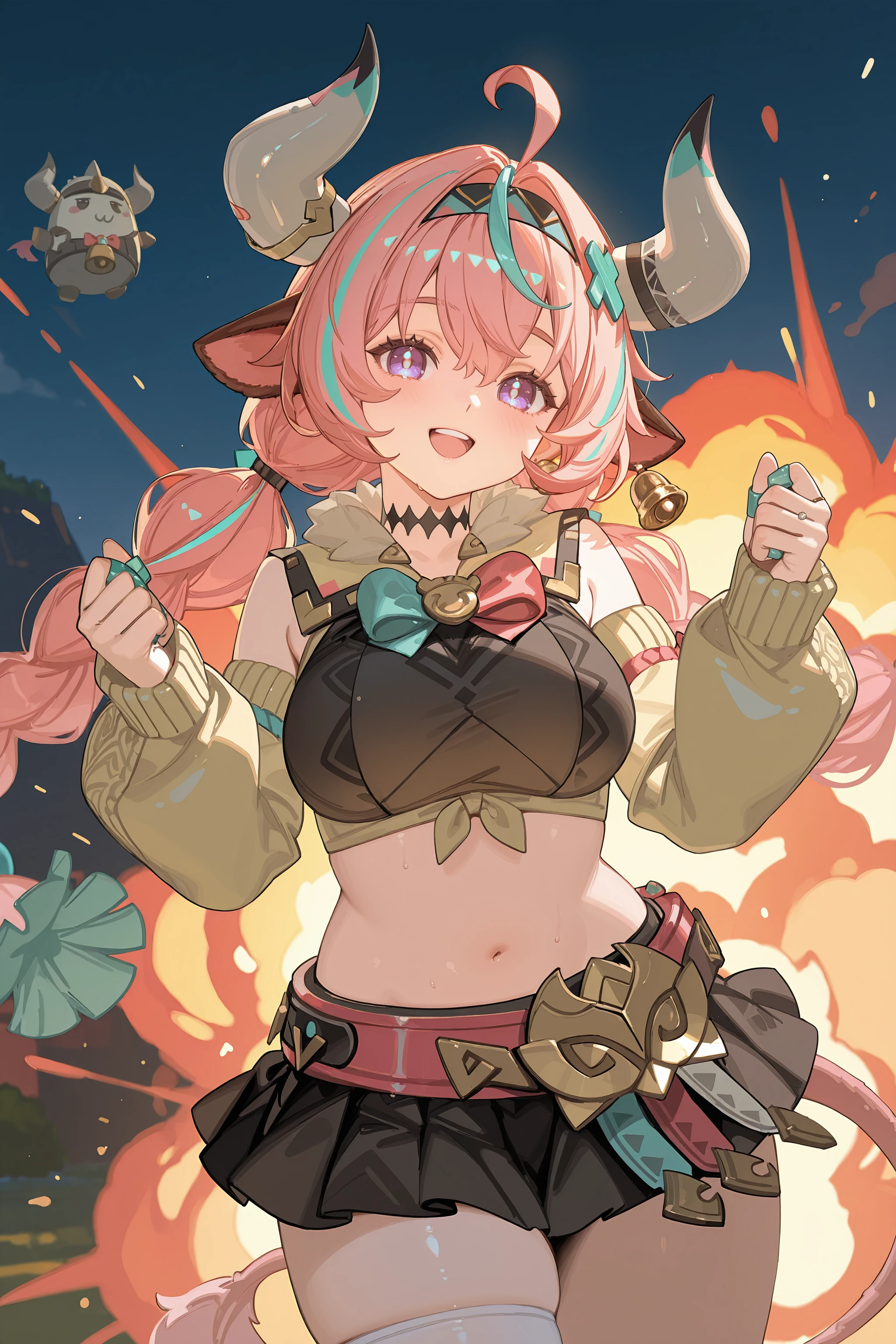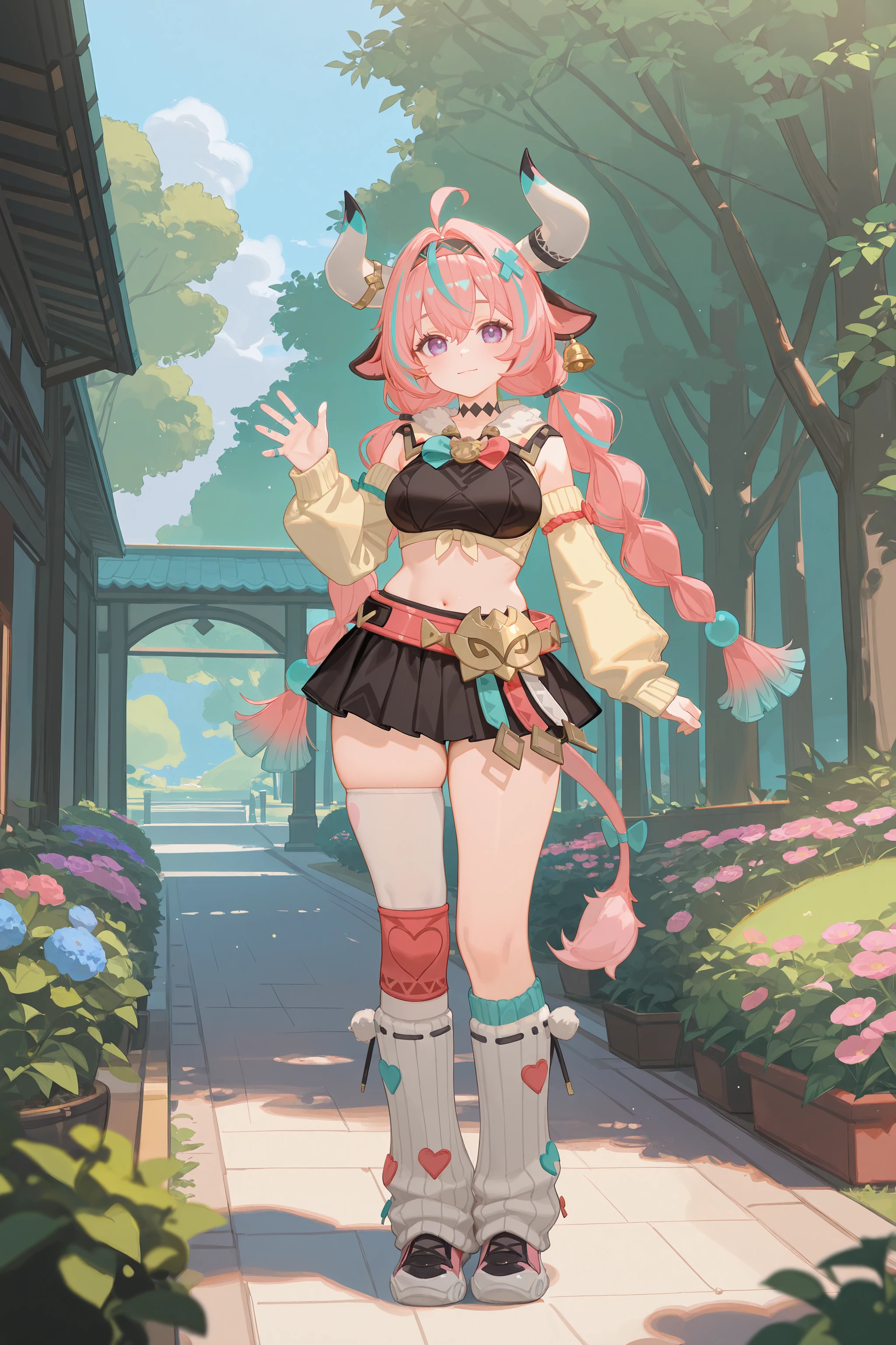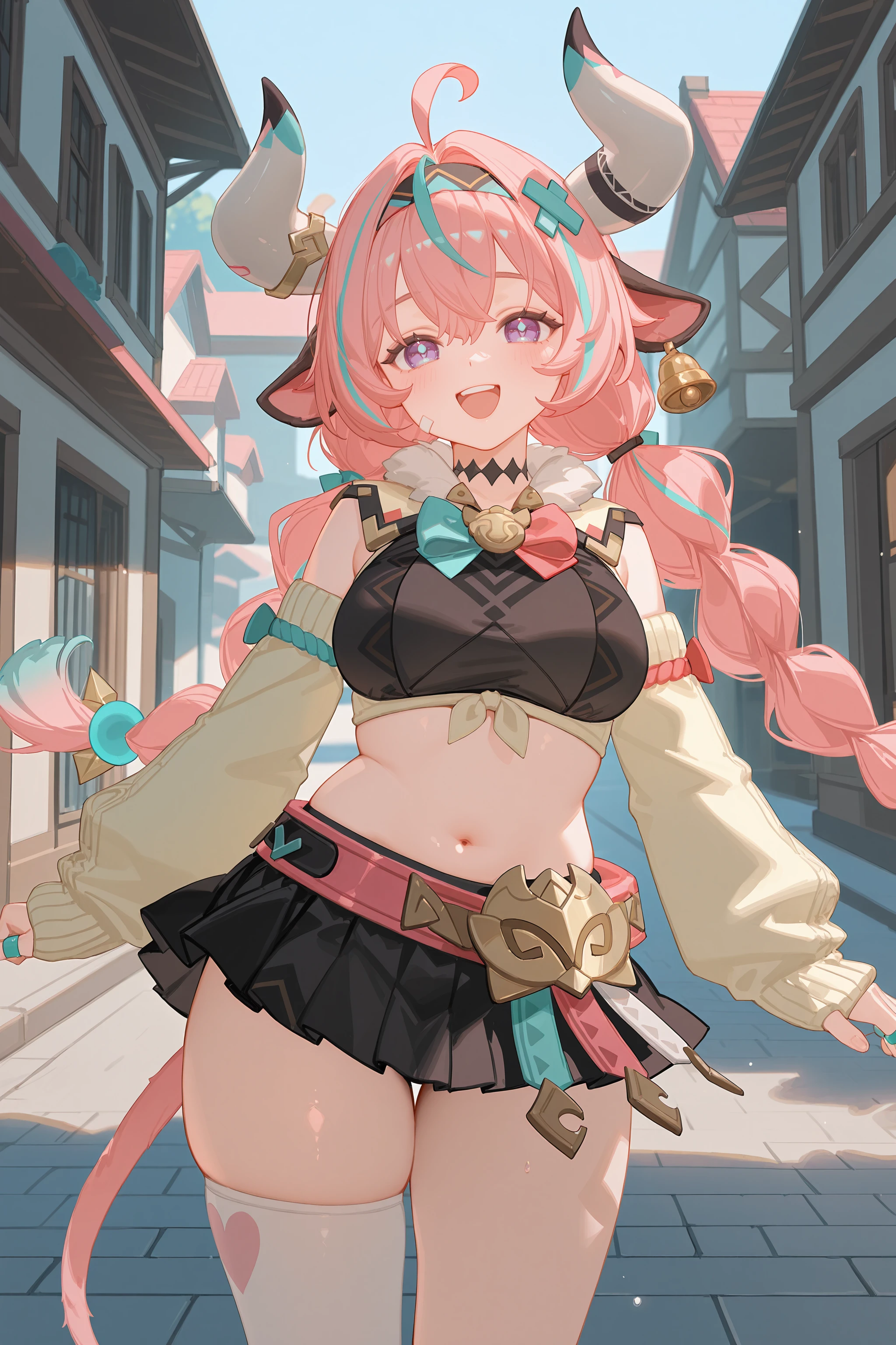 Additional prompts for her default costume, add/remove as you needed: tail, twin braids, hair ornament, x hairclip, hairband, bell earrings, black choker, crop top, detached sleeves, multiple rings, black miniskirt, single thighhigh, bandaid, leg warmers, sneakers