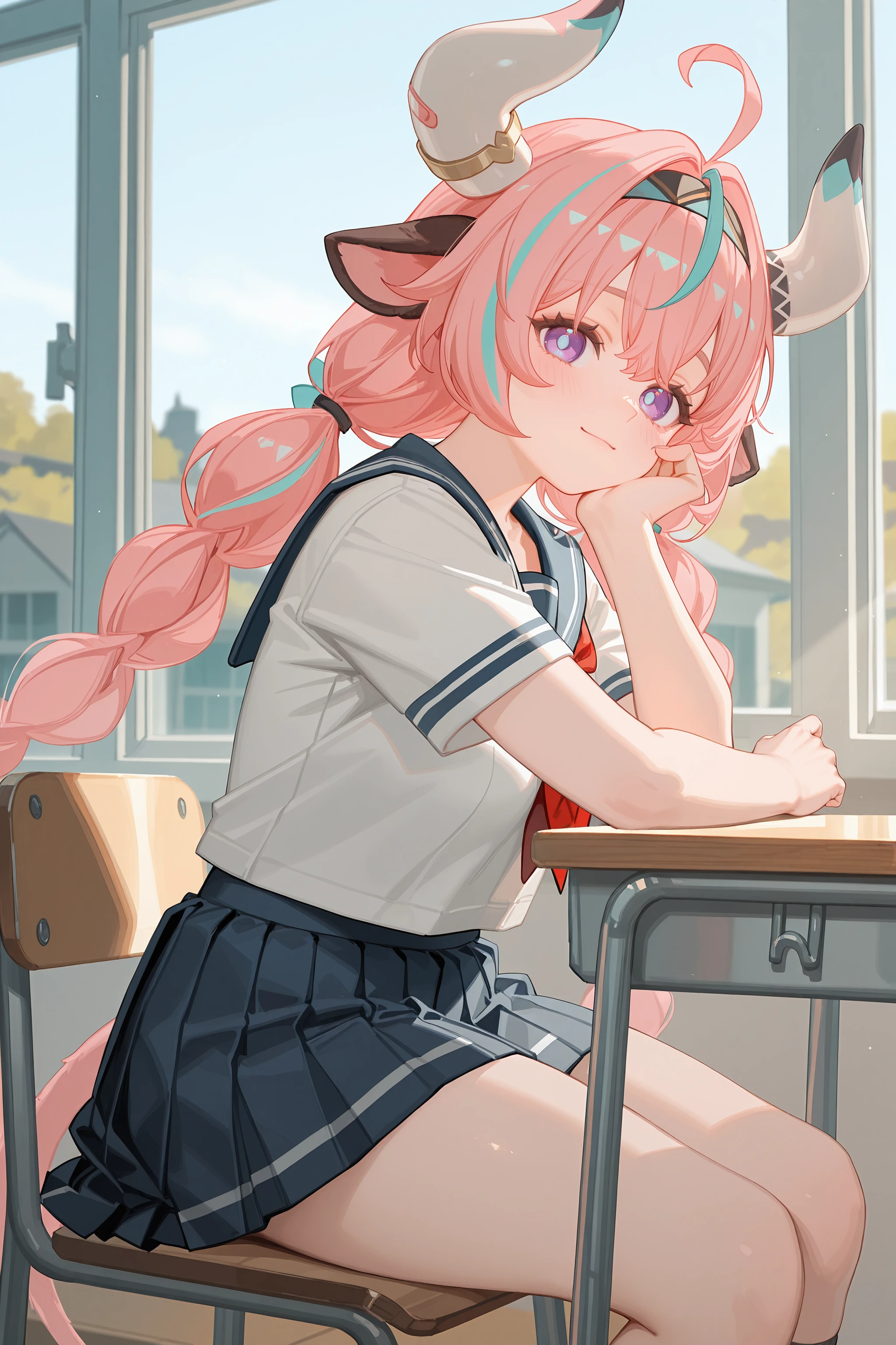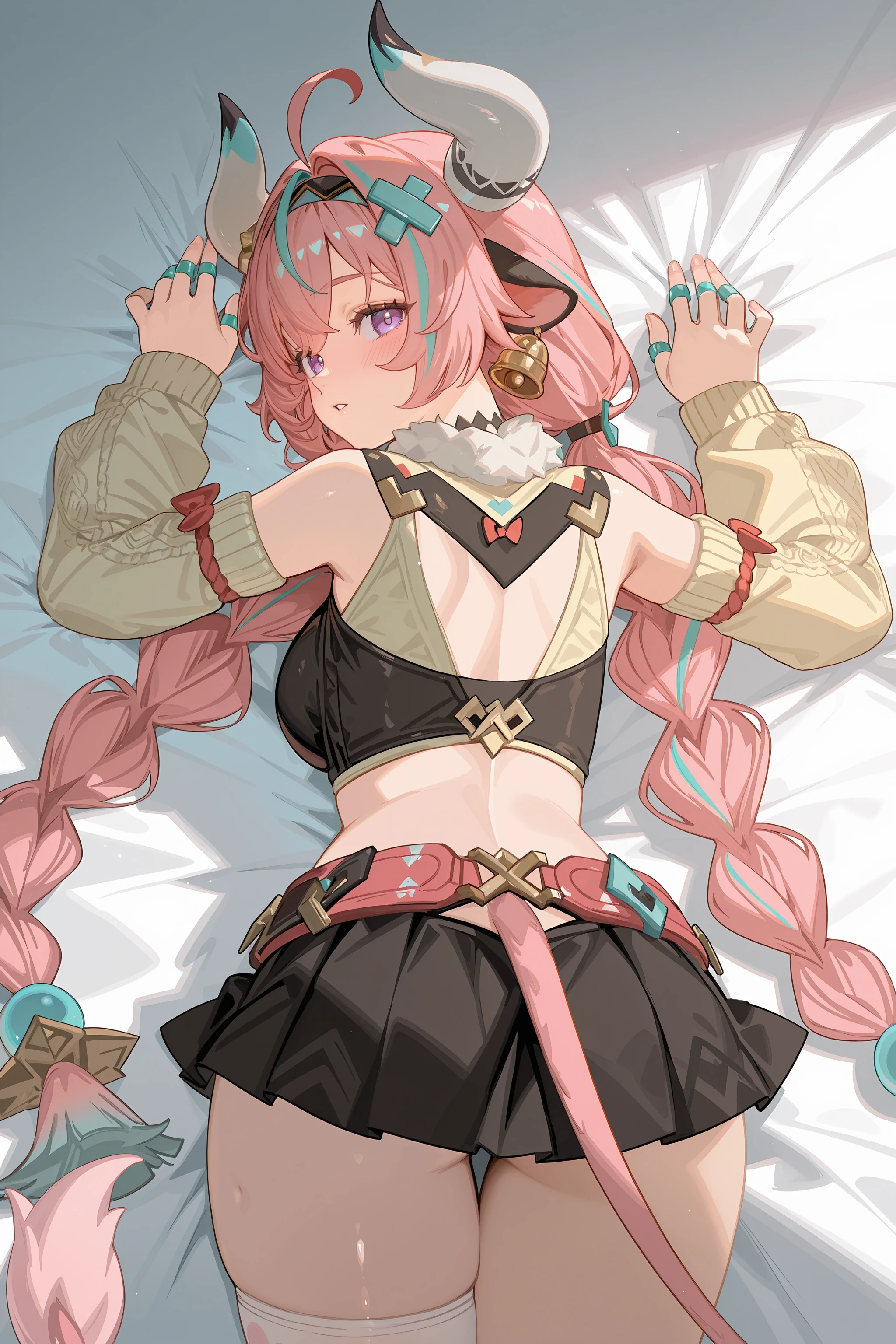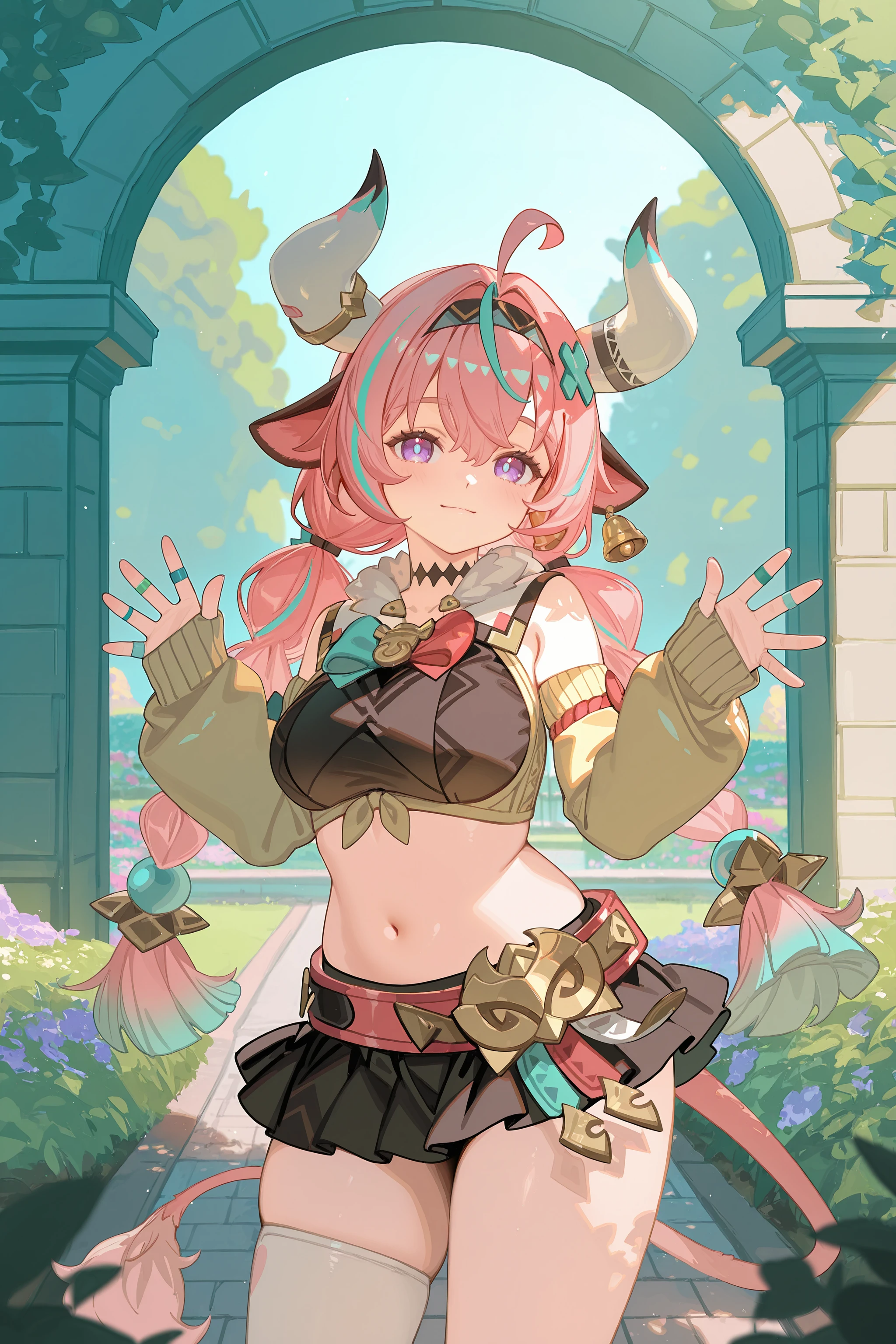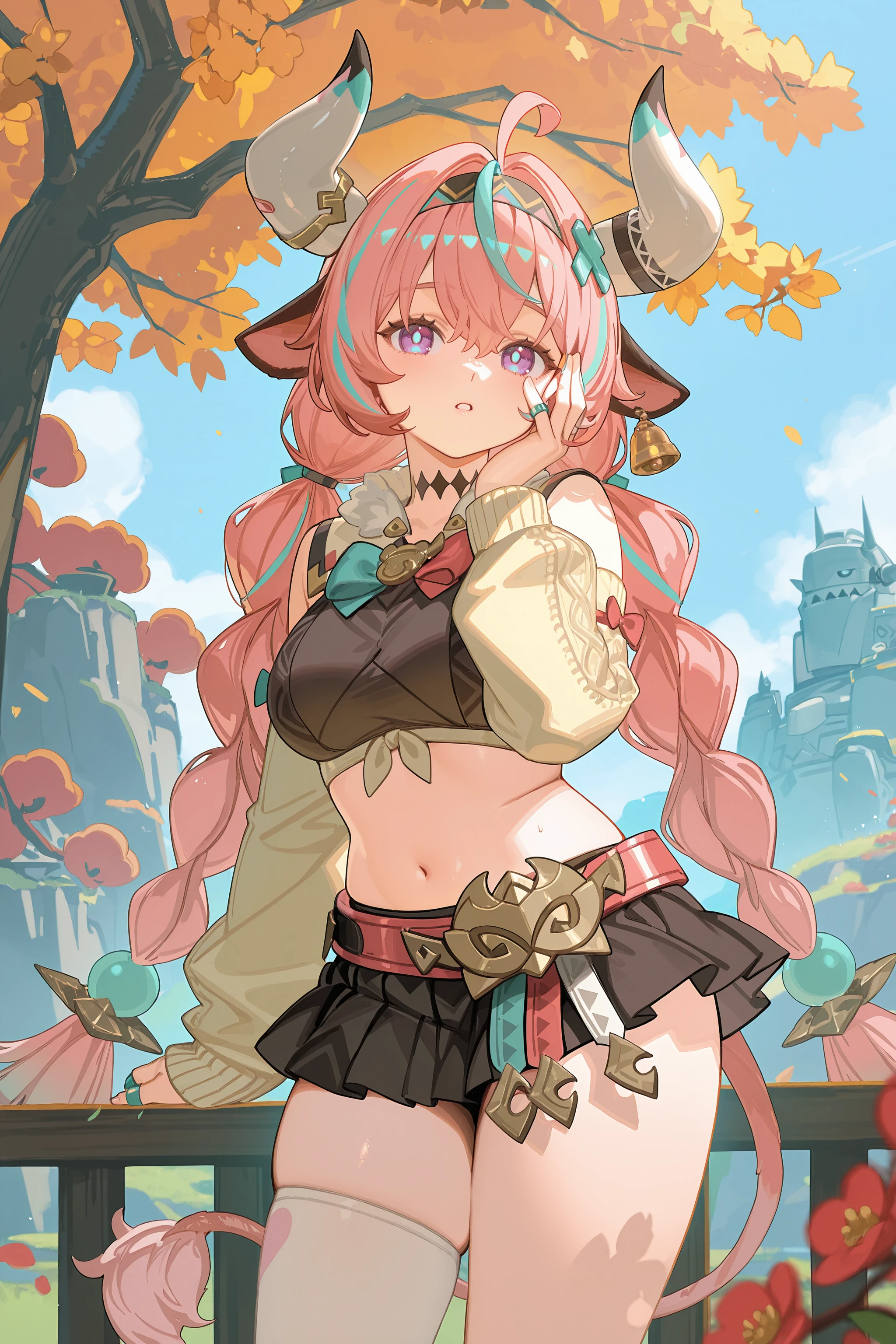 Additional prompts for her default costume, add/remove as you needed: tail, twin braids, hair ornament, x hairclip, hairband, bell earrings, black choker, crop top, detached sleeves, multiple rings, black miniskirt, single thighhigh, bandaid, leg warmers, sneakers