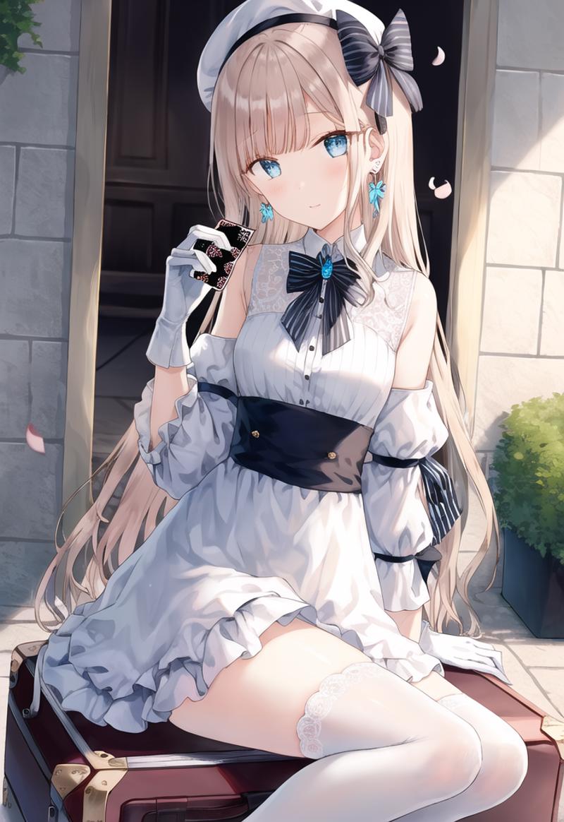 比如这张坐在行李上的洋装女孩,使用 alpha 值较低的模型出图,女孩不仅手上拿着卡牌,背景也镶上了一层卡面: