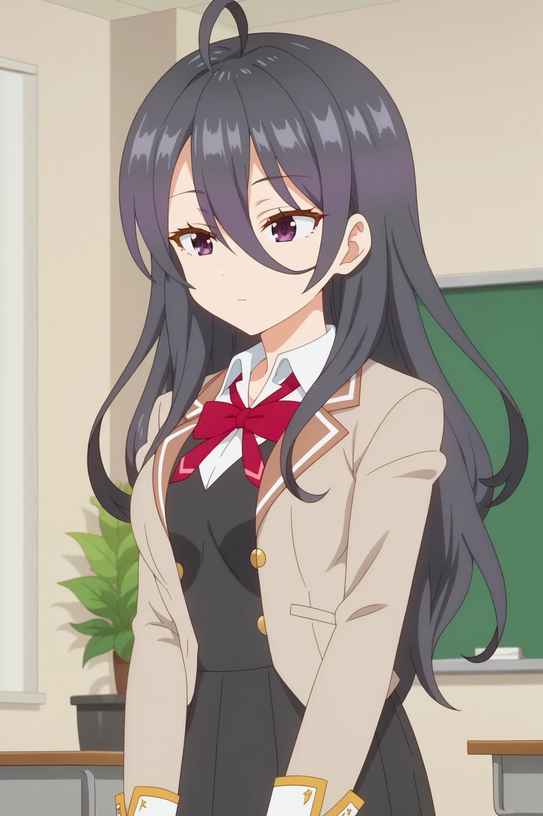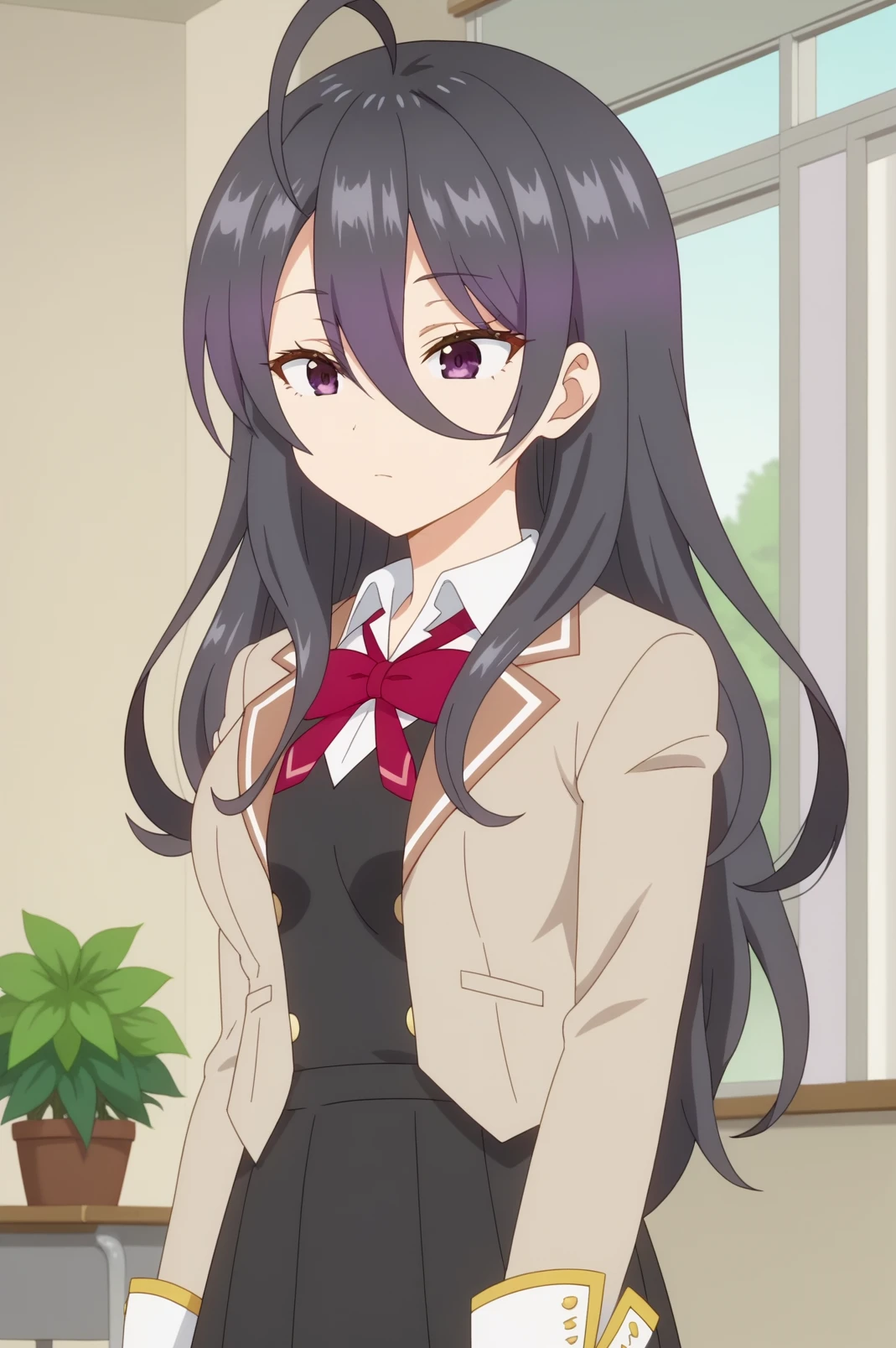 long hair,shirt,school uniform,jacket,solo,bow,ahoge,hair between eyes