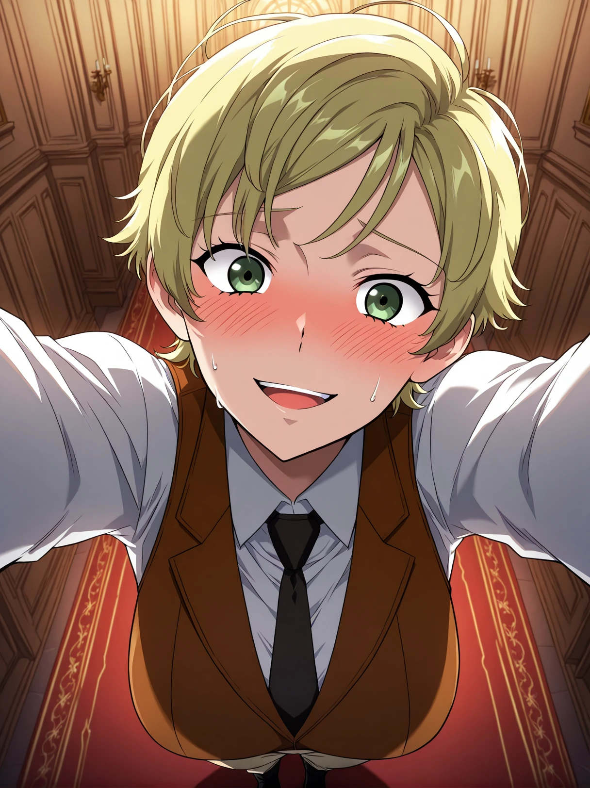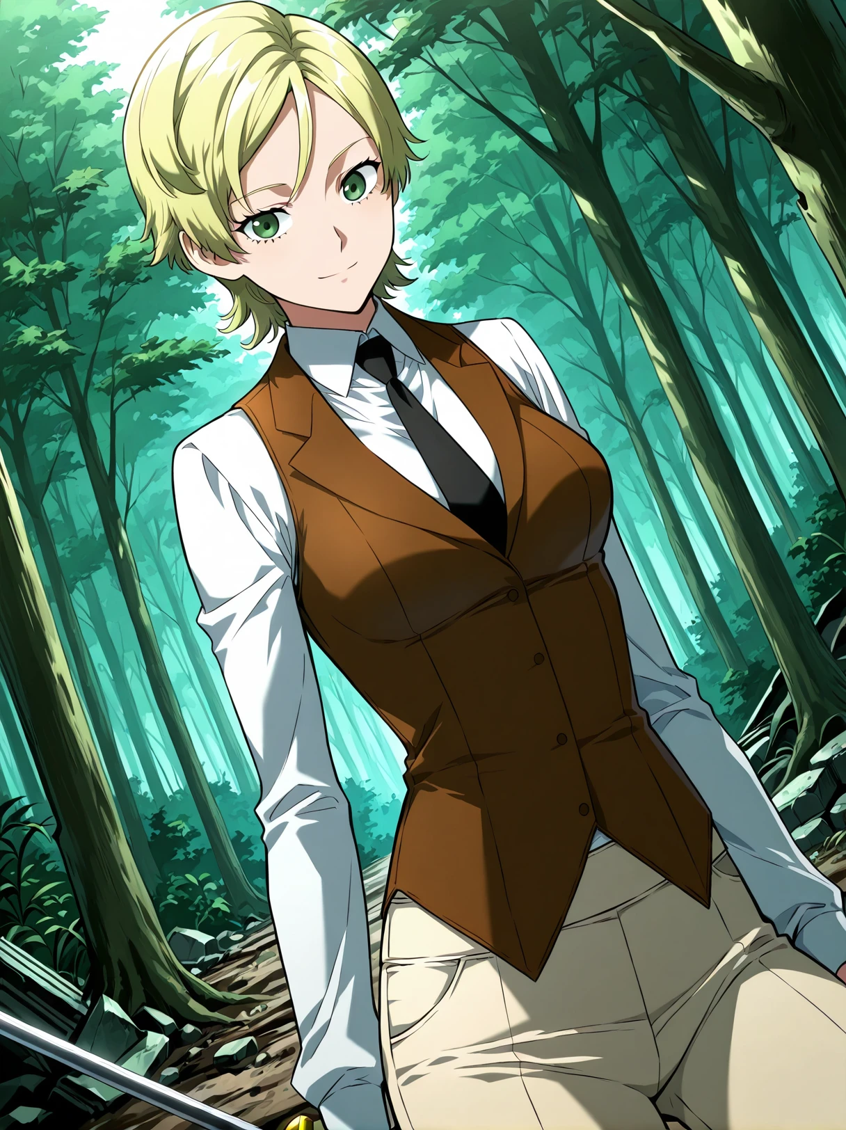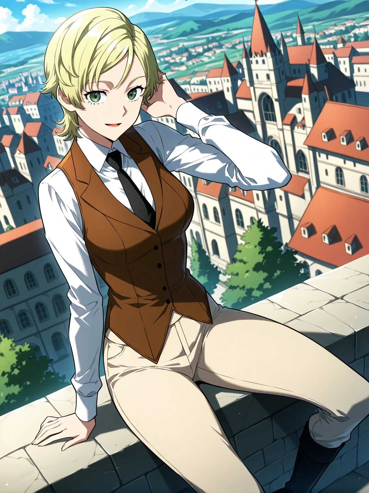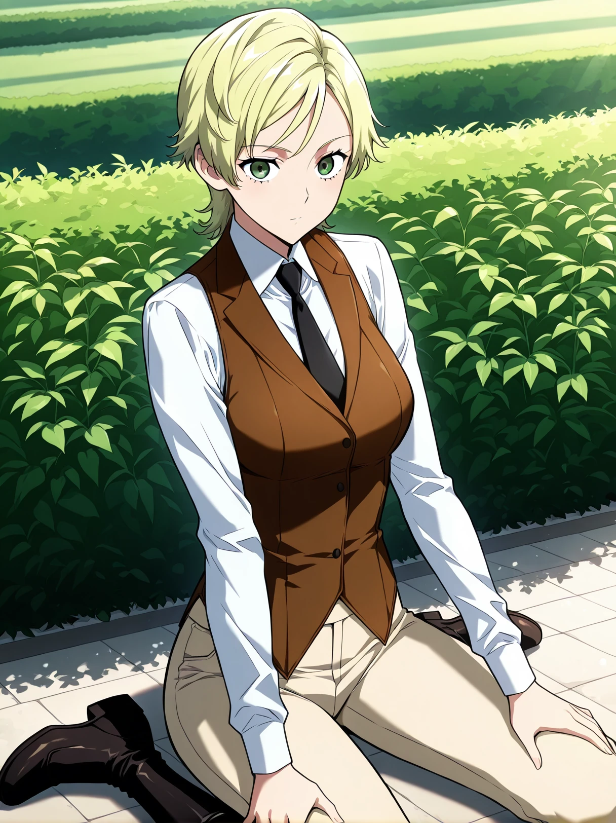 formal vest, brown vest, white shirt, long sleeves, black necktie, tight necktie, beige pants, tight pants, black boots,