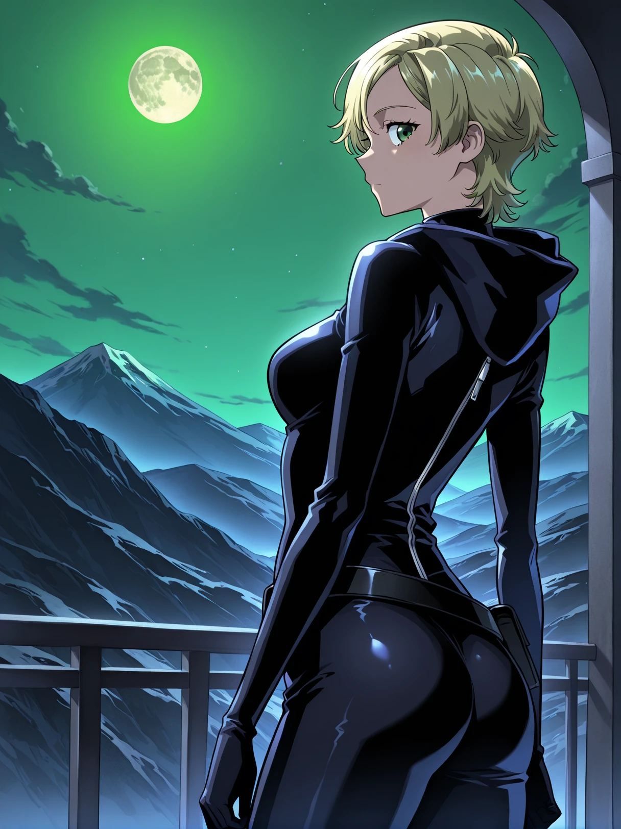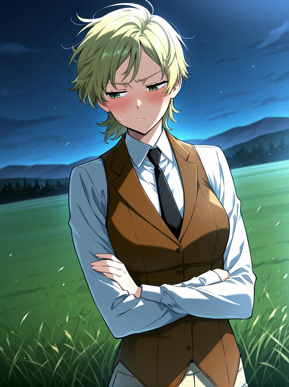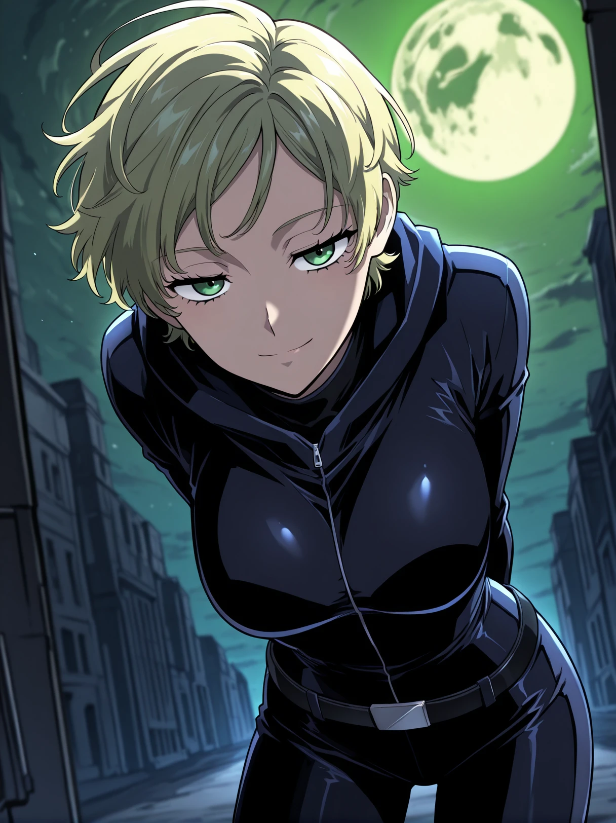 1 girl, solo, short blonde hair, messy hair, side bangs, green eyes,