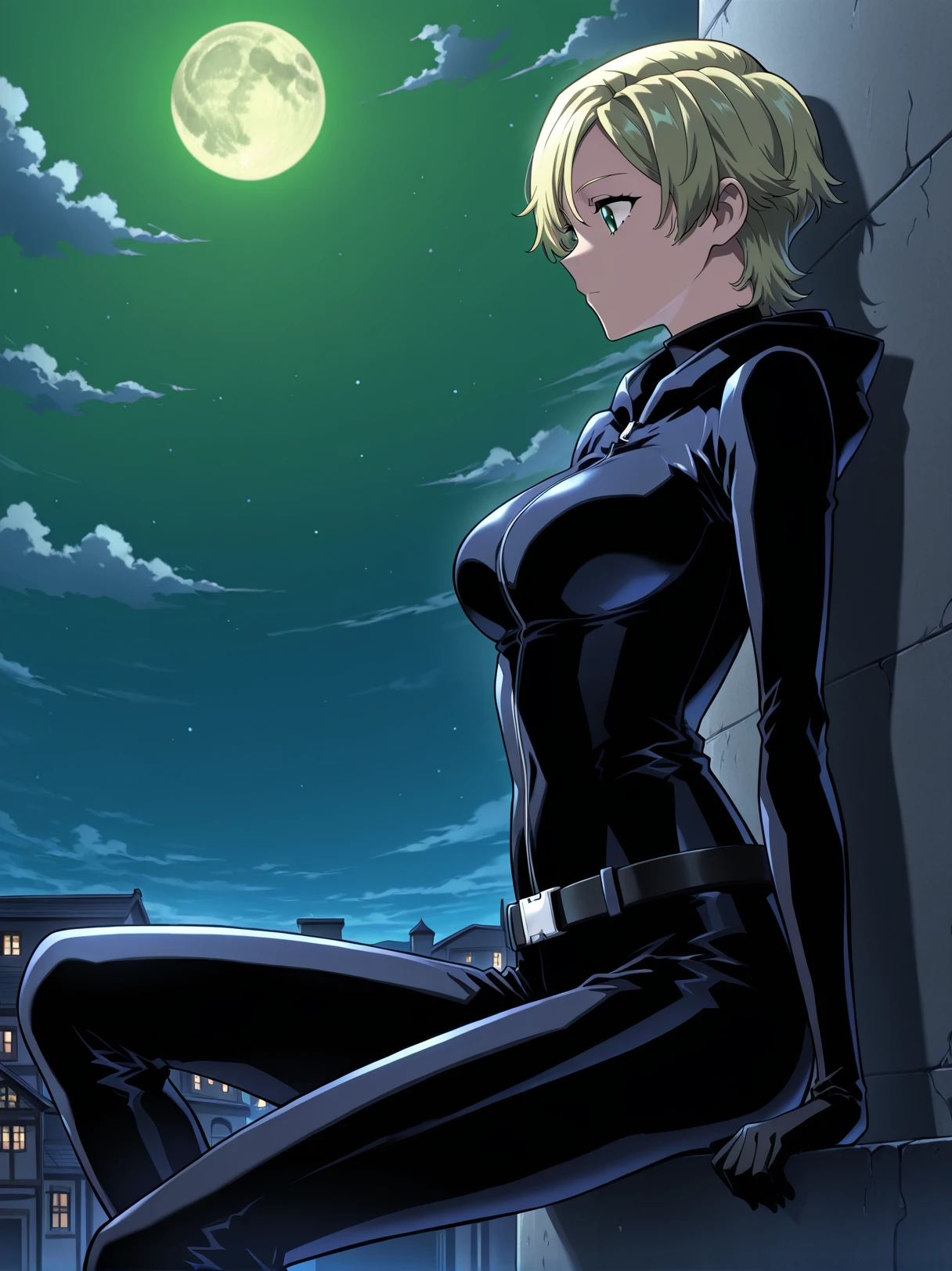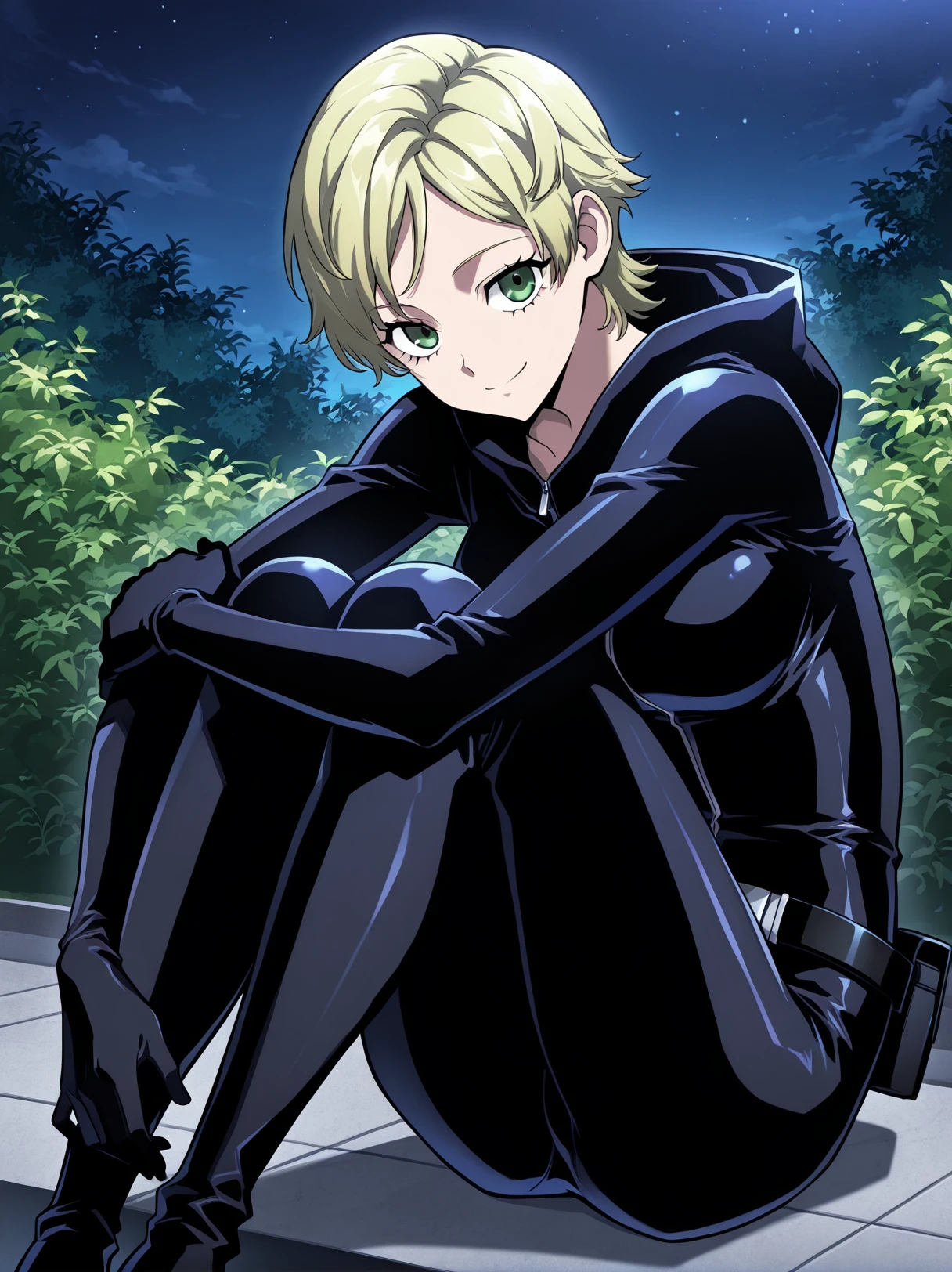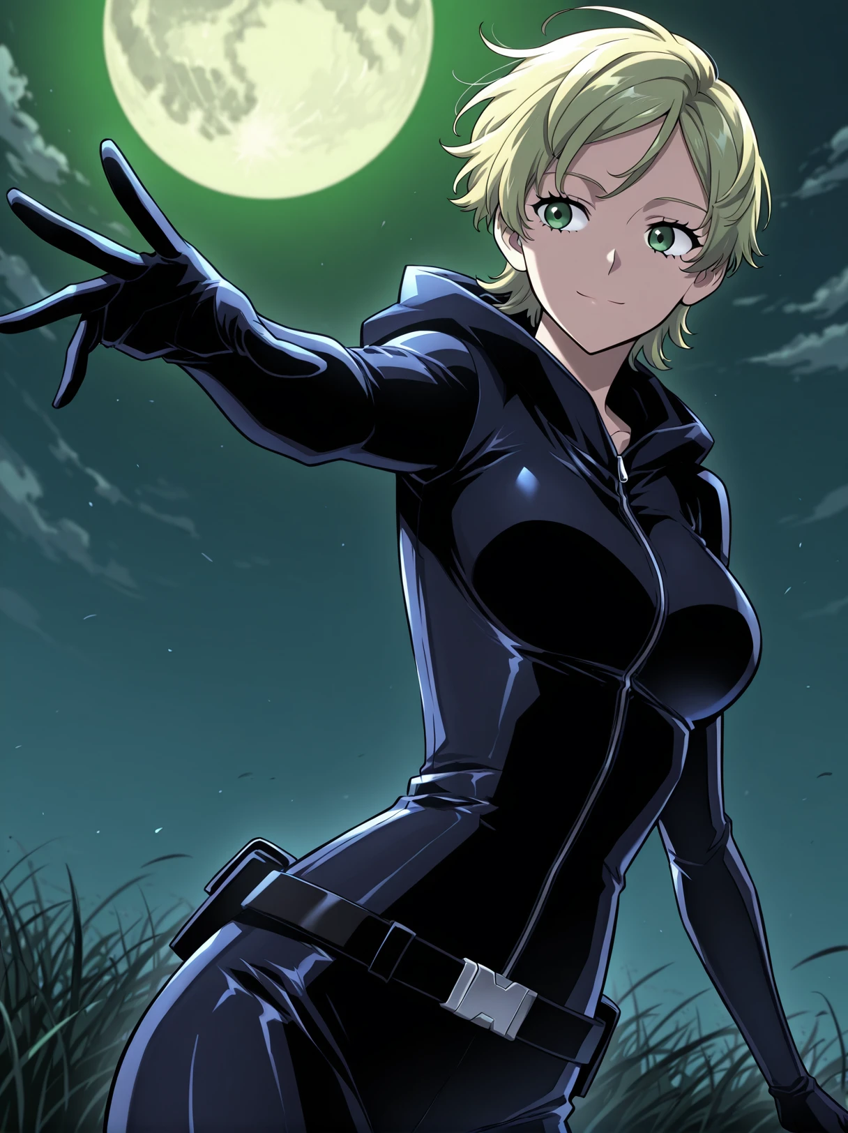 black bodysuit, zipper front, skin-tight outfit, black gloves, black belt, stealth suit,