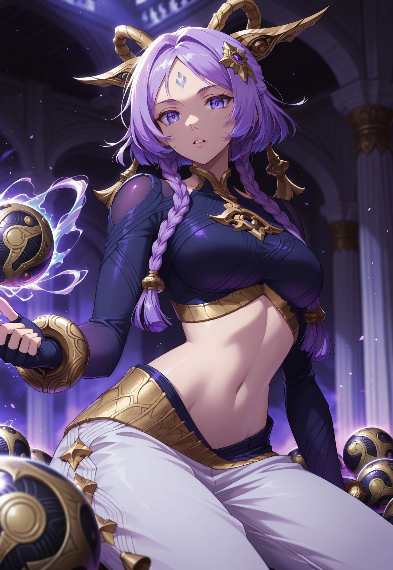 DFyunara, short hair, violet hair, hair ornament, twin braids, braided hair, forehead mark, purple eyes, crop top, navel, loose pants, bracelet, fingerless gloves, magic ball,