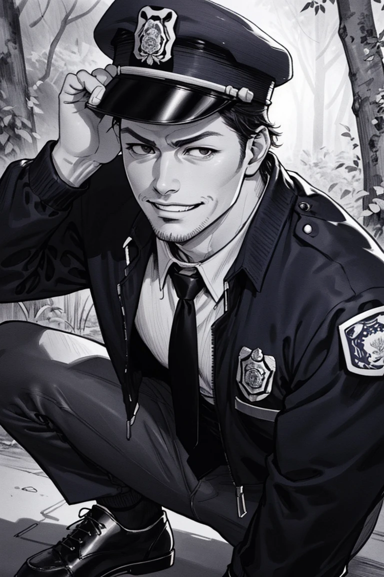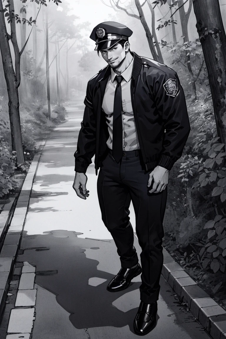 Prompt: black hair, short hair, thin stubble, black eyes, policeman, white collared shirt, dark blue necktie, black jacket, long sleeves, black sleeves, (buttoned up jacket), dark blue pants, black shoes, police peaked cap, greyscale, monochrome, (manga brushwork style, traditional drawing)