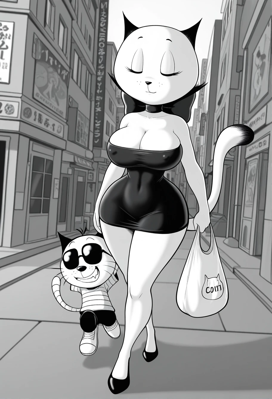 MotherPuss, 1girl, furry female, cat girl, animal ears, cat ears, freckles, large breasts, tail, short dress, strapless, cleavage, covered nipples, bow,