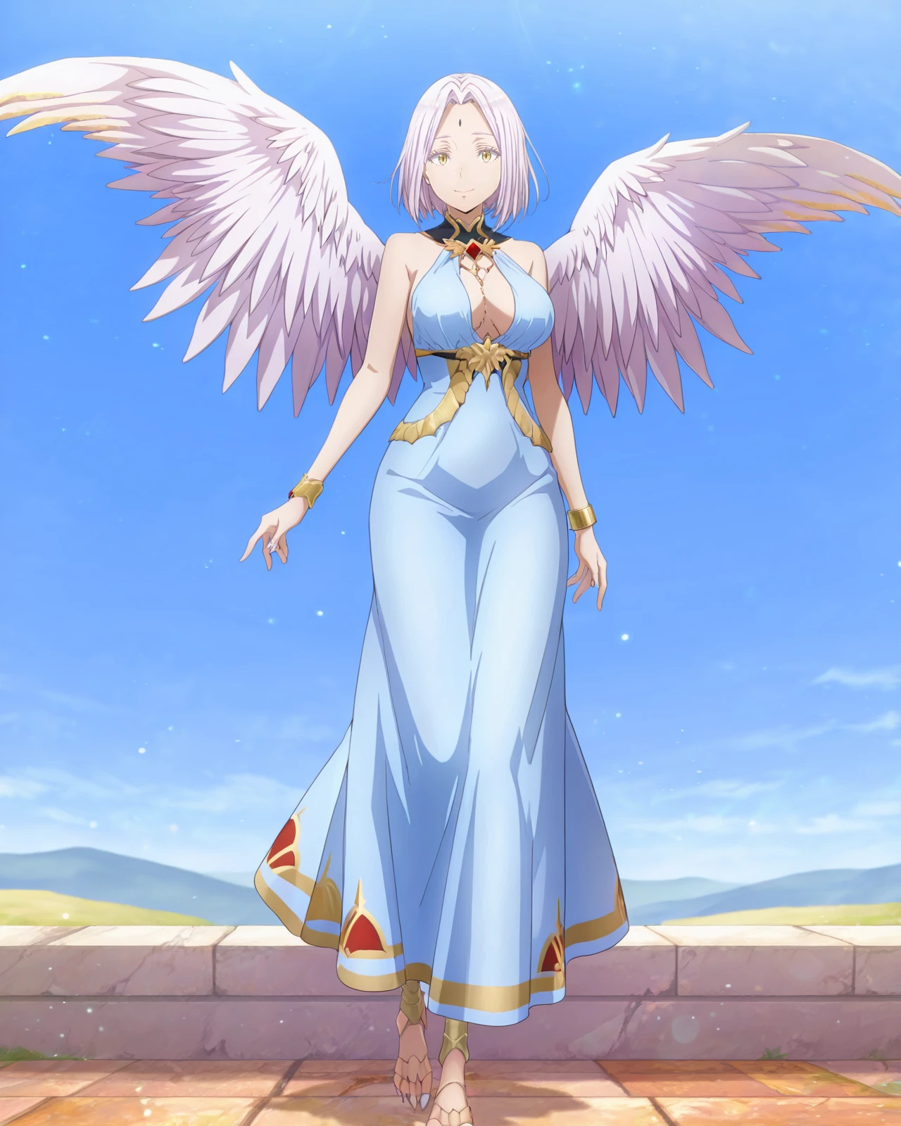 Frey (Tensei Shitara Slime Datta Ken), 1girl, wings, dress, solo, yellow eyes, feathered wings, blue dress, short hair, angel wings, white wings, bracelet, white hair, smile, jewelry, Wings of the Night Banquet