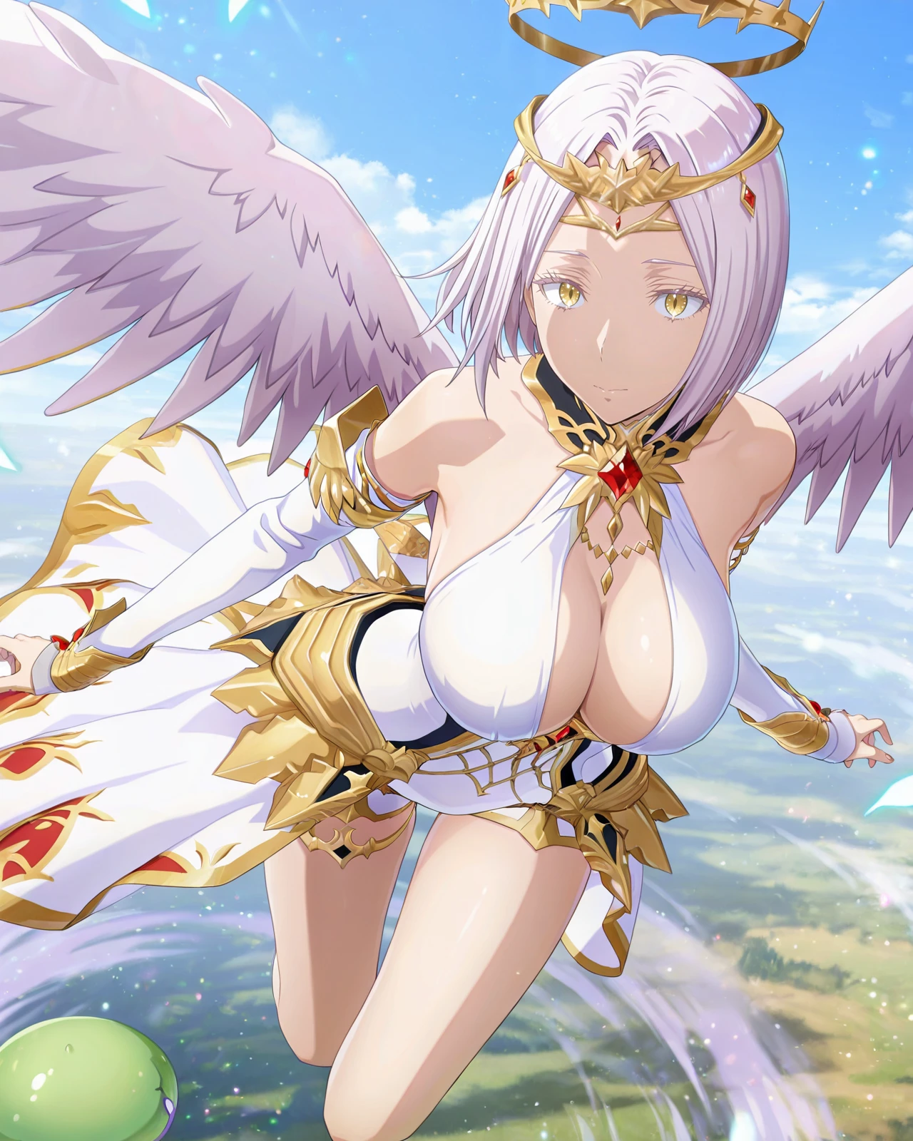 Frey (Tensei Shitara Slime Datta Ken), 1girl, solo, short hair, angel wings, yellow eyes, large breasts, white hair, white wings, dress, cleavage, gold trim, detached sleeves, bare shoulders, Angelic Entertainer