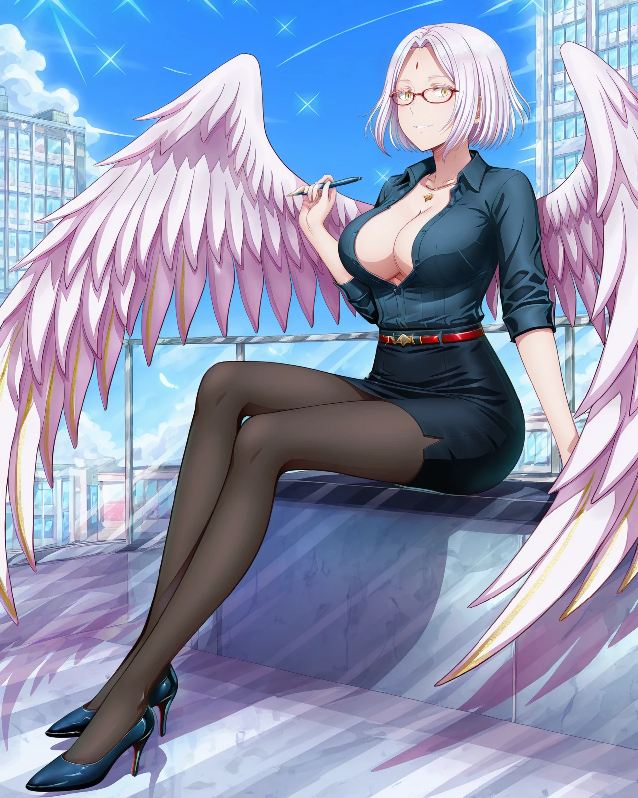 Frey (Tensei Shitara Slime Datta Ken), 1girl, yellow eyes, solo, pantyhose, high heels, cleavage, ?????????????, feathered wings, jewelry, belt, blue footwear, shirt, pencil skirt, red-framed eyewear, necklace, forehead mark, white hair, blue skirt, smile, Gorgeous Lecturer,