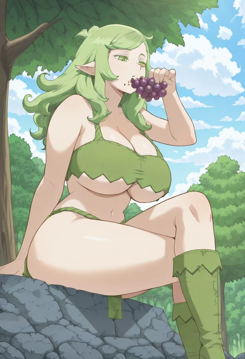 EOEROELF,pointy ears,Green eyes, green leaf bra, gren LEAF loincloth, Grean leaf boots, big breast, wide hips, curly green hair, hourglass figure, tall women,