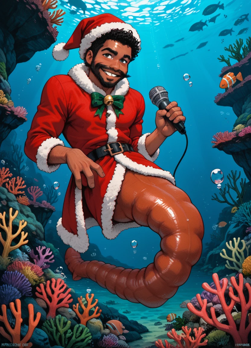 mr wiggles, merman, monster boy, black hair, short hair, dark skin, dark-skinned male, very dark skin, facial hair, mustache, beard, buck teeth,