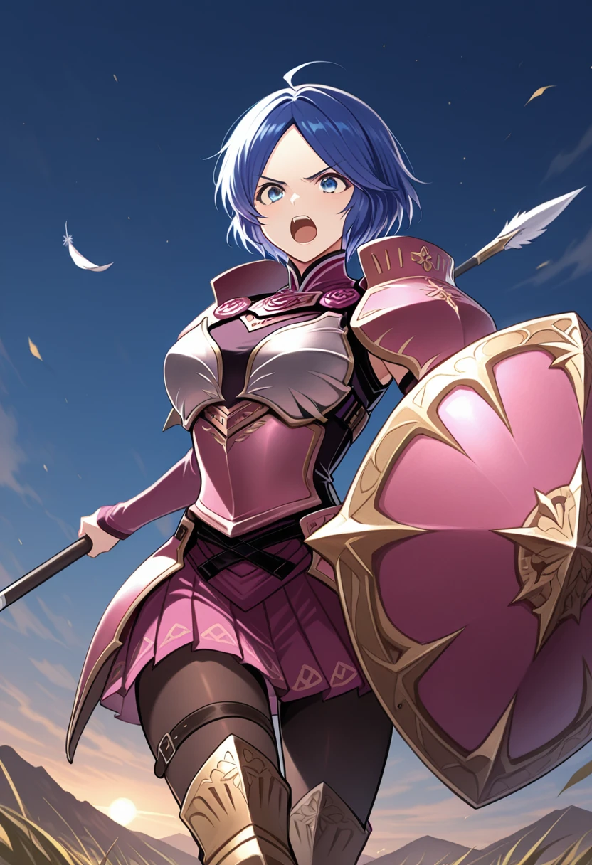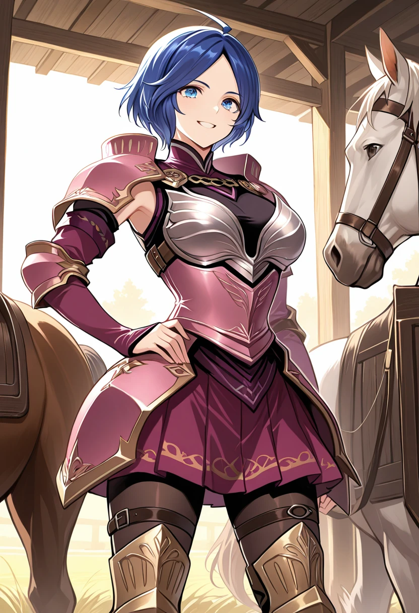 Trigger Words (Cipher Outfit): MidiaCipher, ahoge, pink armor, gold trim, pink turtleneck, large shoulder armor, winged breastplate, white winged breastplate, black shirt, stomach armor, detached sleeves, pink sleeves, sleeves over wrists, pink skirt, black pantyhose, thigh strap, knee guards, pink boots, armored boots,