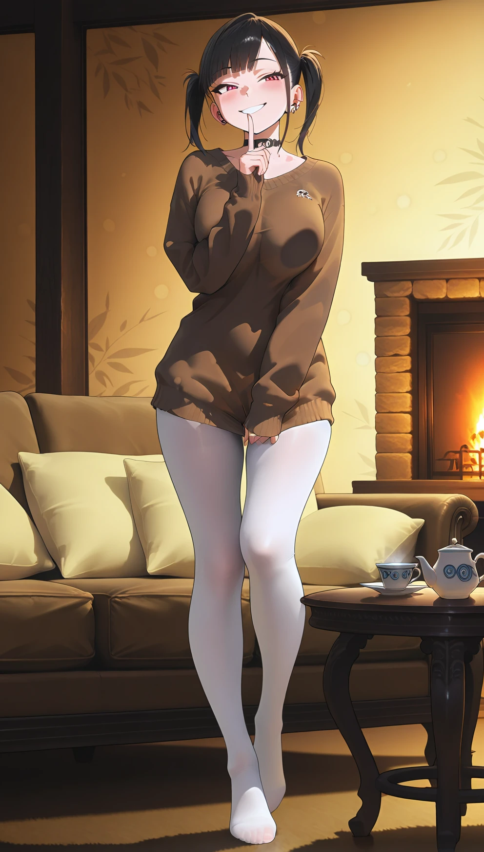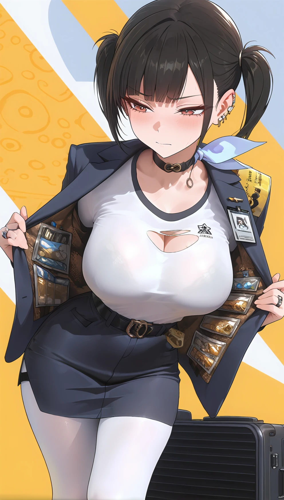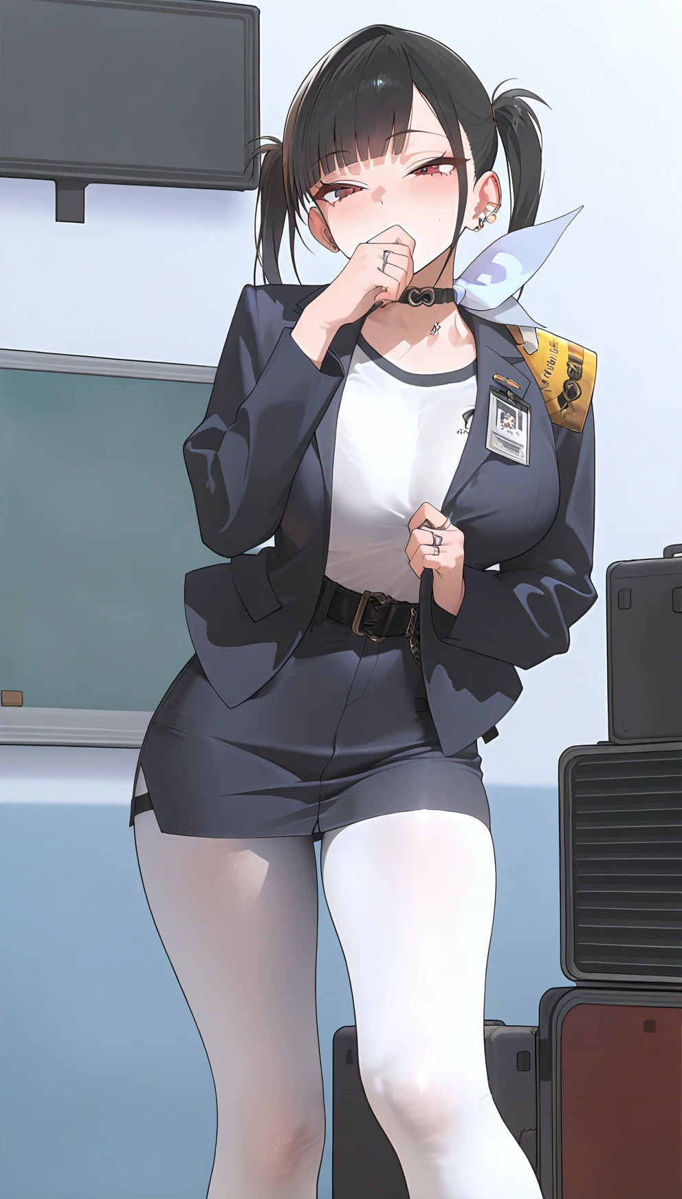 red eyes, bangs, black hair,piercing, twintails, choker, ear piercing, earrings, , skirt , white pantyhose, jacket, white shirt, belt
