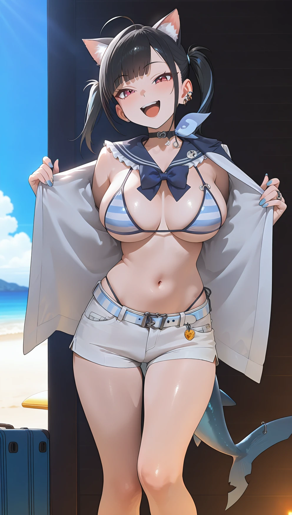 Example prompt : red eyes, bangs, black hair,piercing, twintails, choker, ear piercing, earrings, large breasts, skirt , white pantyhose, jacket, white shirt, belt