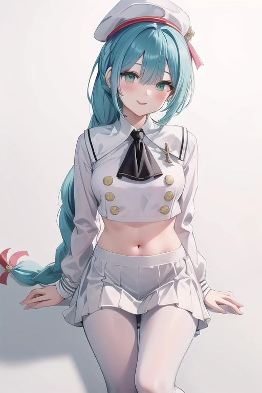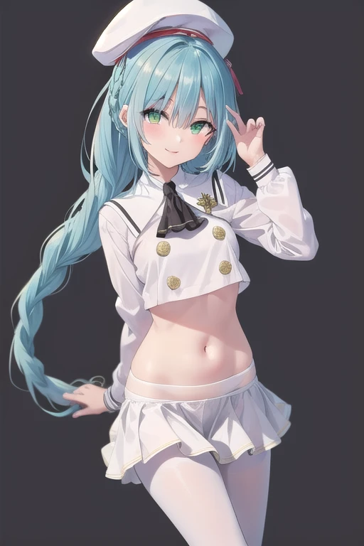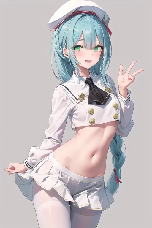 1girl, green eyes, white beret, white miniskirt, braid, very long hair, white pantyhose, one eye closedFAQ