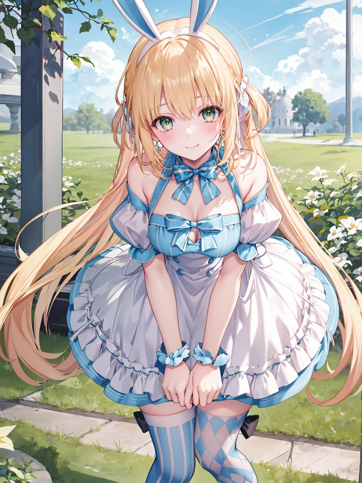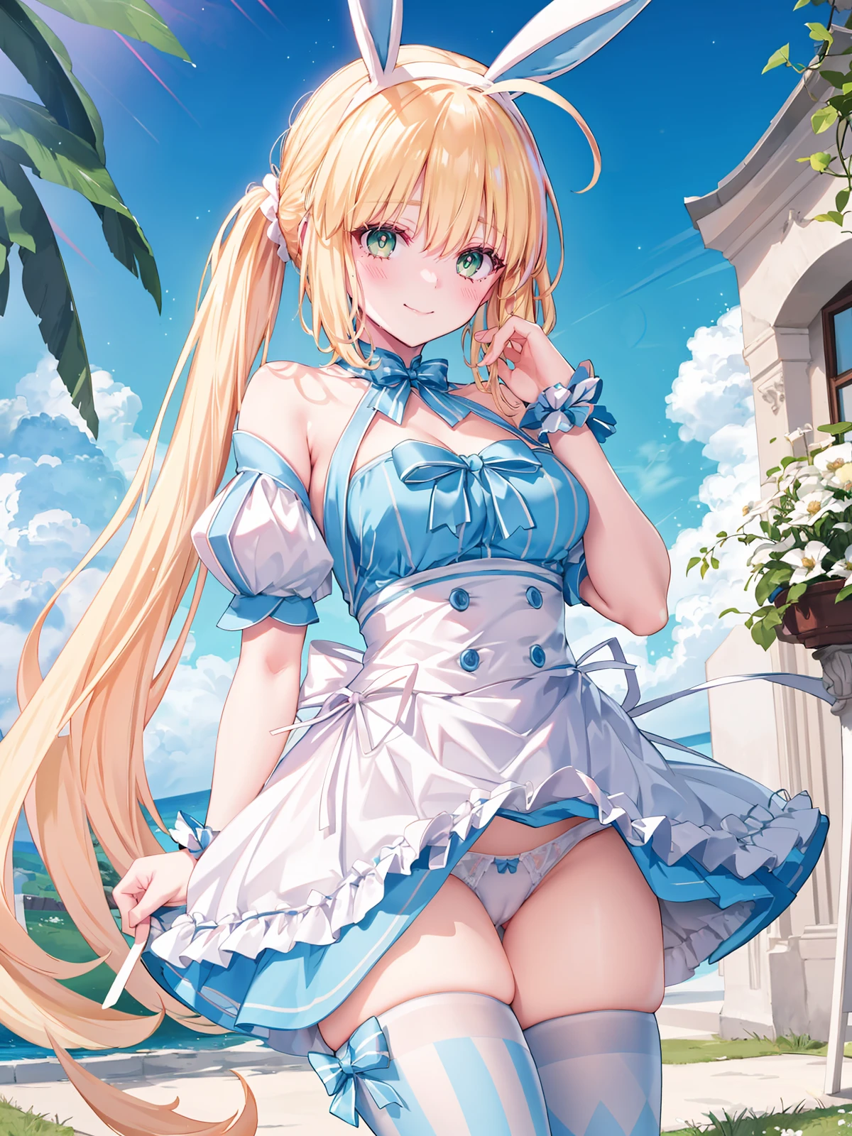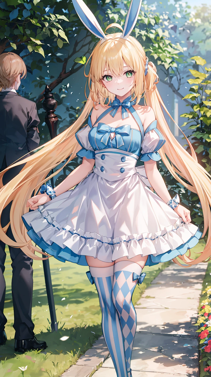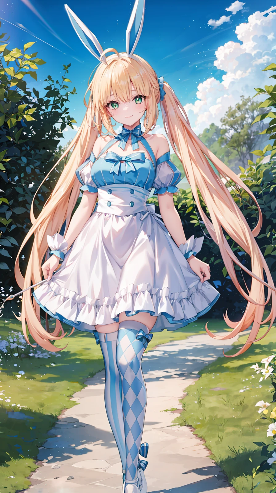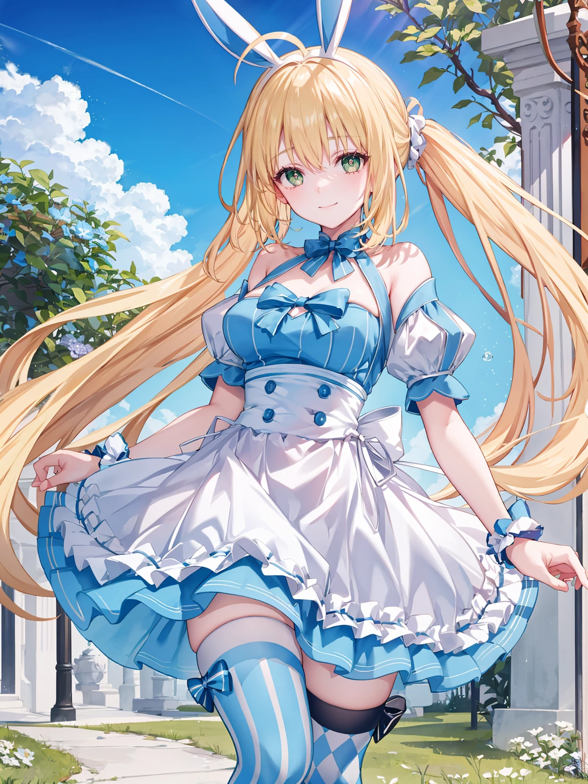 dress, frills, twintails, ahoge, rabbit ears, striped, thighhighs, mismatched legwear, short sleeves, detached sleeves, puffy sleeves, apron, bow, wrist cuffs, white footwear