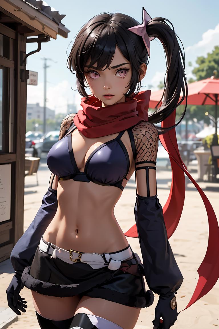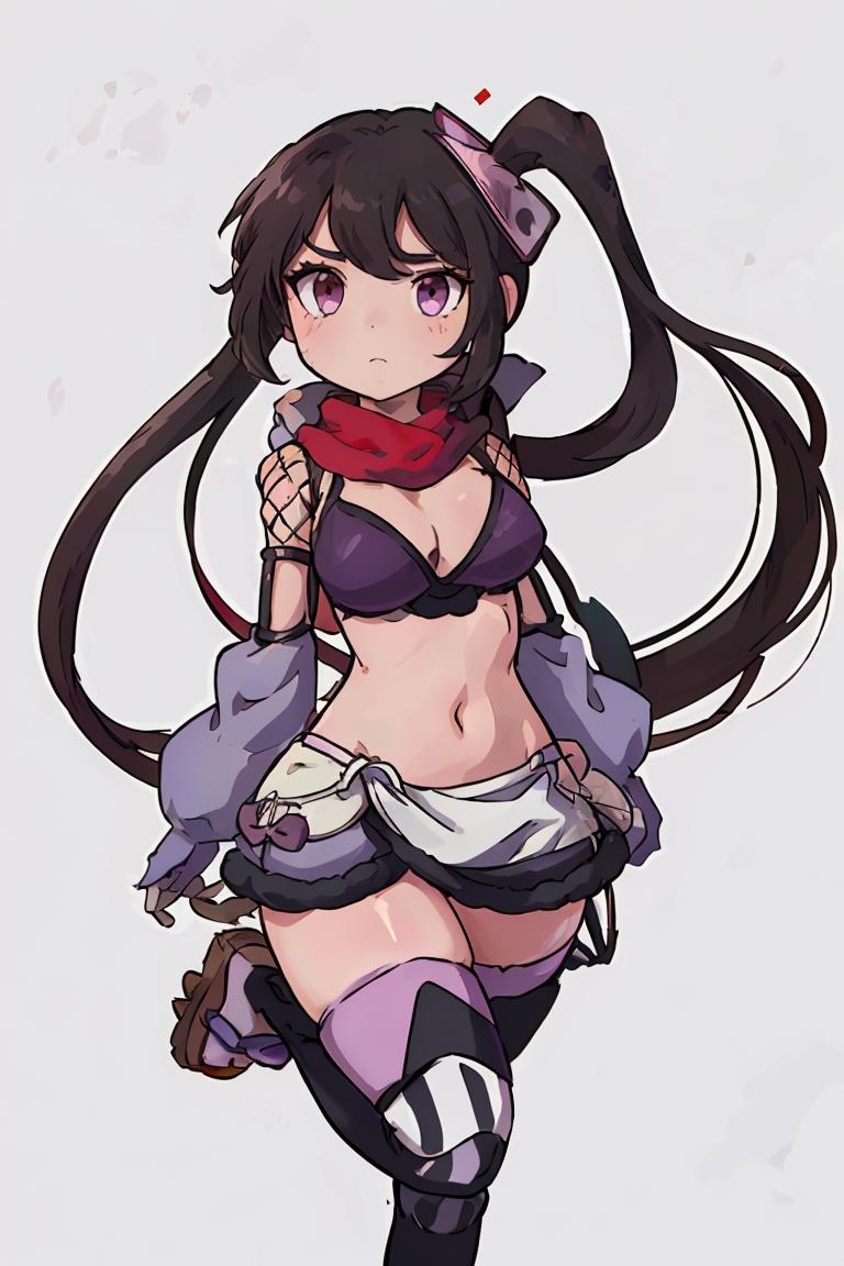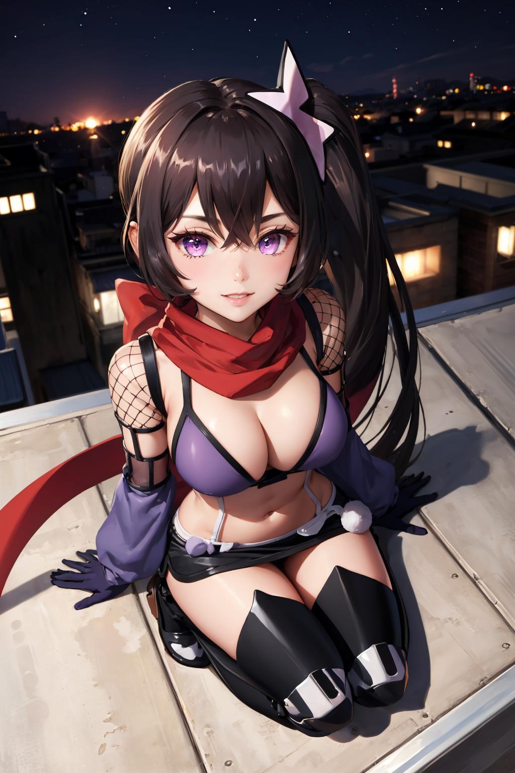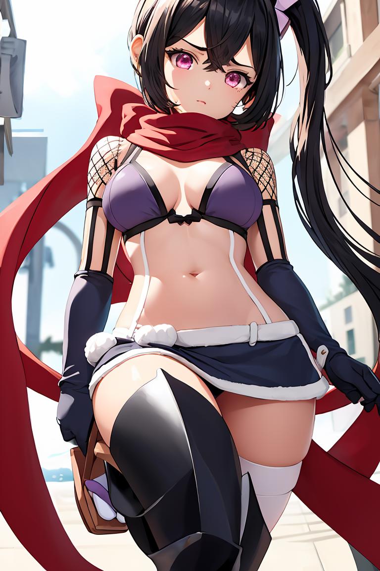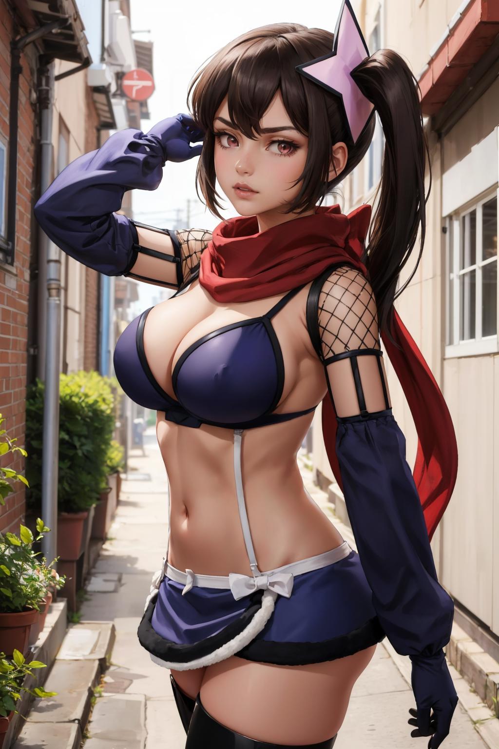 Add "hair ornament, side ponytail, red scarf, bikini top, purple miniskirt, detached sleeves, fishnets, gloves, thighhighs" for her typical look.